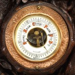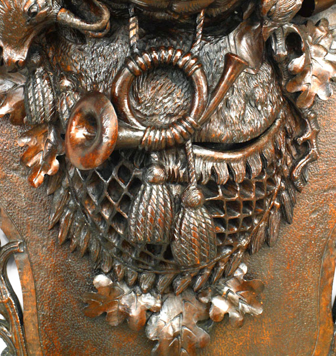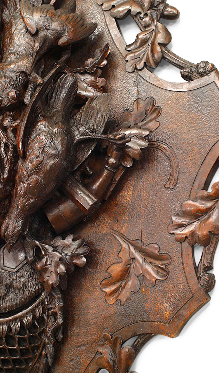 Rustic Black Forest (19th Century) walnut wall mounted thermometer/ barometer with strap-work cartouche hung with an elaborate carved hunting trophy..
