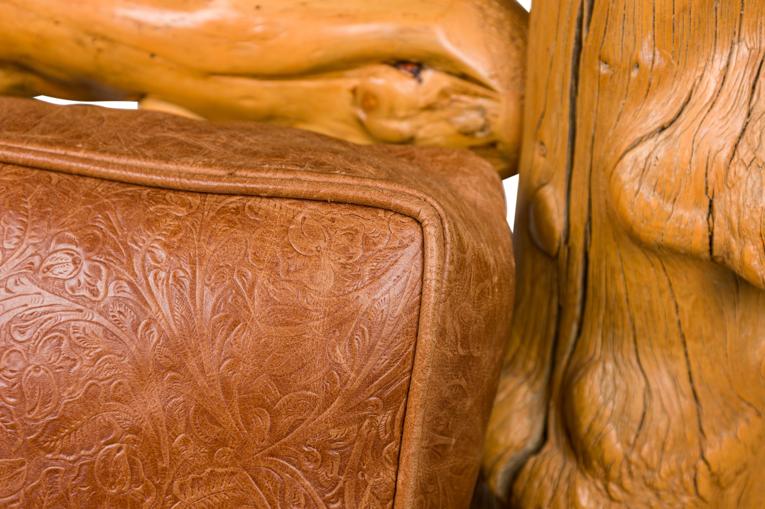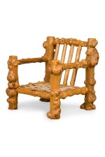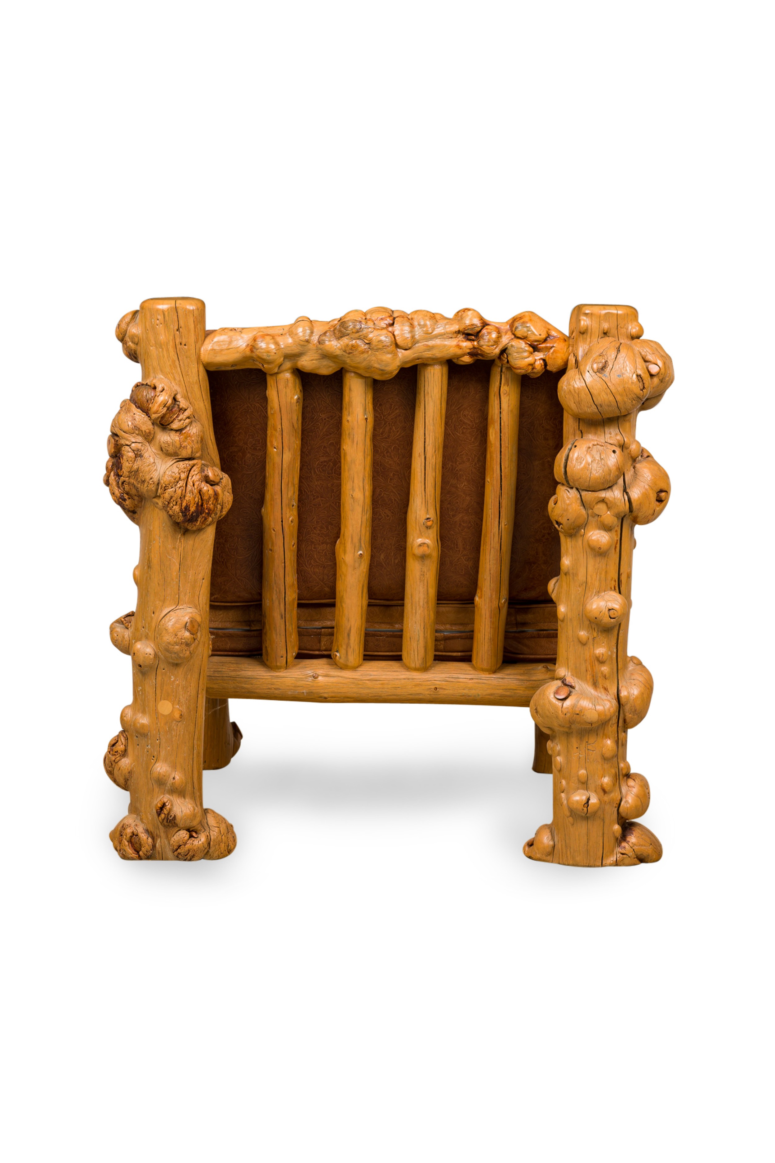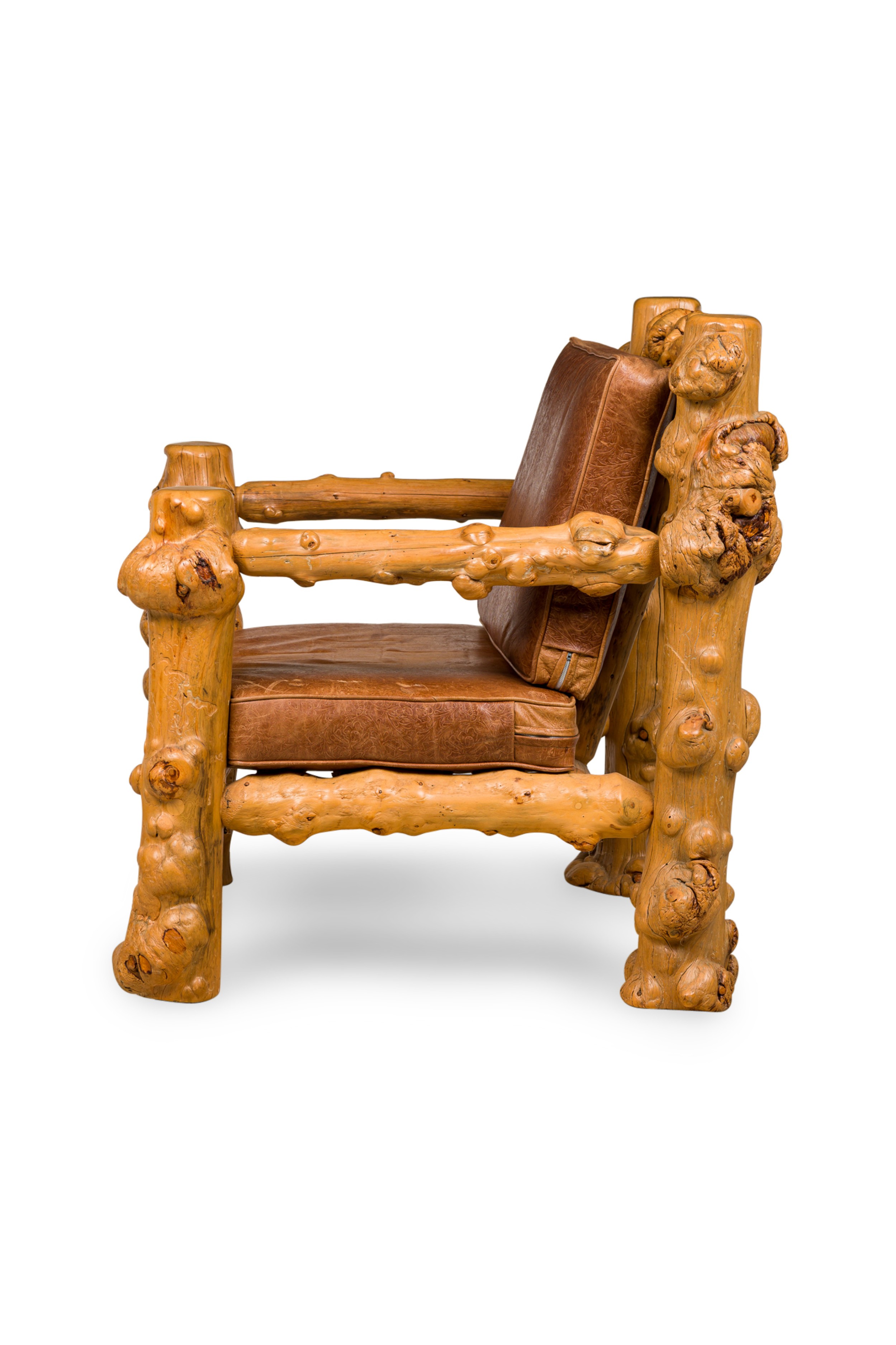 Rustic Blond Root Wood and Embossed Leather Throne Armchair