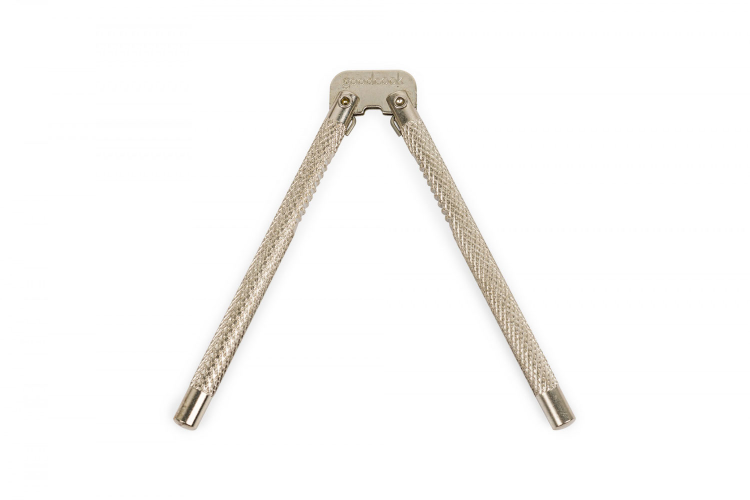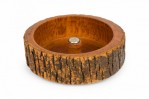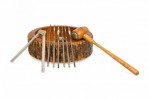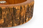 Rustic carved wooden nut cracker bowl with a bark exterior, wooden mallet, and various metal nut picks..
