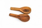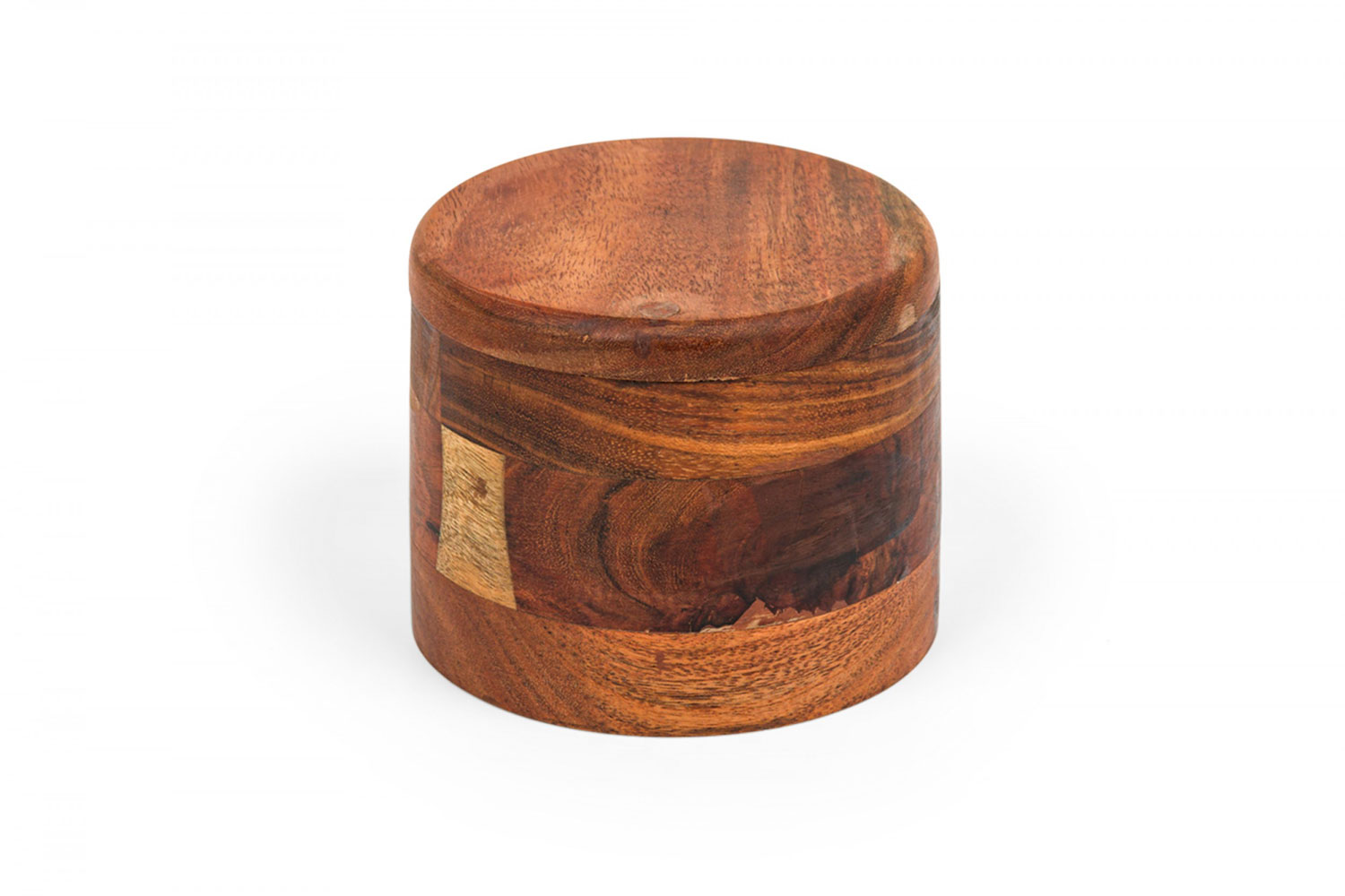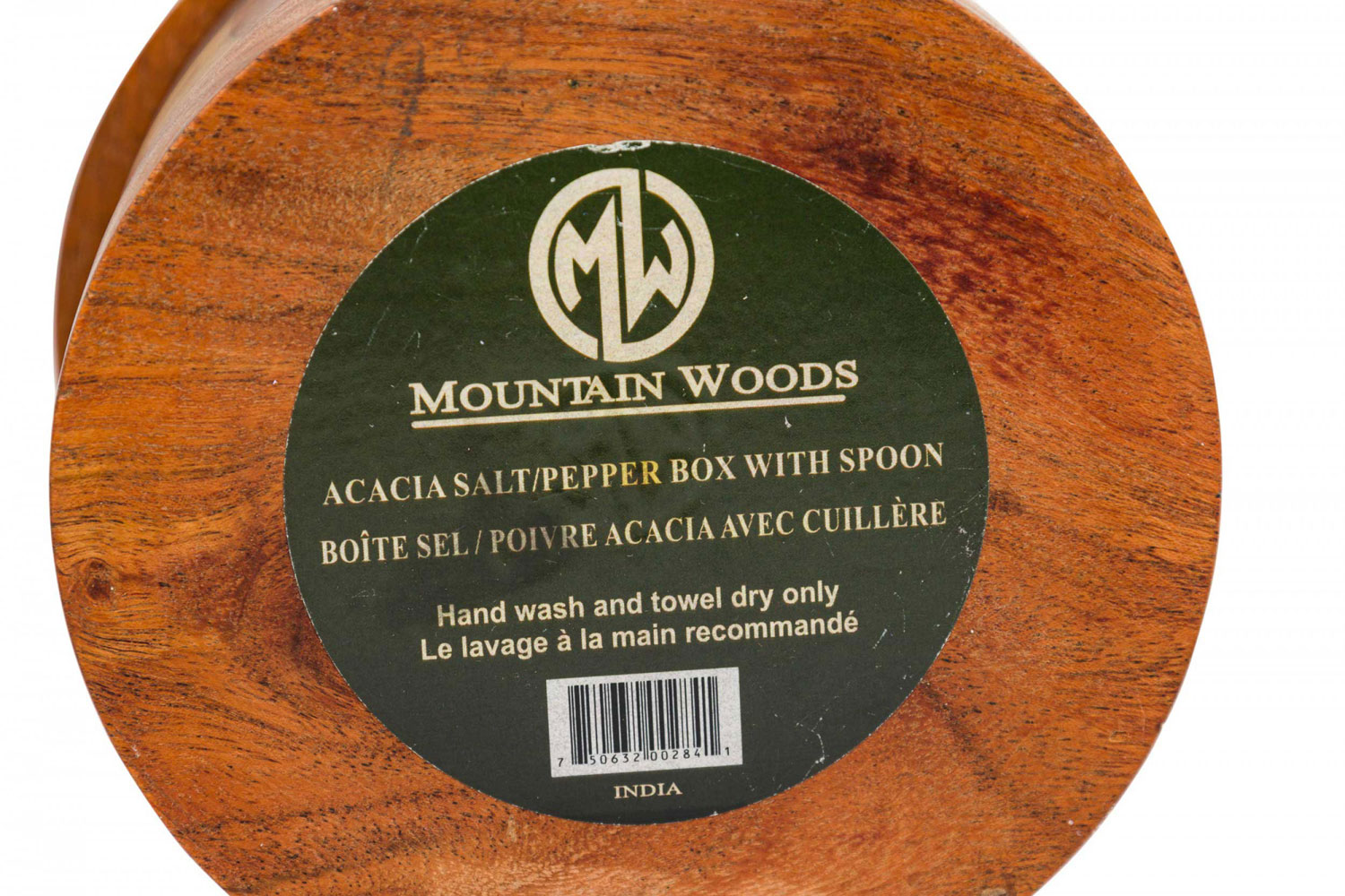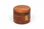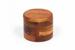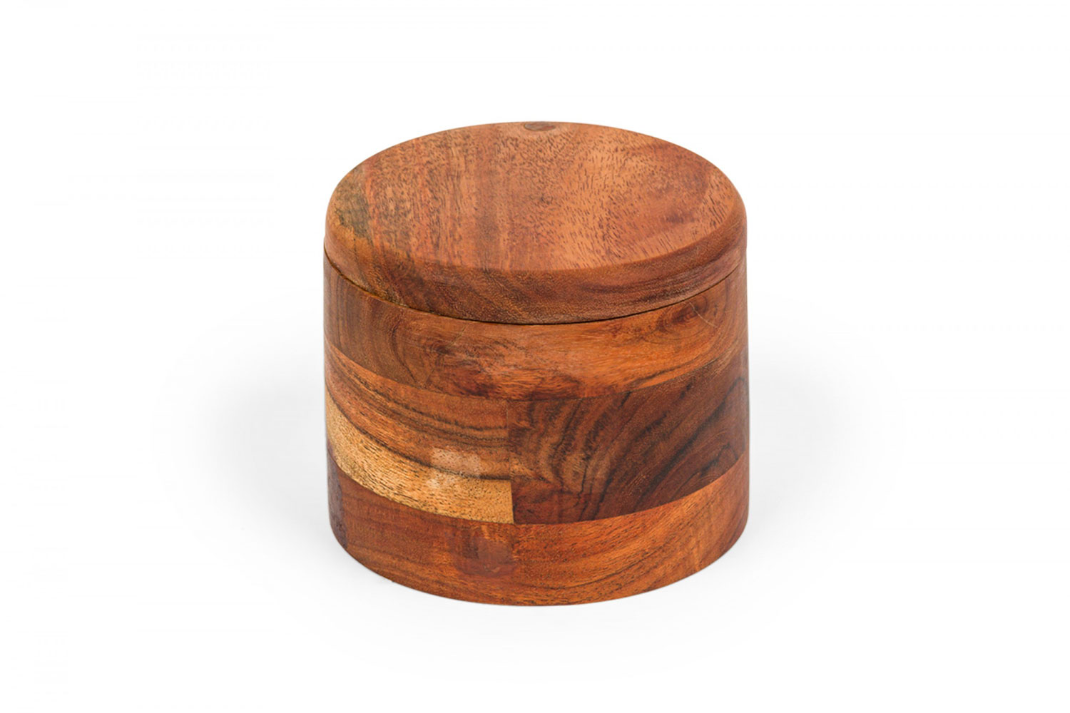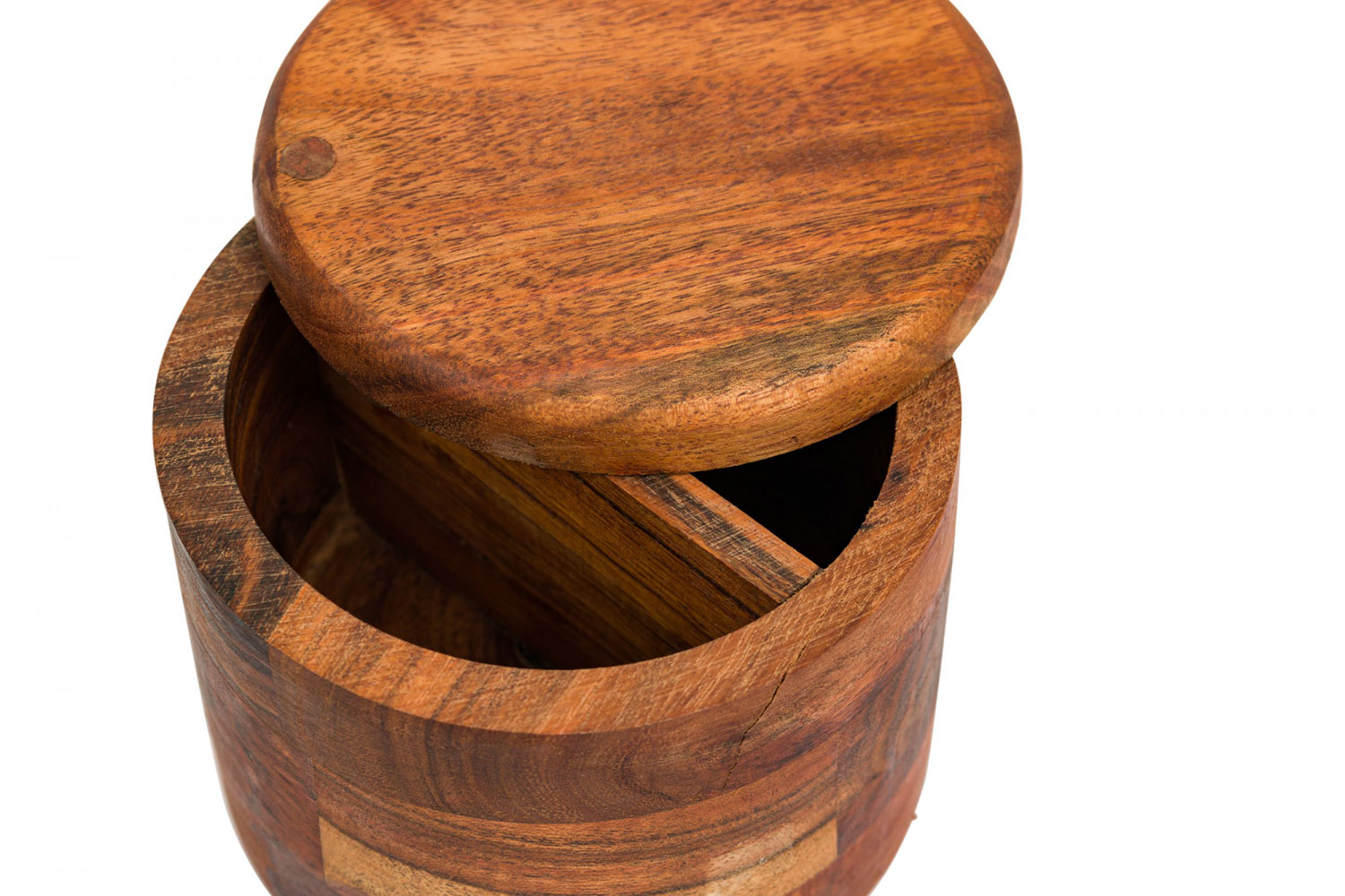 Contemporary Rustic cylindrical acacia wood salt and pepper celler with a pivoting top and divided interior with two small wooden spoons.