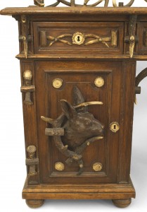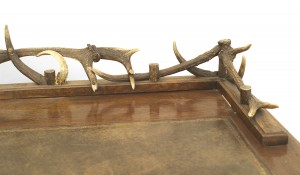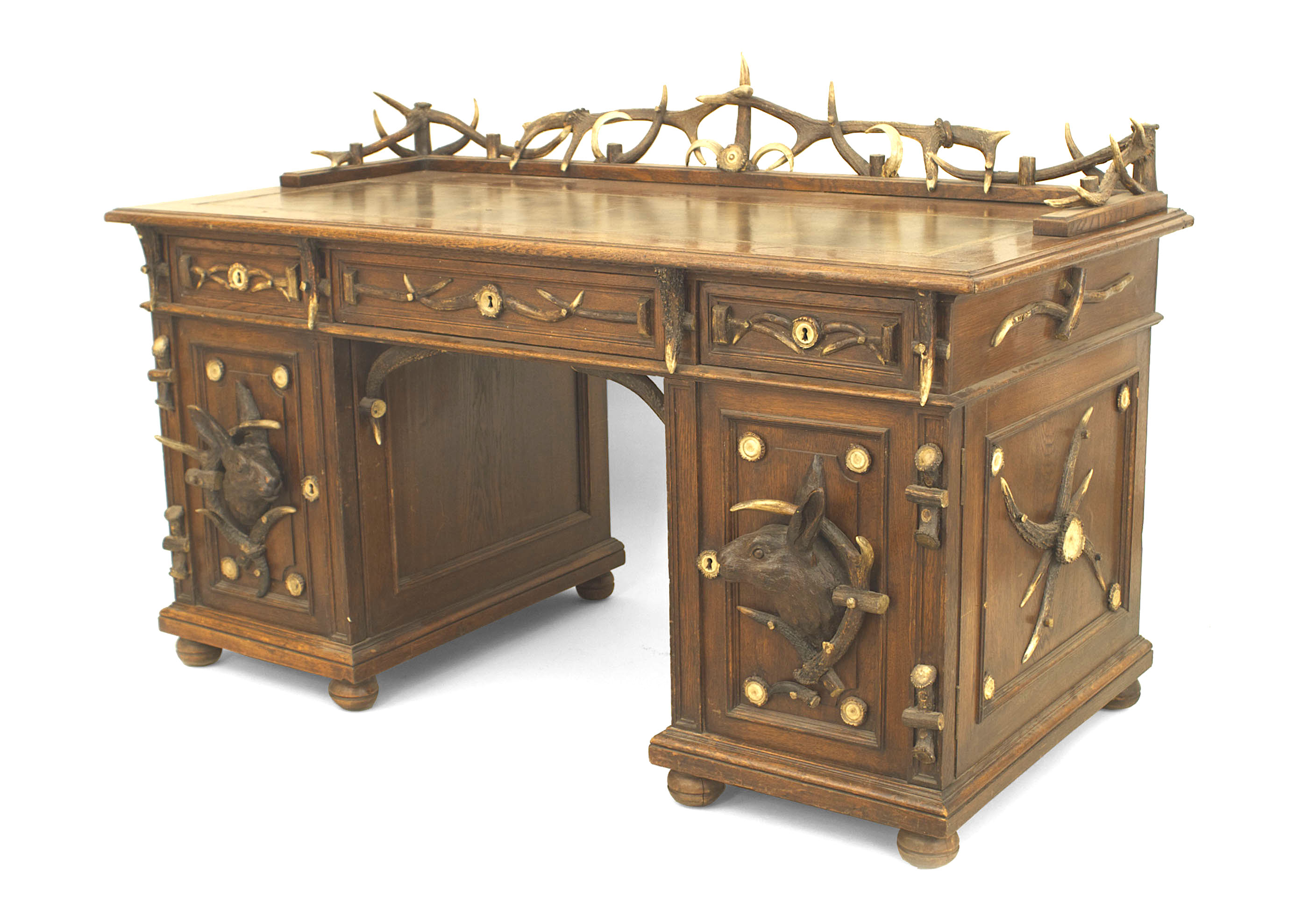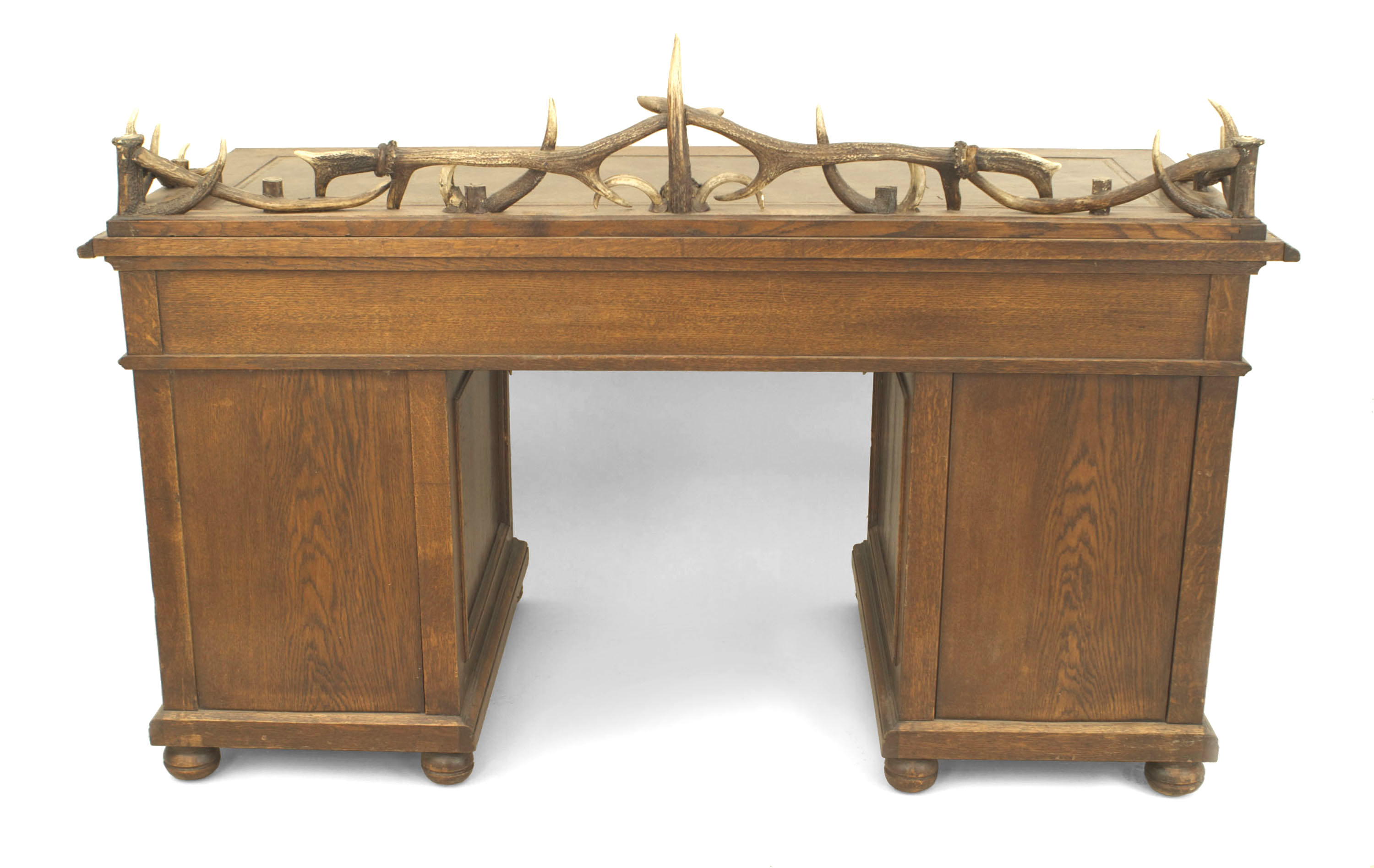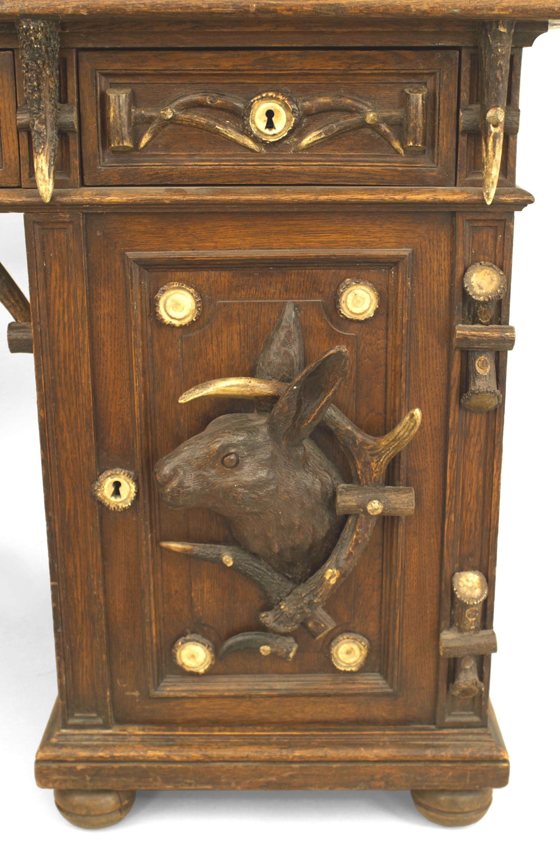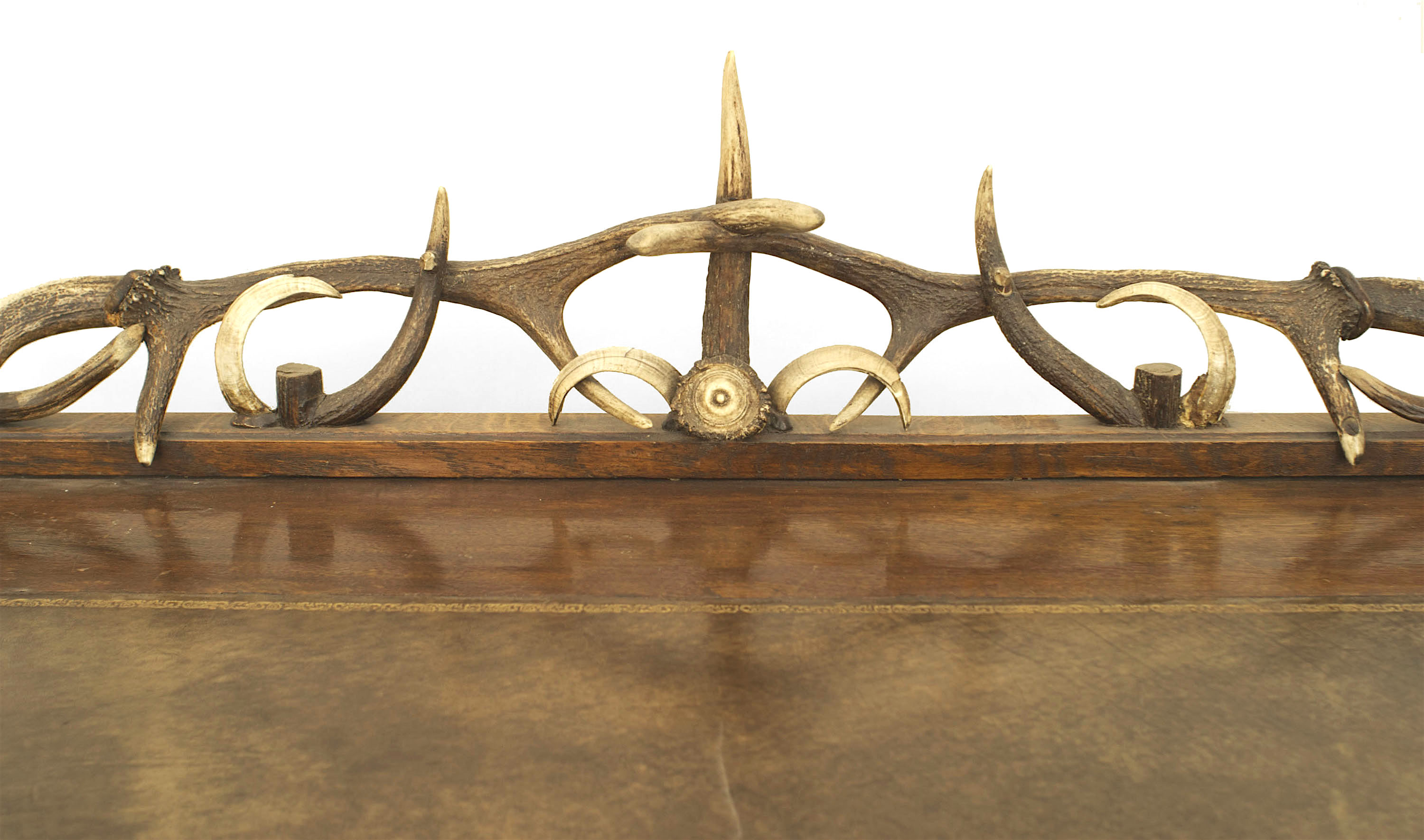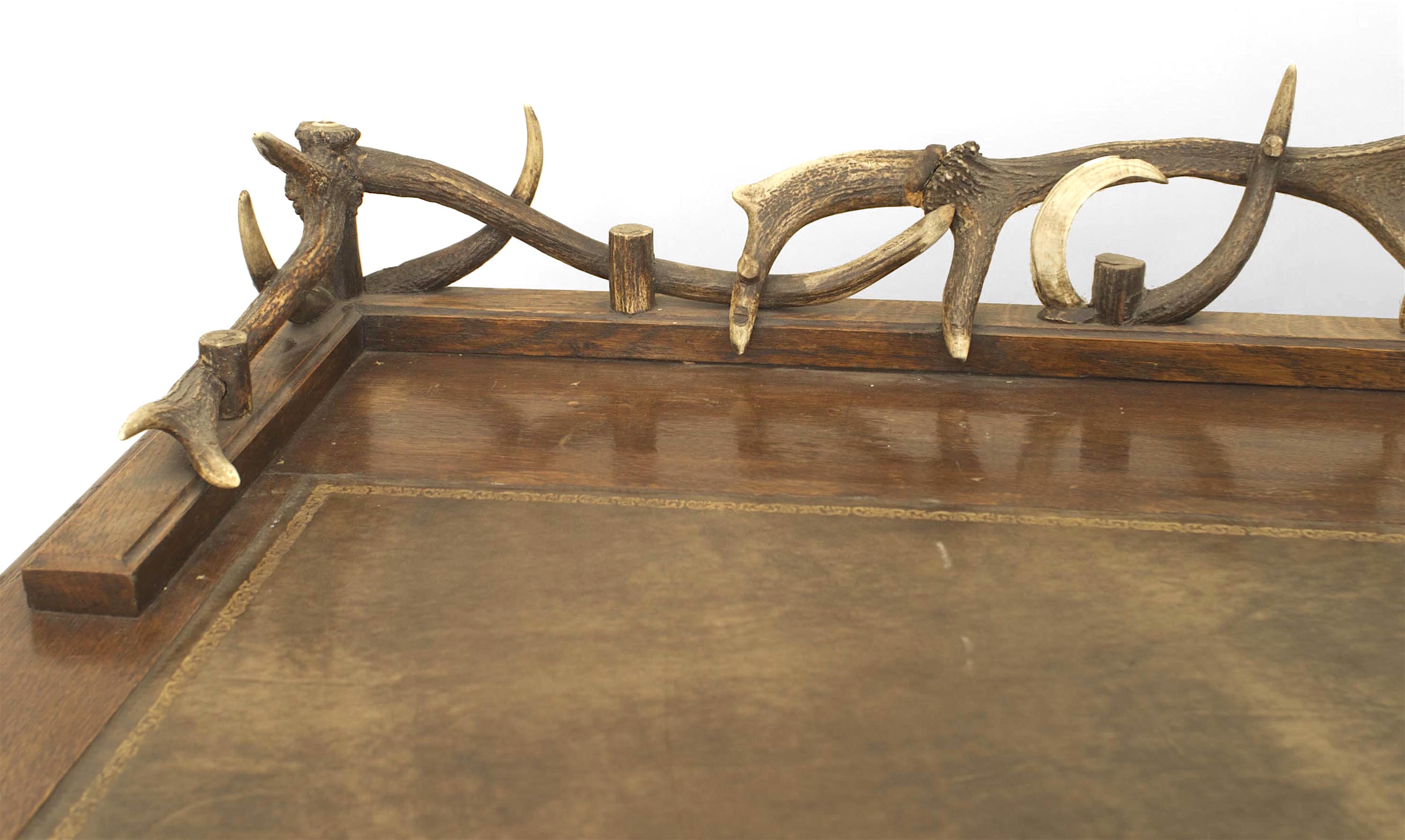 Rustic style Continental German (late 19th Century) antler and oak kneehole desk with antler gallery & trim with carved rabbit heads on doors with brown leather top.