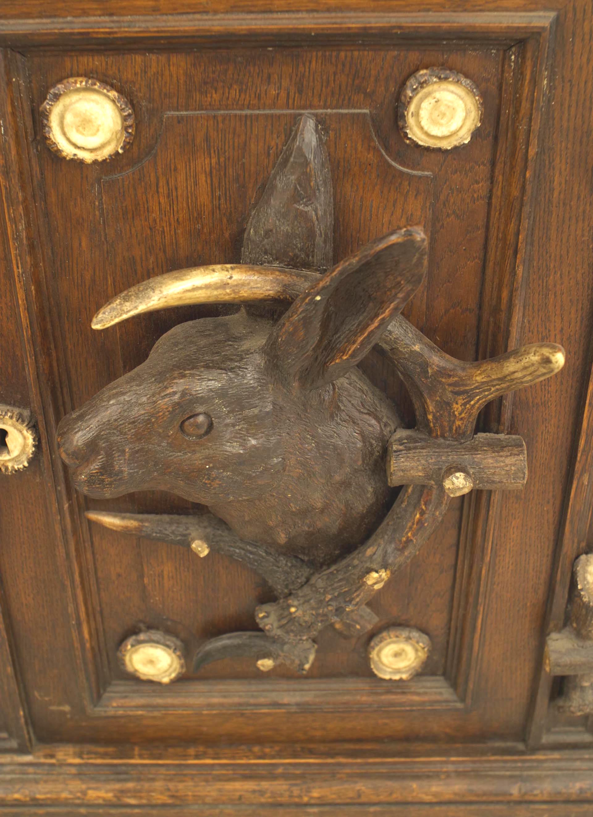 Rustic style Continental German (late 19th Century) antler and oak kneehole desk with antler gallery & trim with carved rabbit heads on doors with brown leather top..