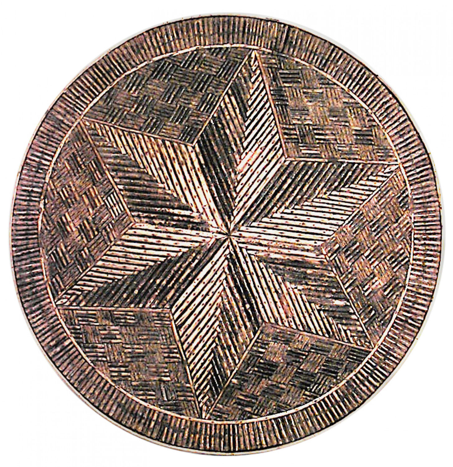 Rustic Continental (19/20th Century) round end table with elm wood swirl design pedestal base and twig inlaid top with geometric and star pattern.