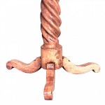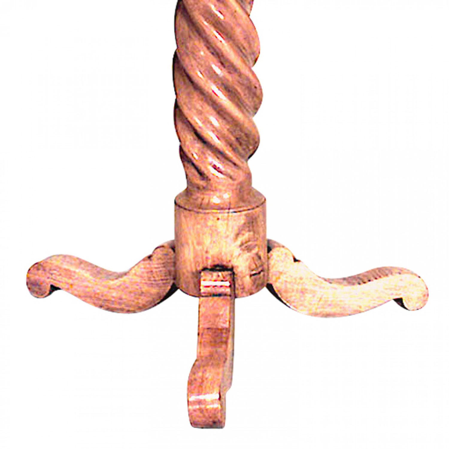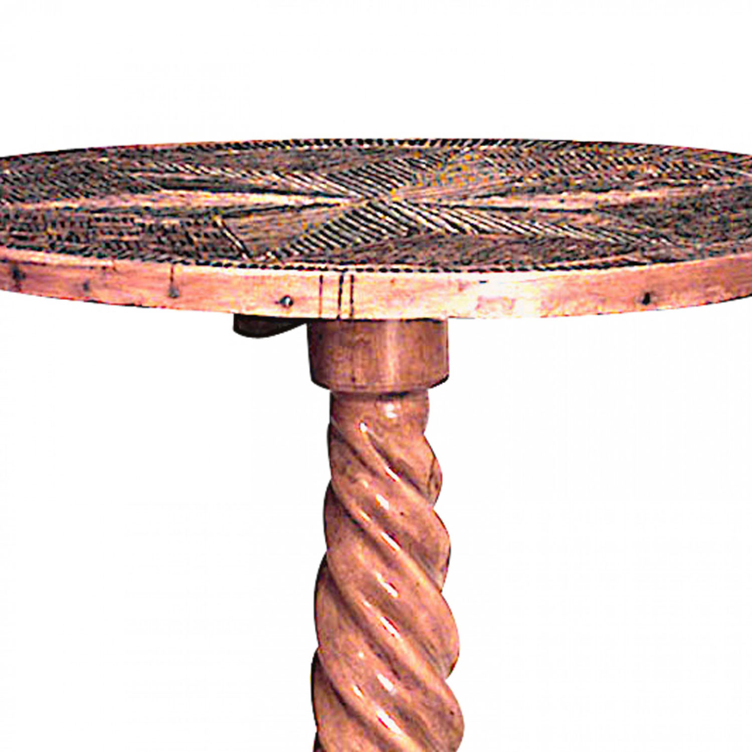Rustic Continental (19/20th Century) round end table with elm wood swirl design pedestal base and twig inlaid top with geometric and star pattern..