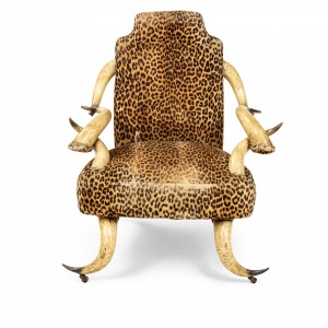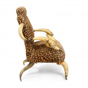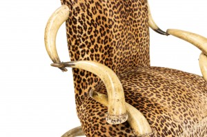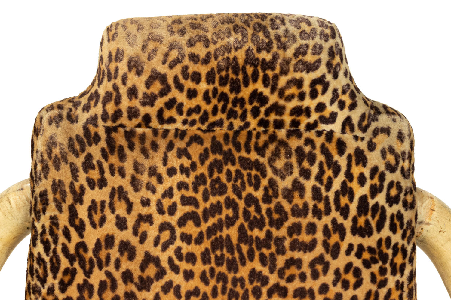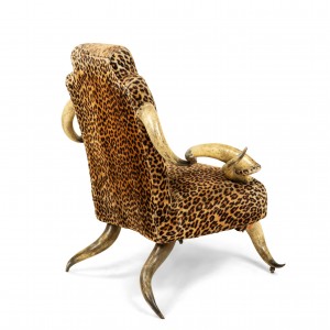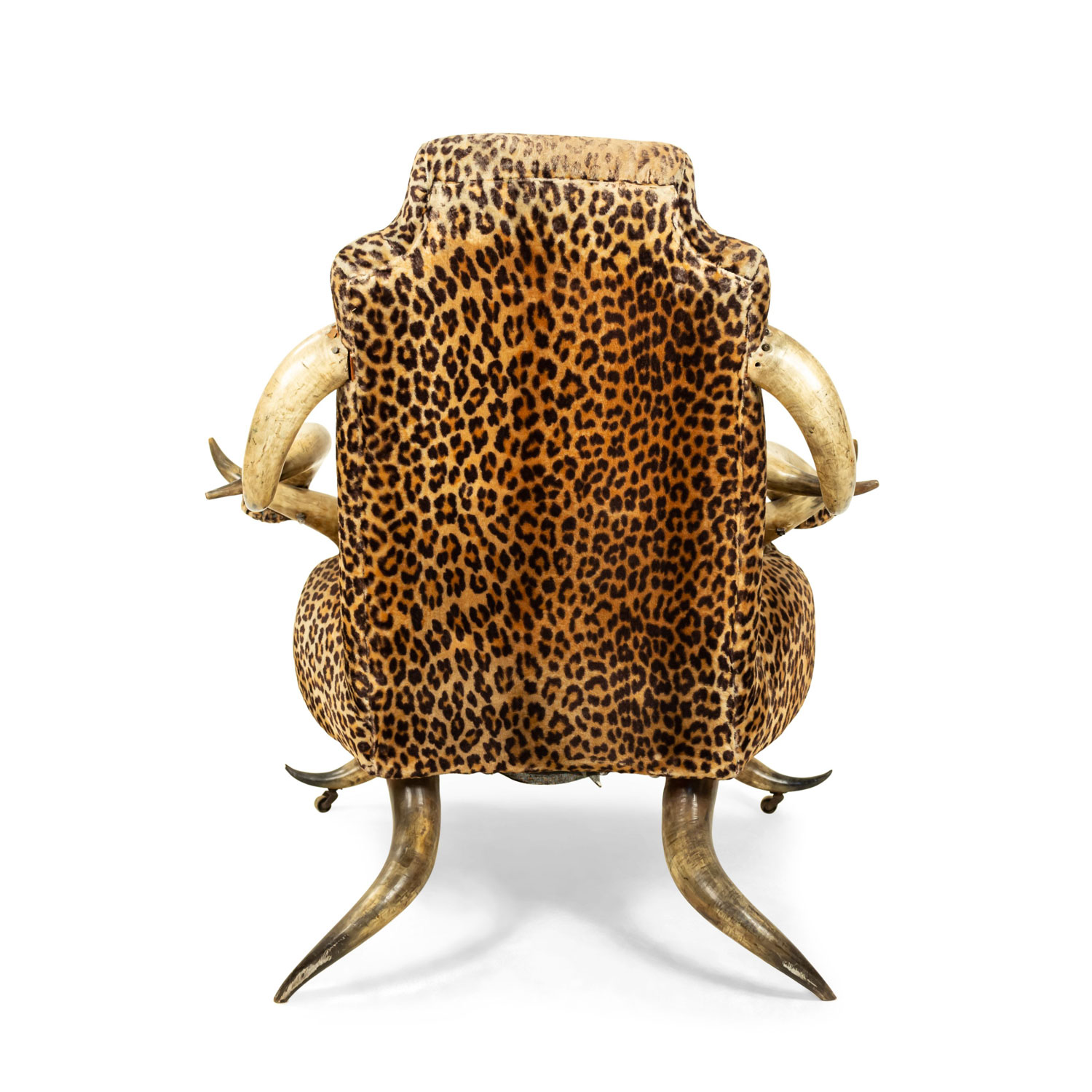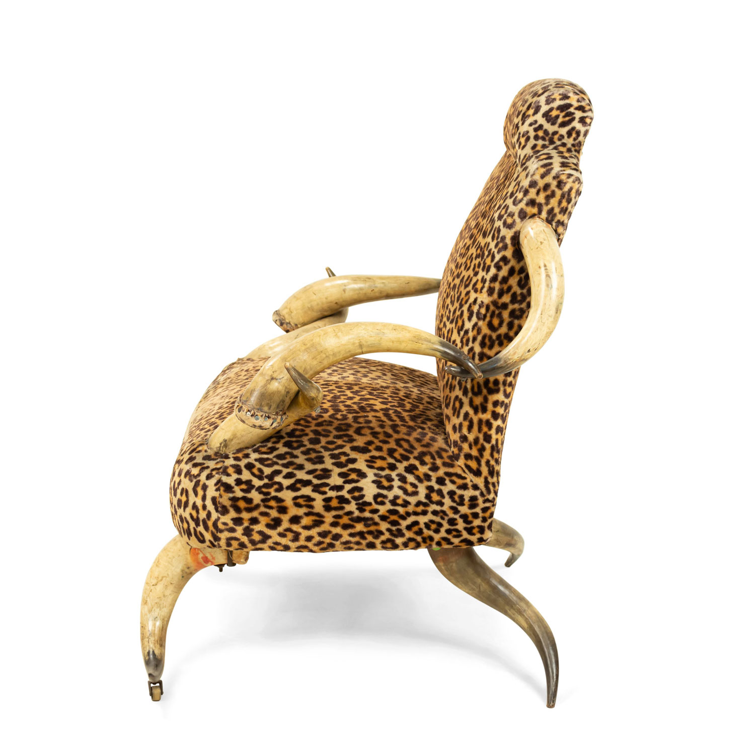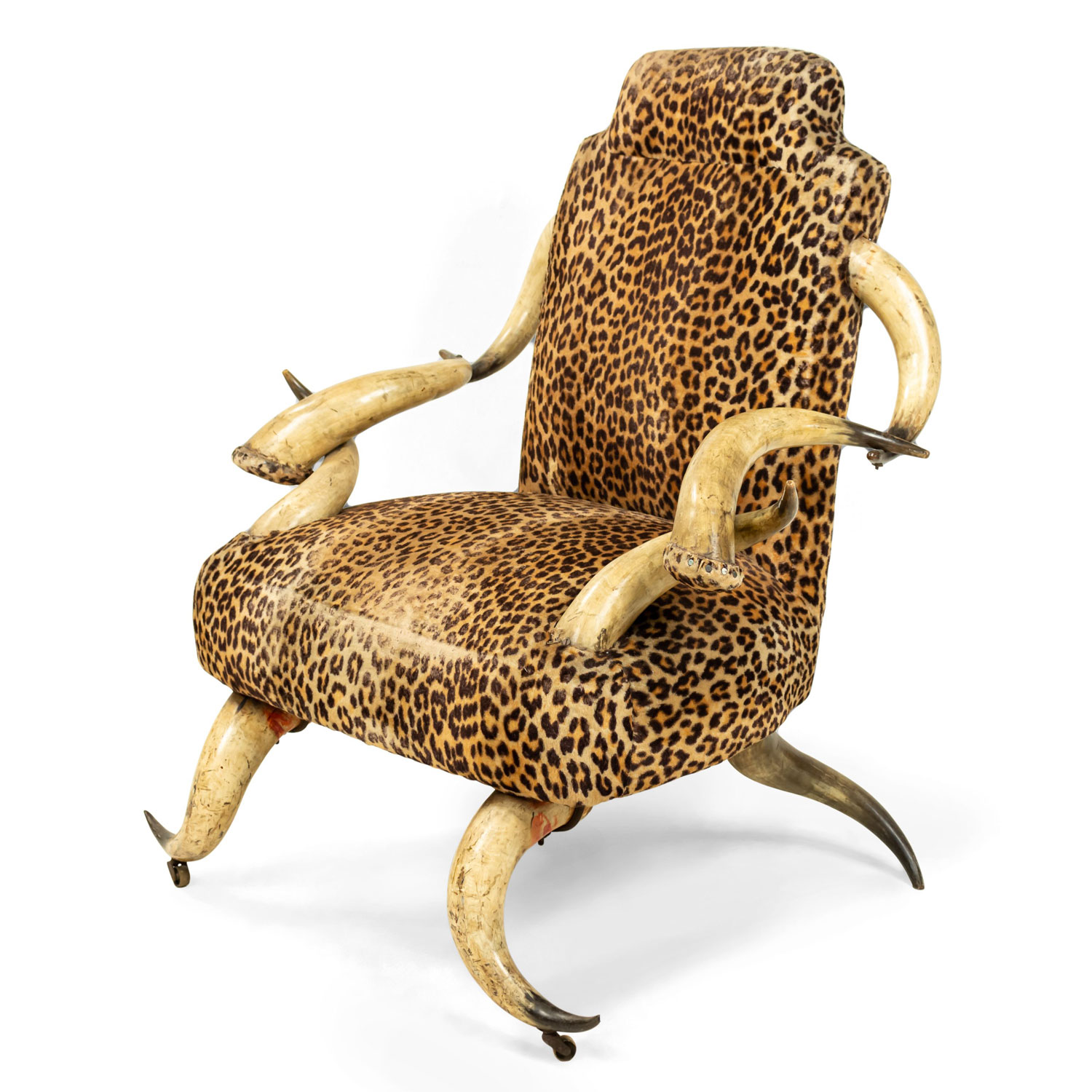 Rustic Continental (19th Century) horn design large arm chair with head rest and leopard upholstered seat and back.