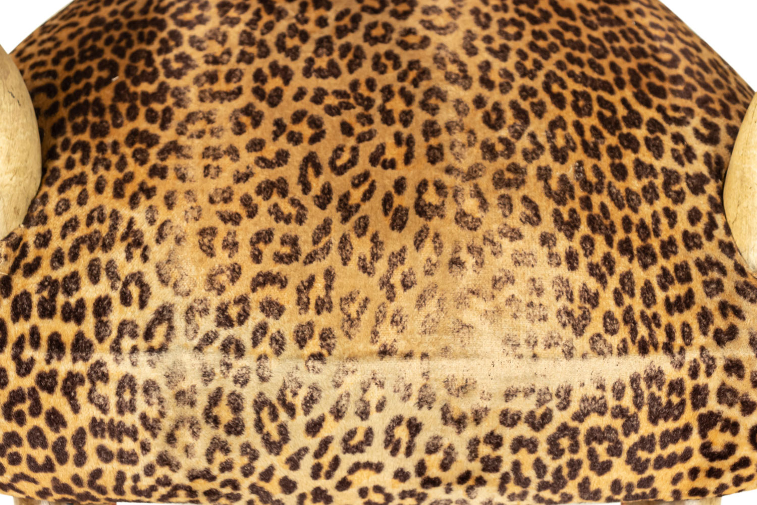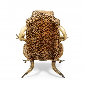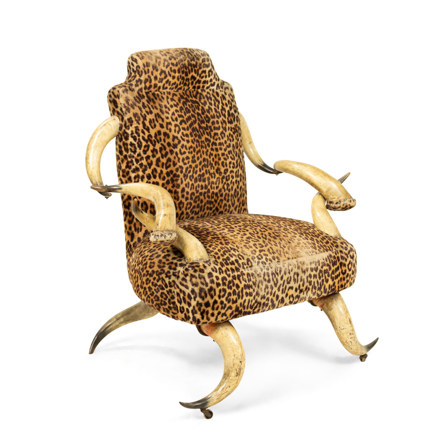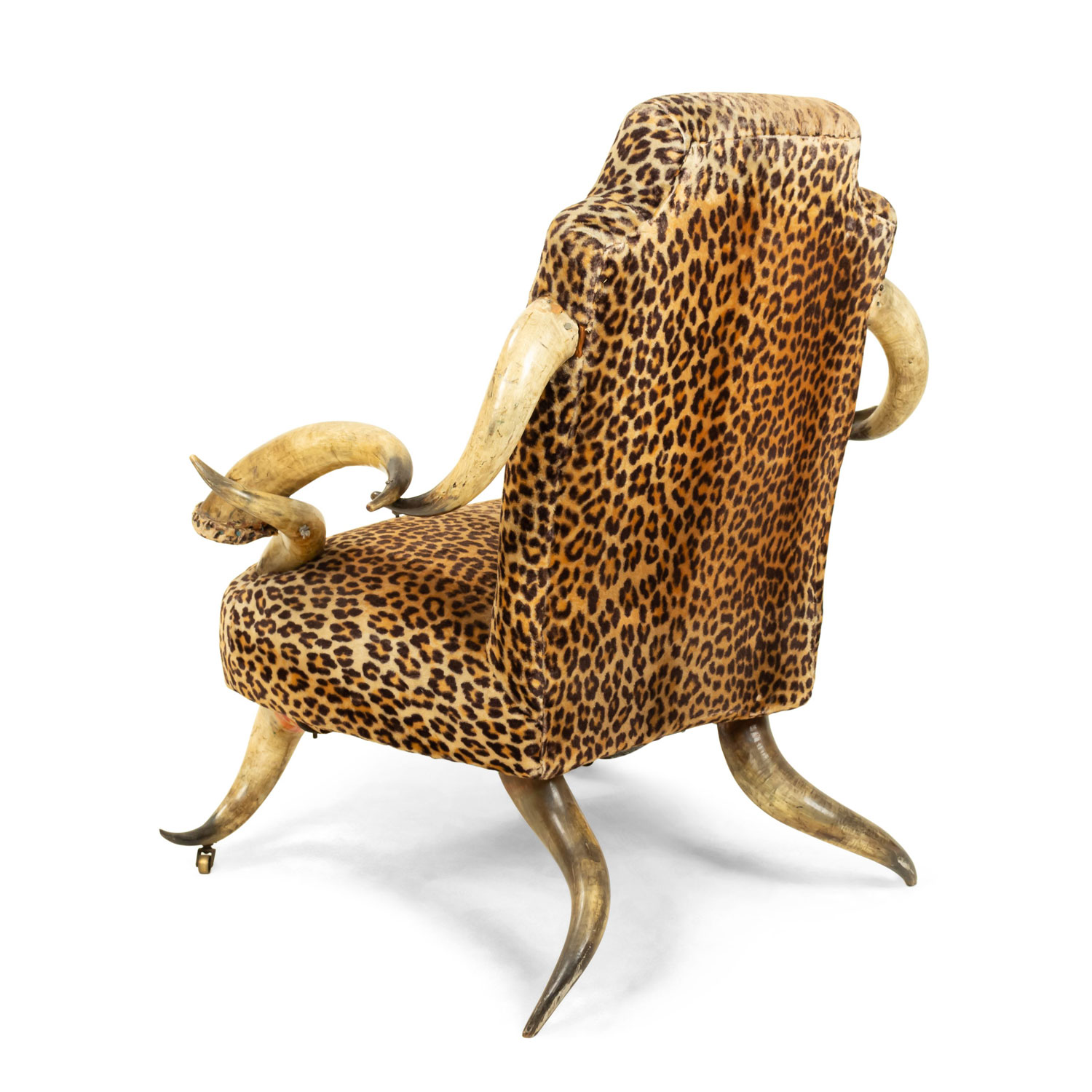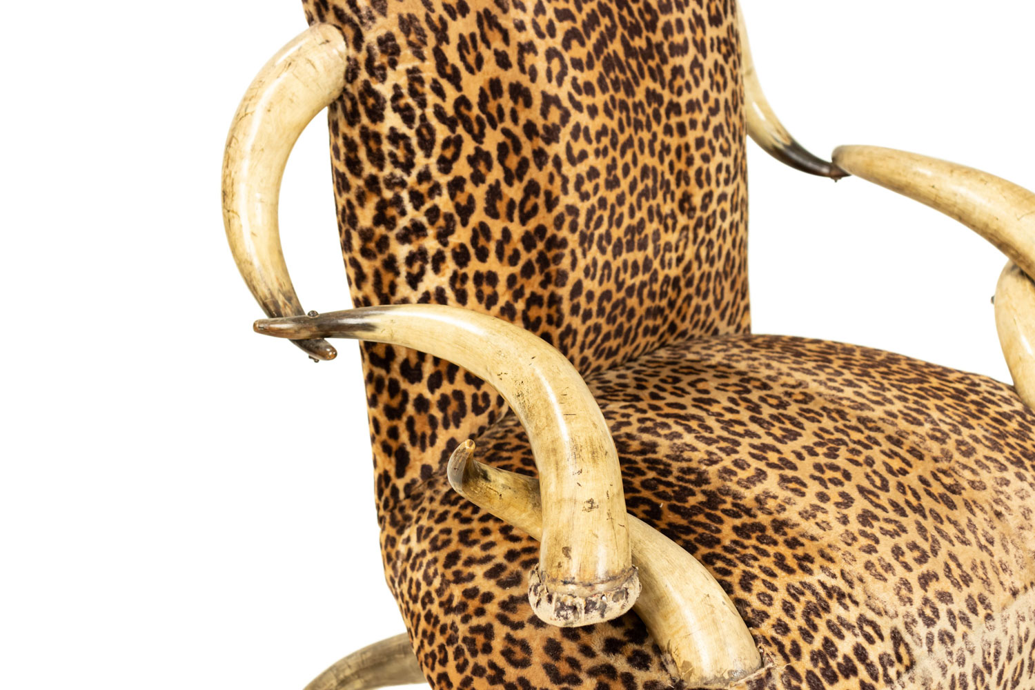 Rustic Continental (19th Century) horn design large arm chair with head rest and leopard upholstered seat and back..