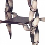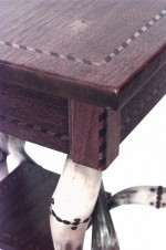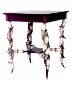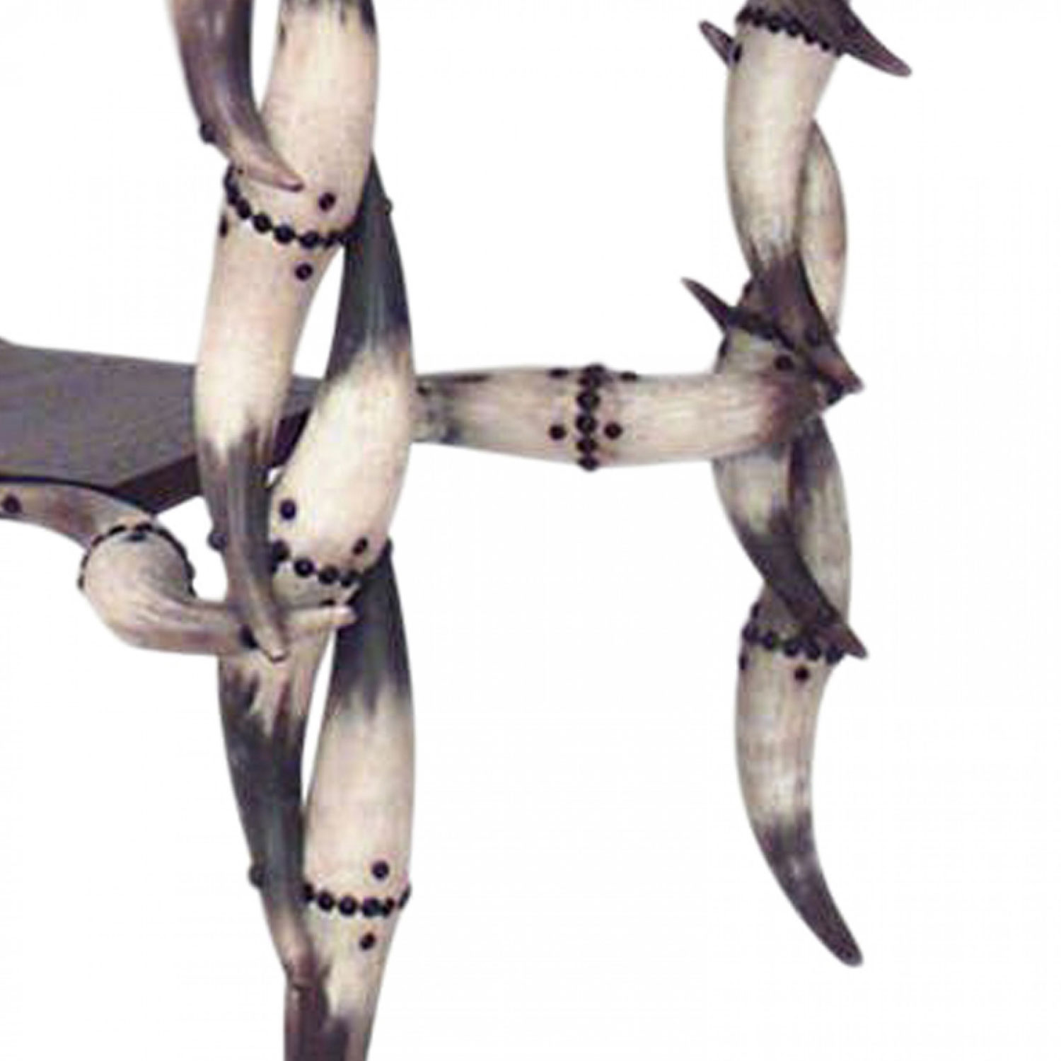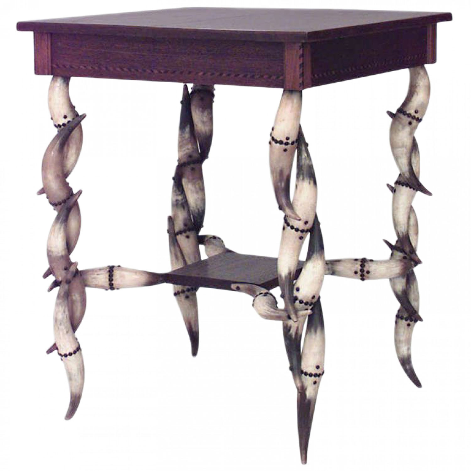 Rustic Continental (19th Century) square end table with inlaid trimmed top & shelf and steer horn design legs.
