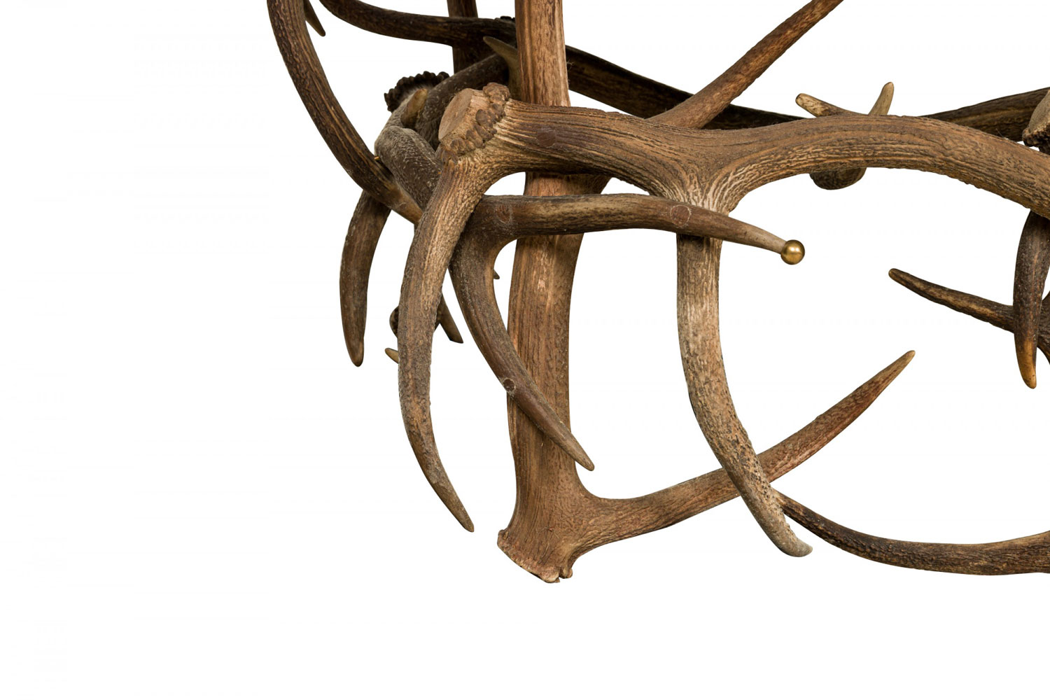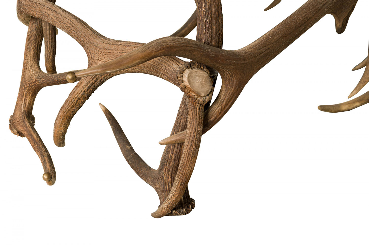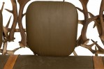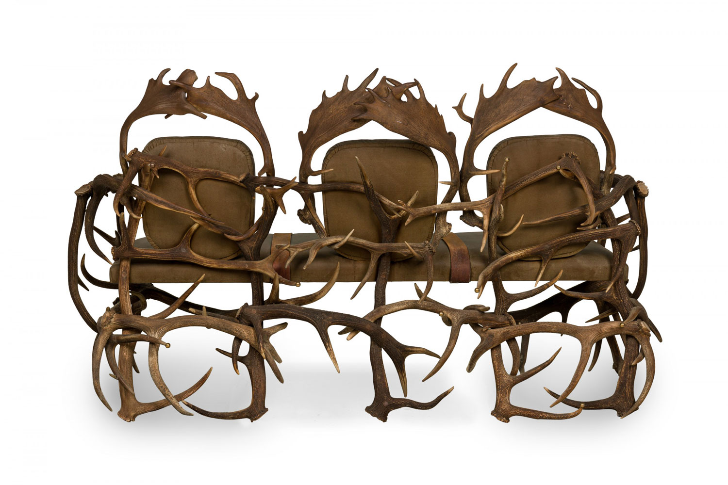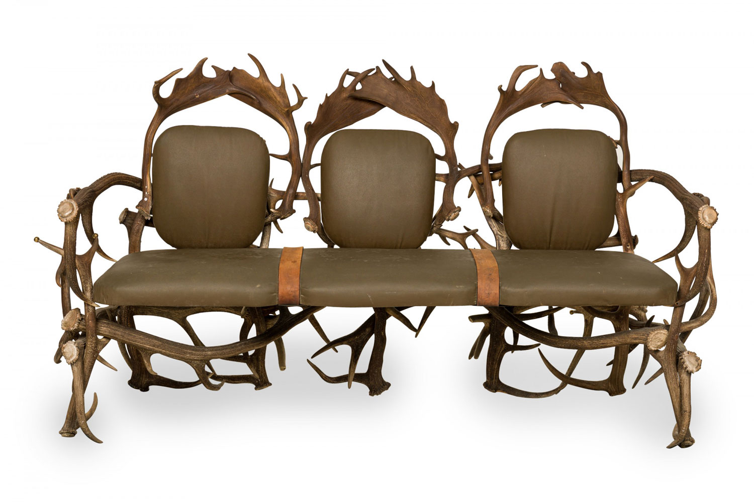 Rustic Continental-style three seat settee with dark olive green leather upholstered seat and backs with two decorative brown suede straps in a frame built from resin faux moose and deer antlers, some of which are capped with decorative brass balls. (Similar armchairs: 063384)