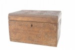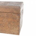 Rustic Continental rectangular walnut box with ornamental carvings of leaves and a key.