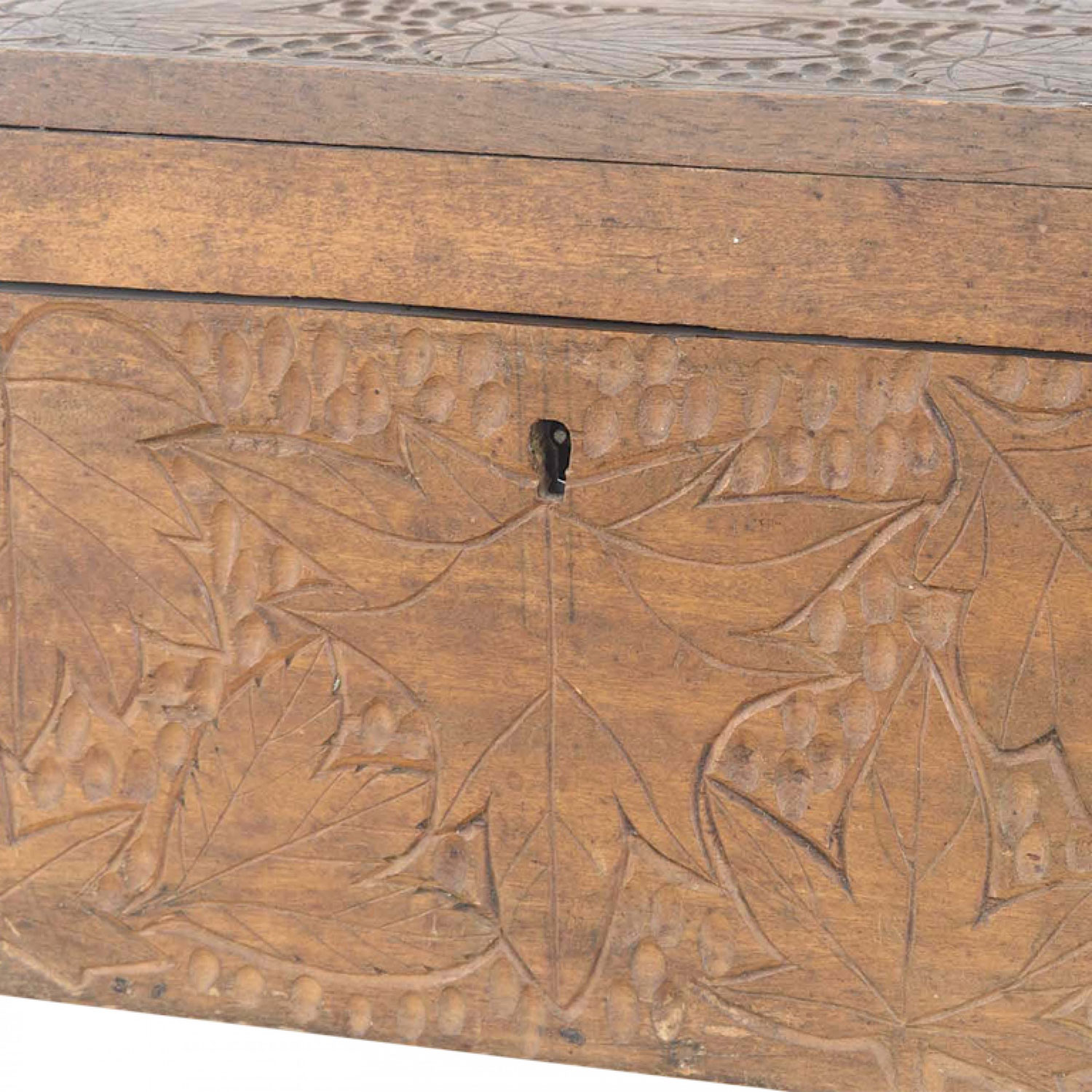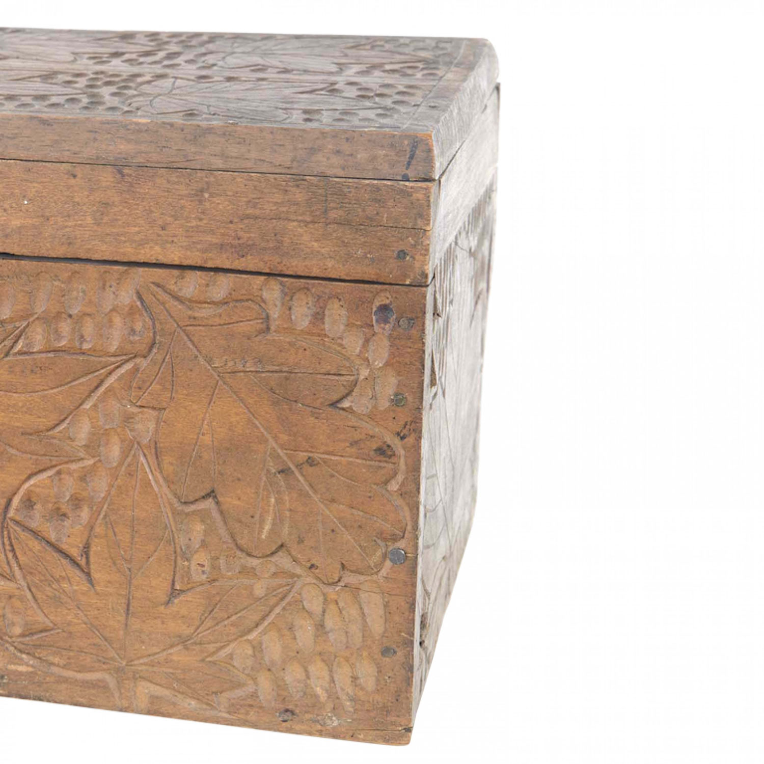 Rustic Continental rectangular walnut box with ornamental carvings of leaves and a key..