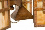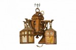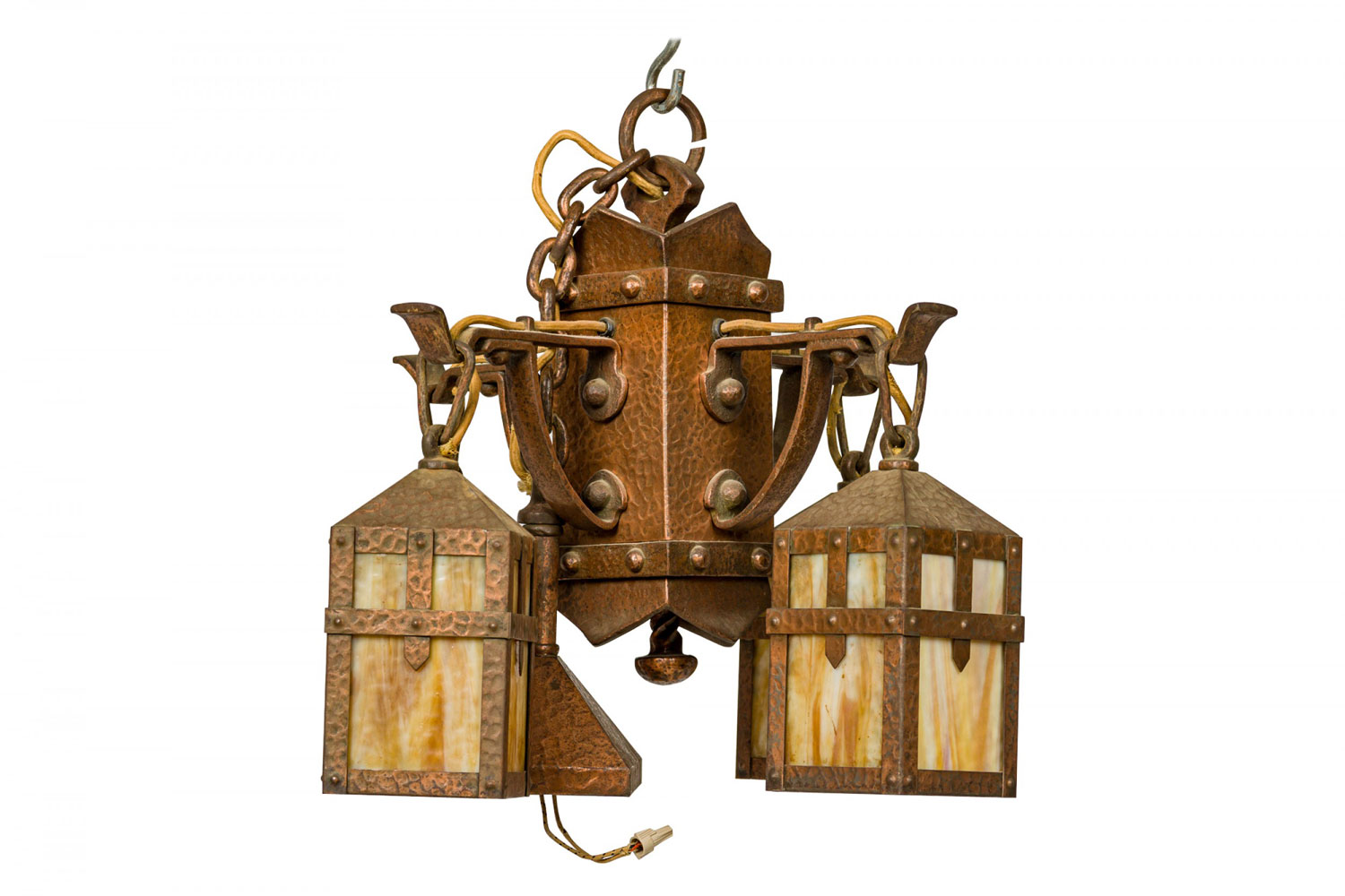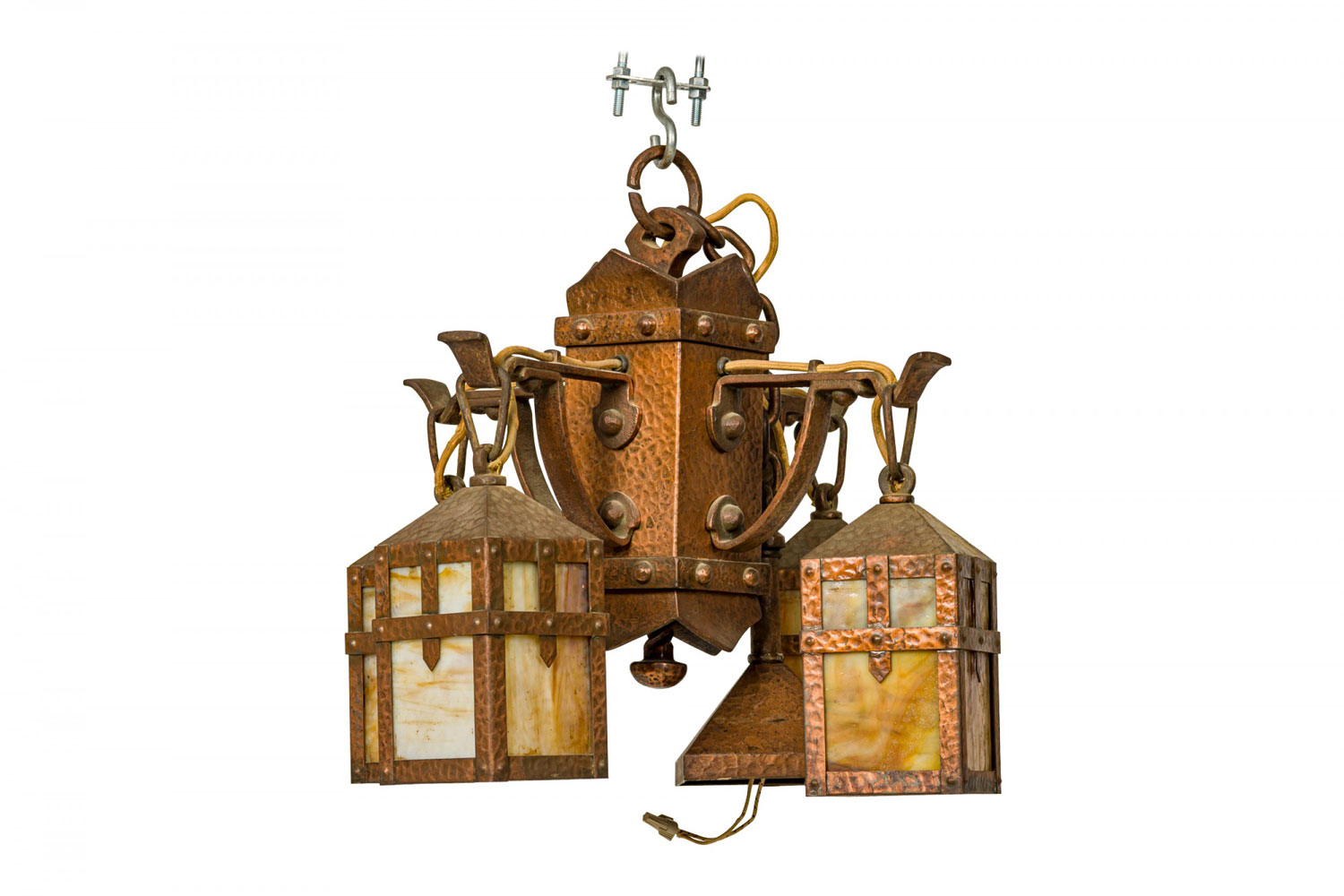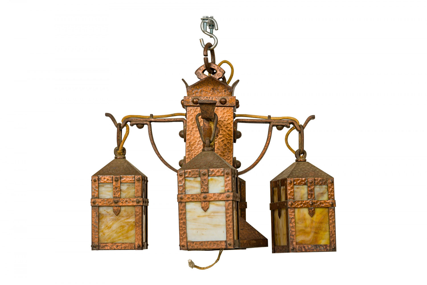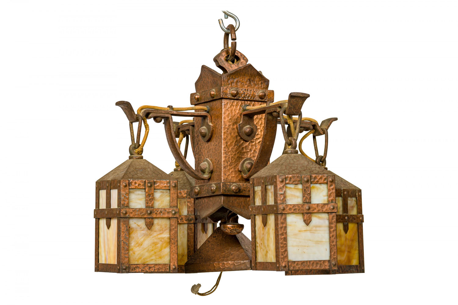 Rustic English Arts and Crafts-style hammered copper chandelier with four suspended hanging laterns made of copper with yellow and beige slag glass insets. (Matching sconces: 063362)