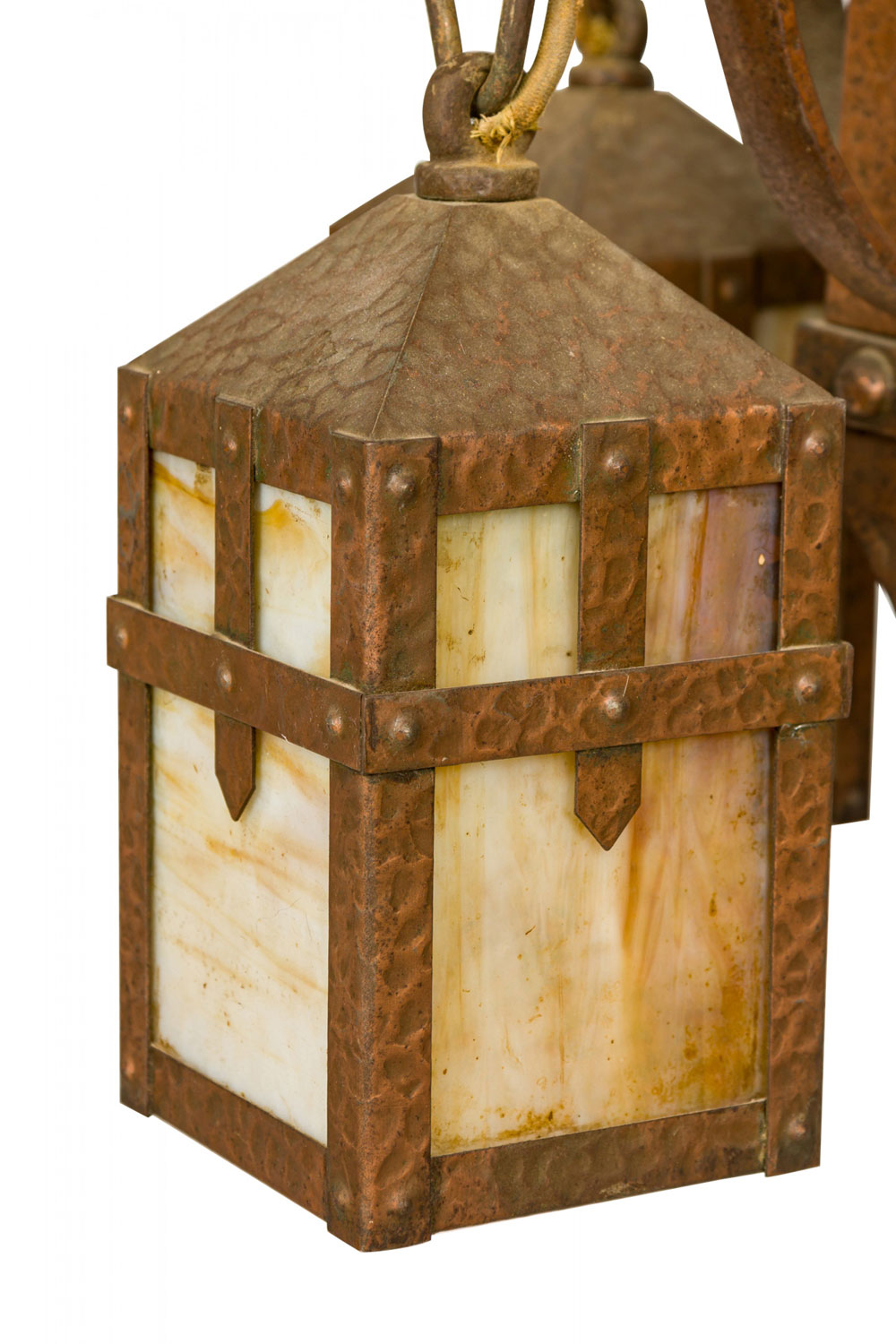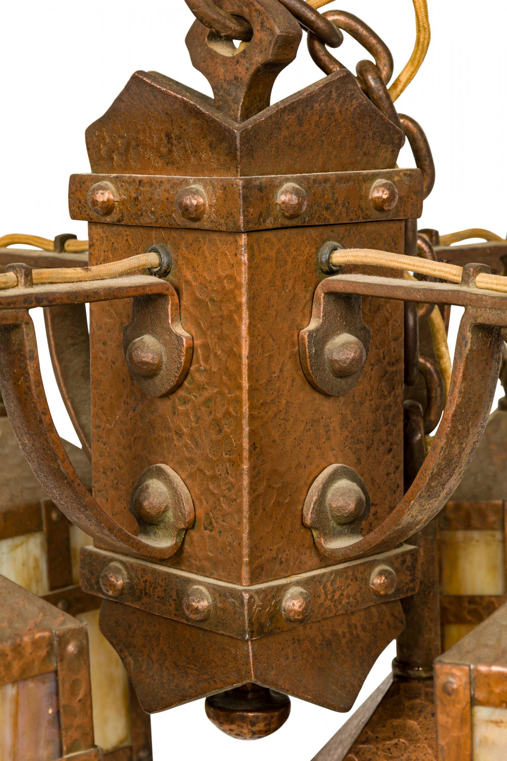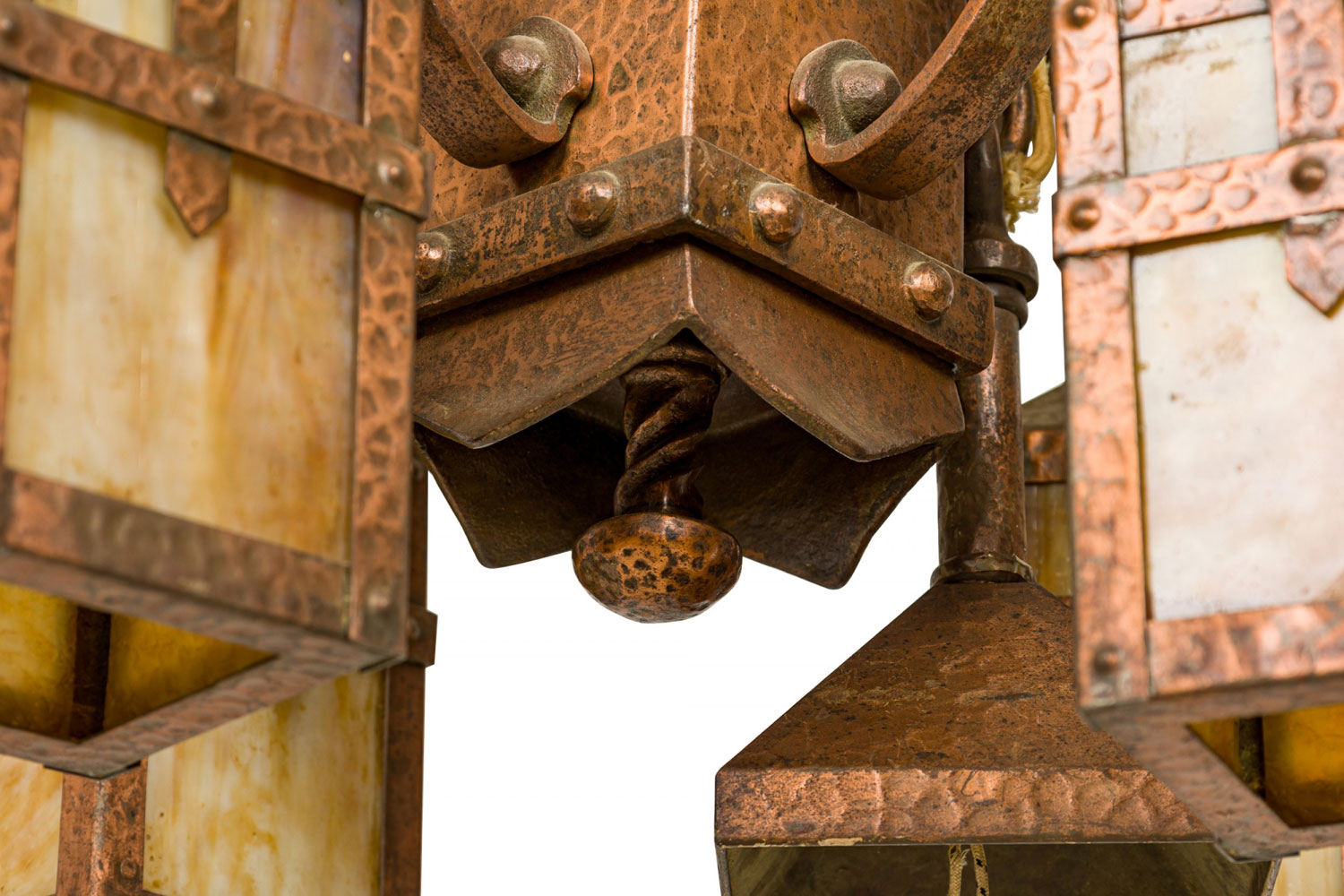 Rustic English Arts and Crafts-style hammered copper chandelier with four suspended hanging laterns made of copper with yellow and beige slag glass insets. (Matching sconces: 063362).