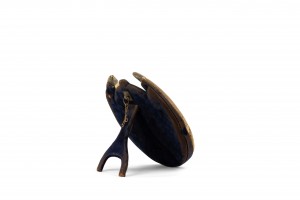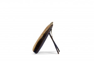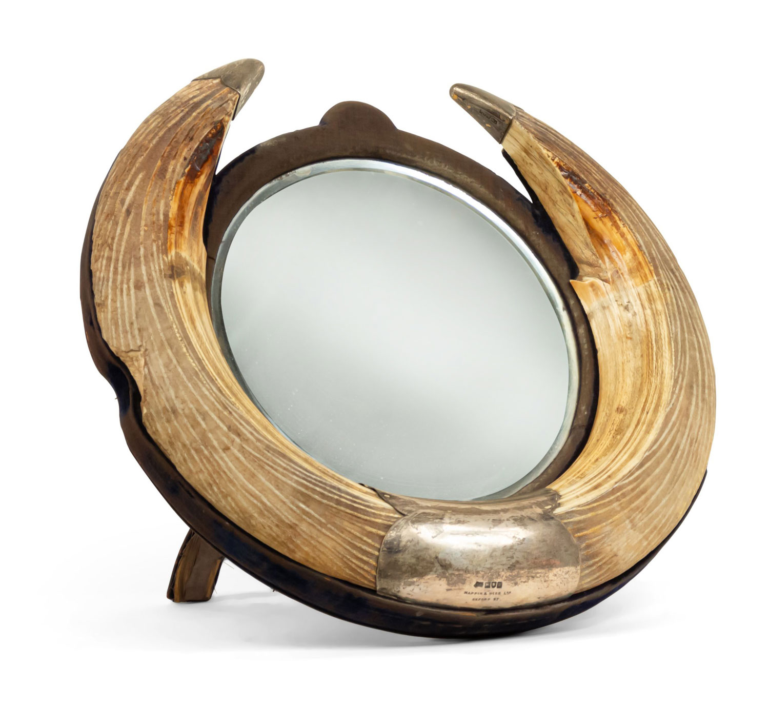 Rustic English Victorian (19th Century) round horn and silver trimmed dressing table / vanity mirror with blue (worn) velvet border and an easel stand..