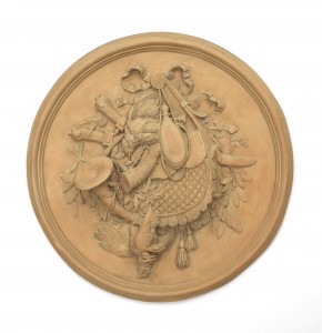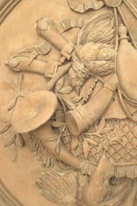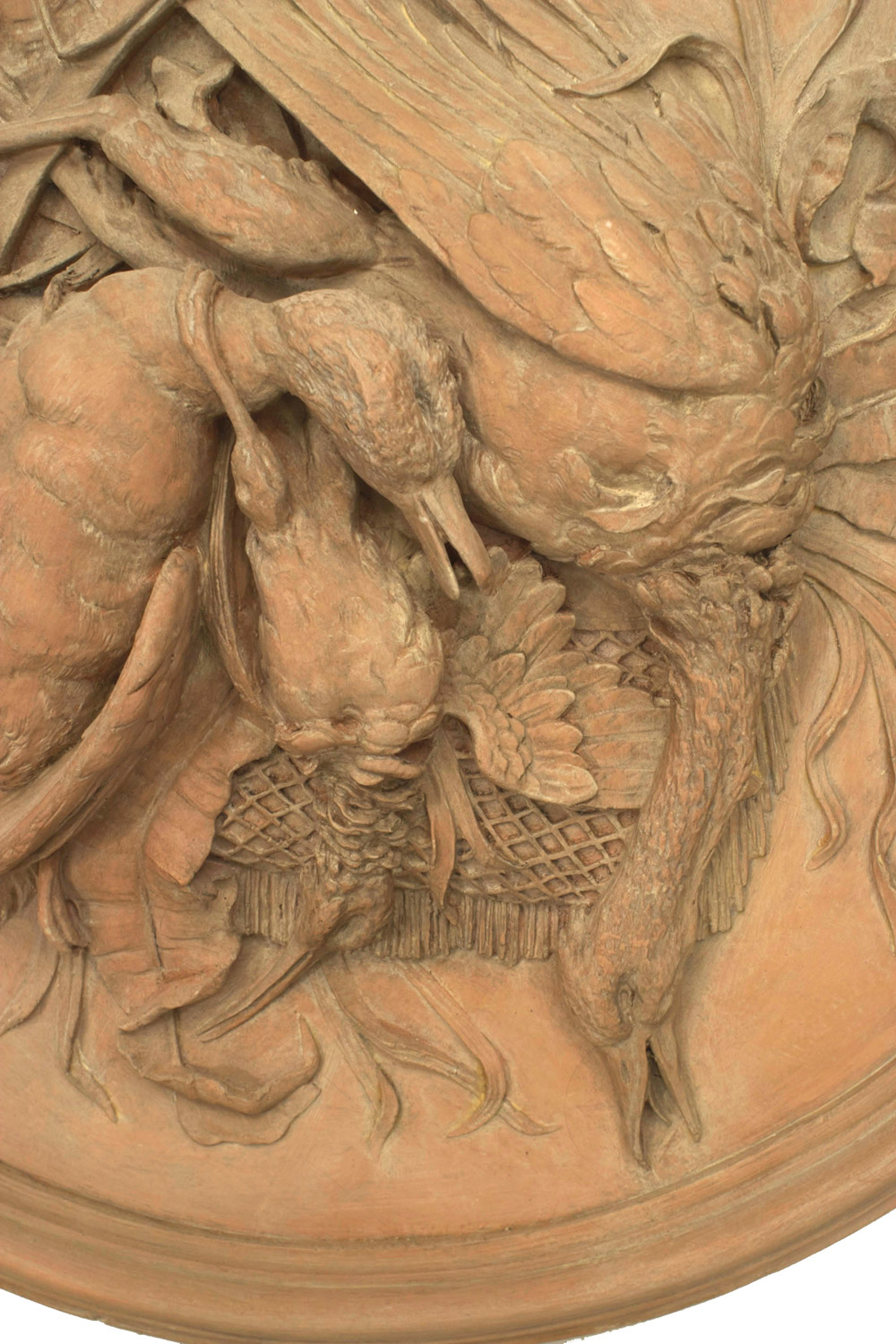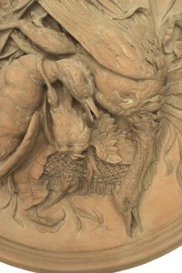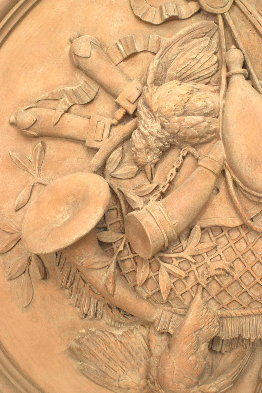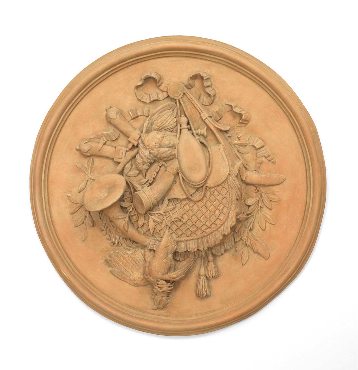 PAIR of Rustic French style resin (faux terra cotta) bleached round wall plaque medallions with game and trophy motifs and a bow-knot top (PRICED AS PAIR)..