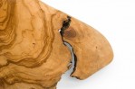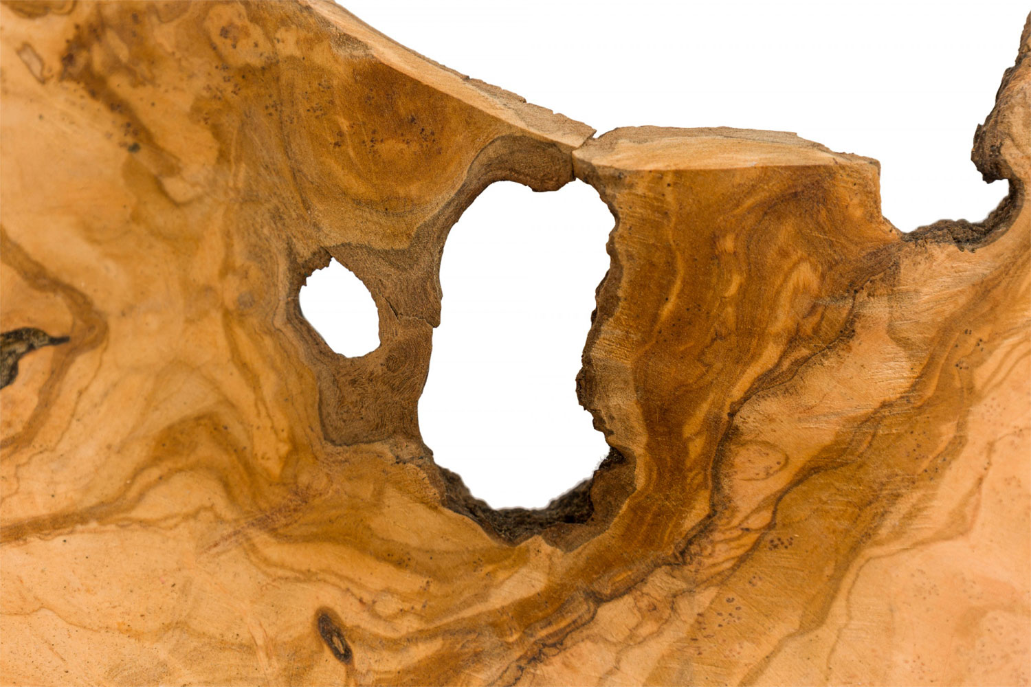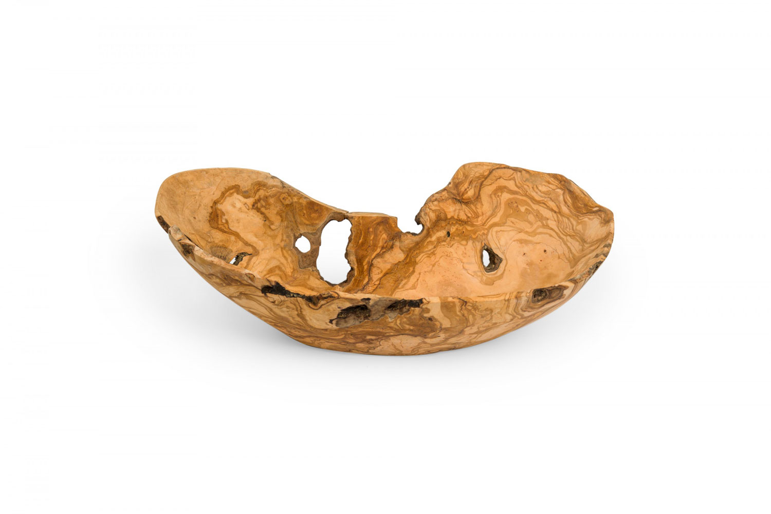Rustic decorative bowl with an organic curved kidney shape, made of carved and polished olivewood..