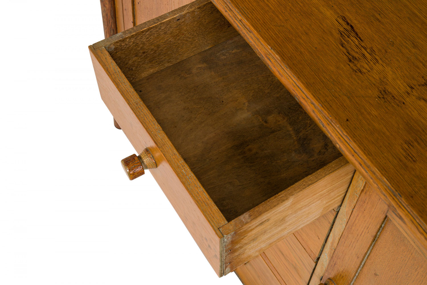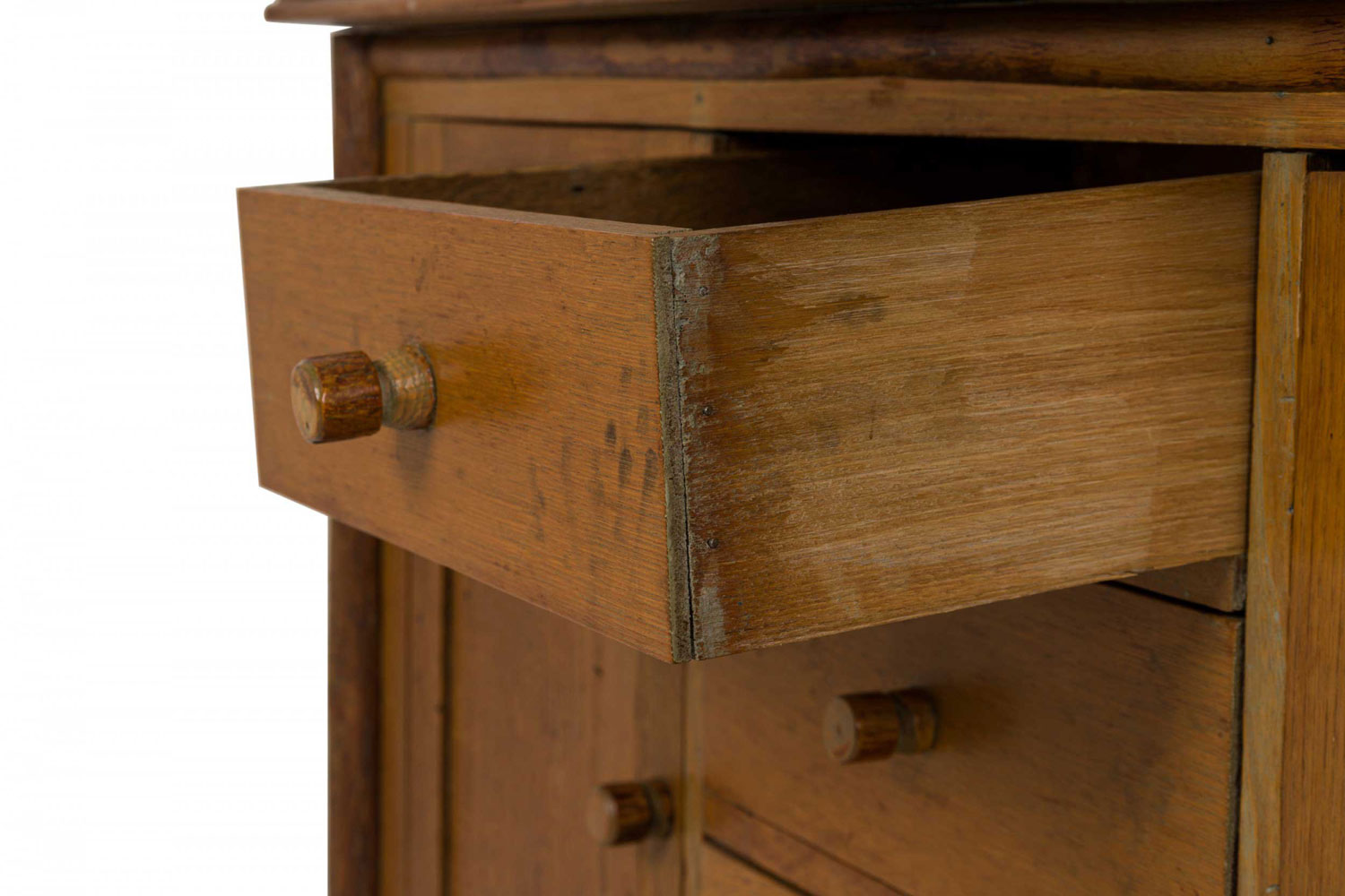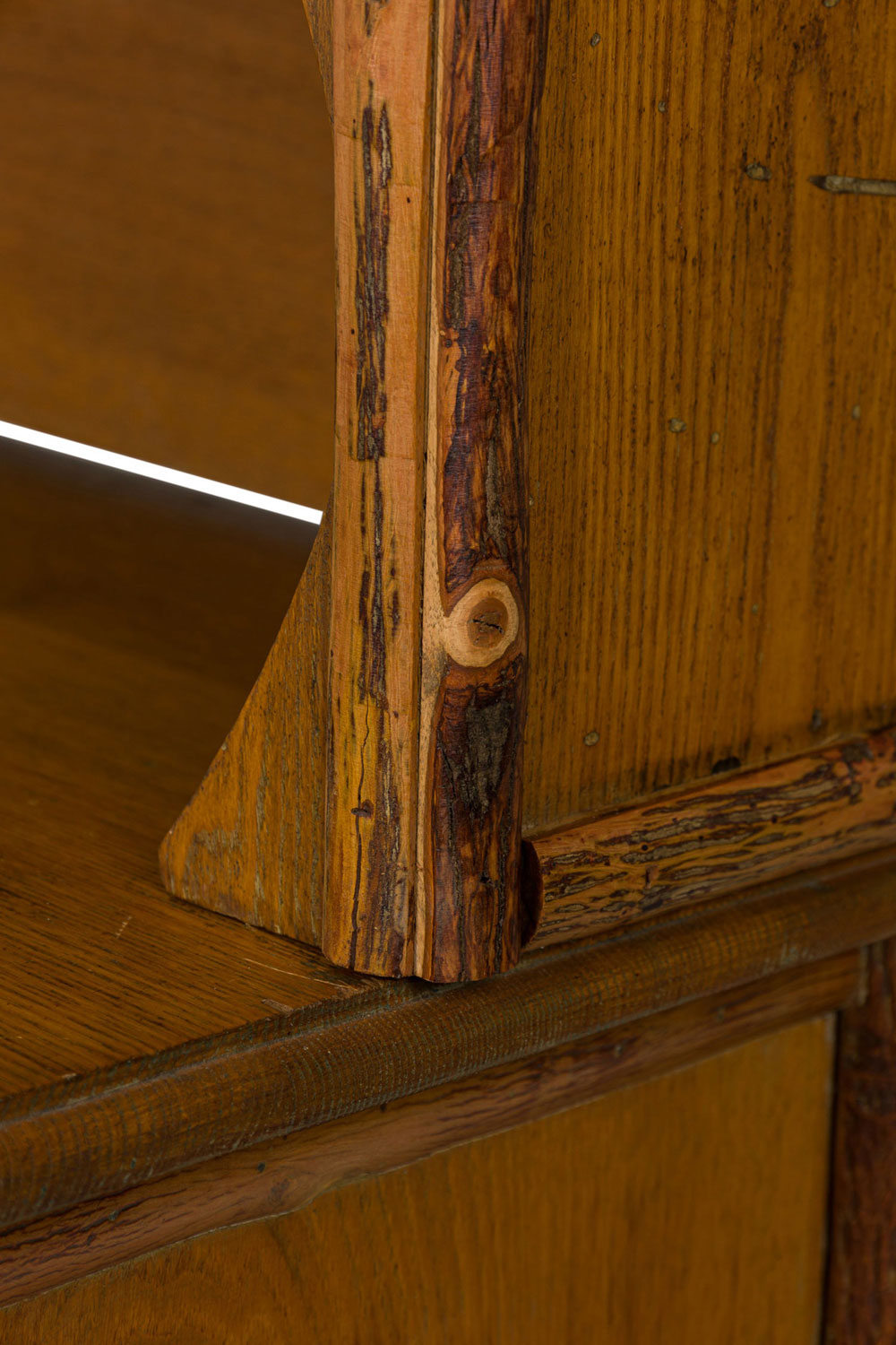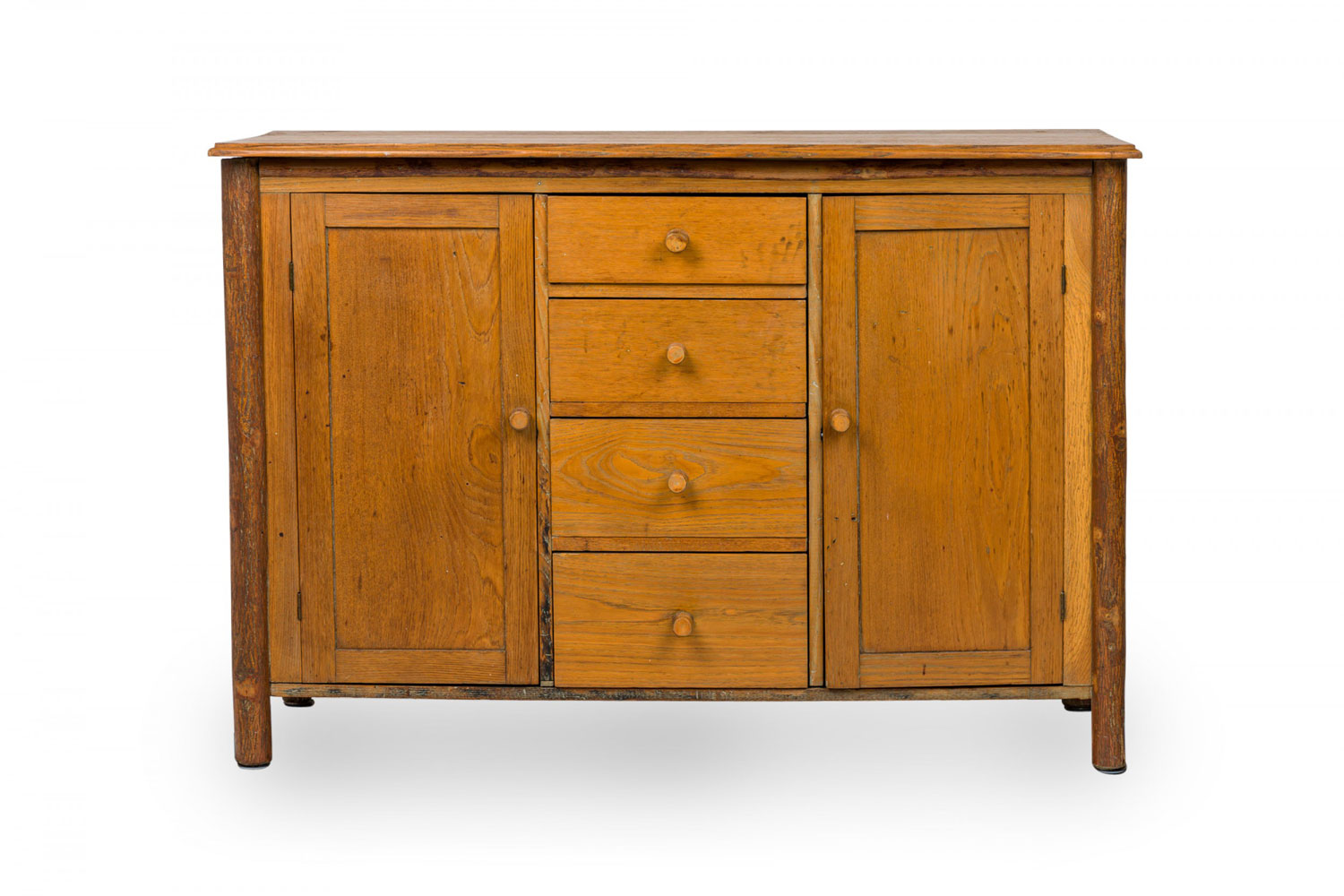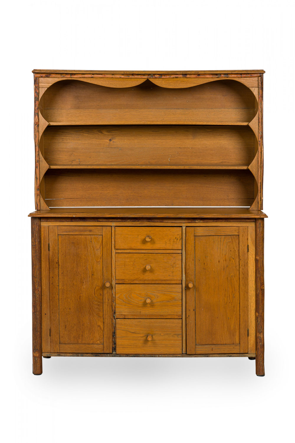 Rustic Old Hickory (Mid-20th Century) two-piece oak kitchen hutch with an open two-shelf upper section resting on a lower cabinet base with four central drawers flanked by two doors, all with turned wooden knob drawer handles and resting on four rounded cylindrical feet.(signed OLD HICKORY on back leg)