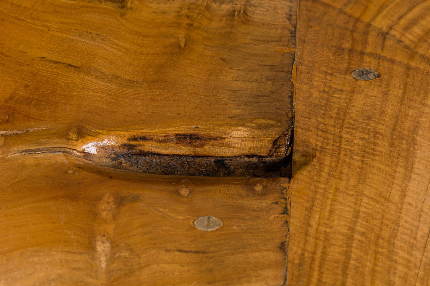 Contemporary Rustic console table with a long rectangular planed natural wood top with a live bottom edge resting on a natural tree root base, finished with a clear lacquer.