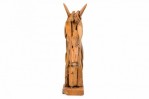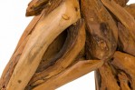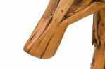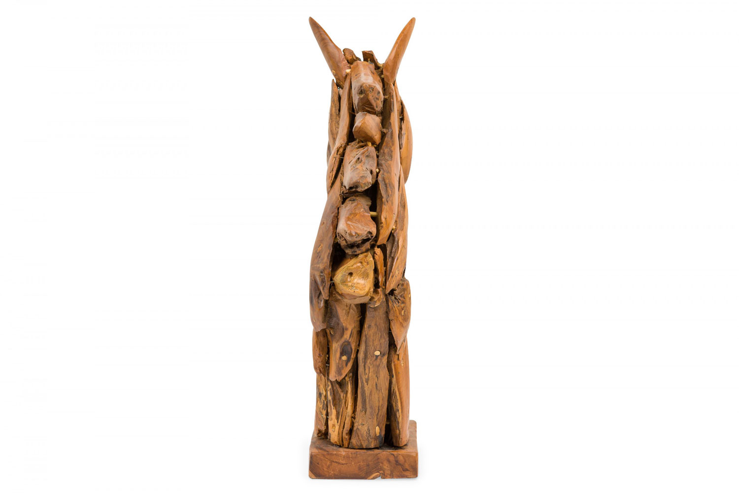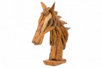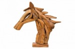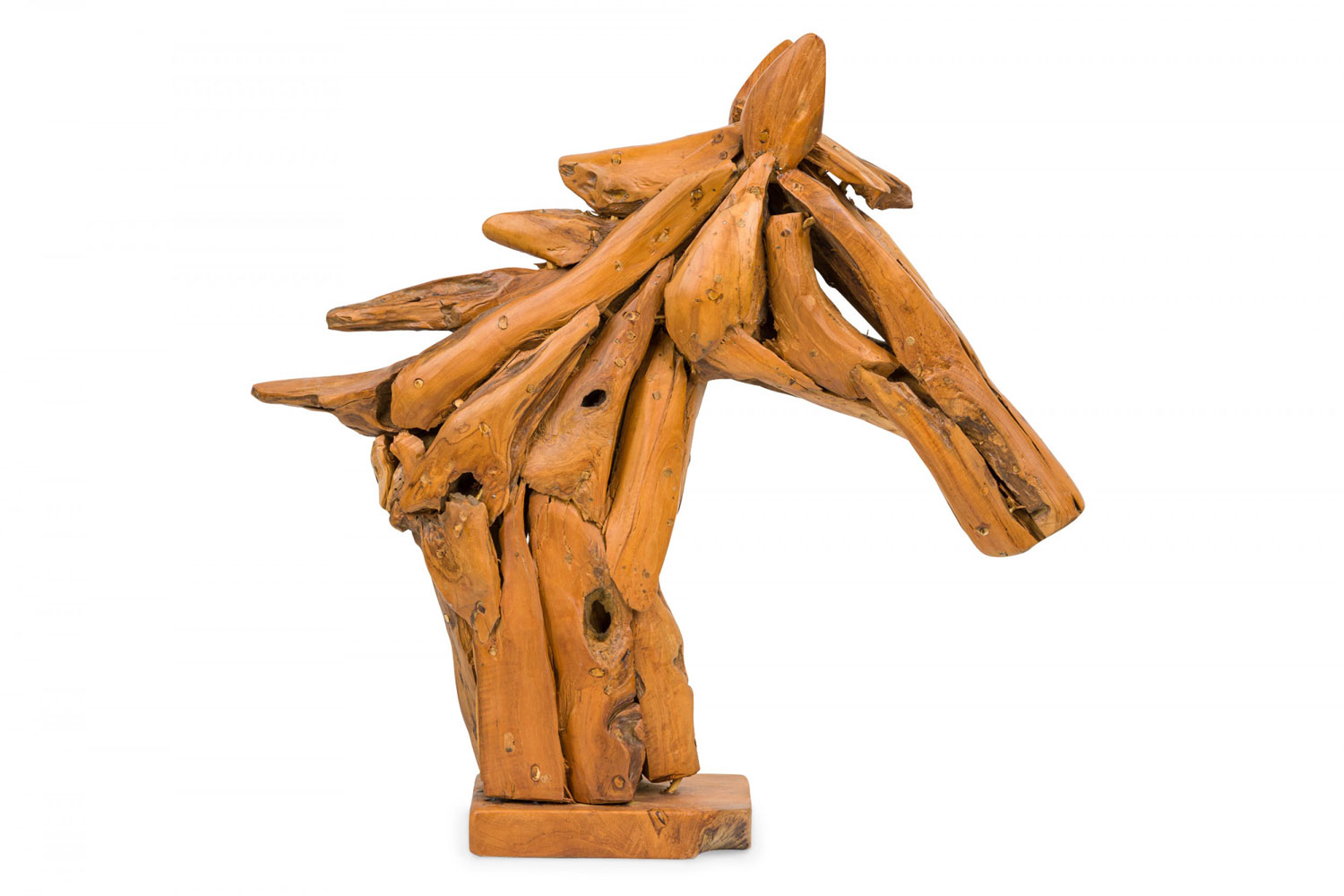 Rustic horse head sculpture made of pieces of teak wood secured on a rectangular foot.