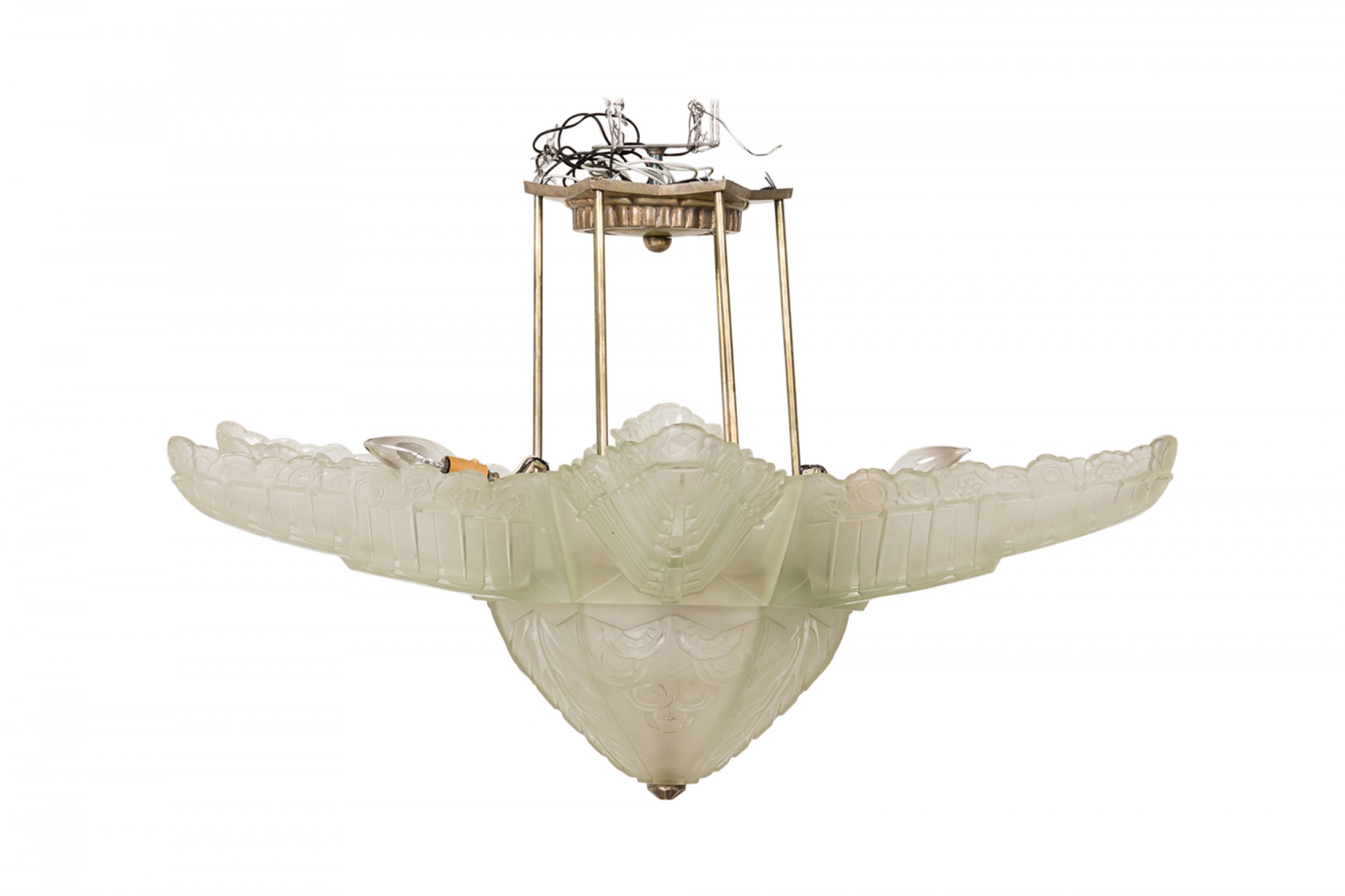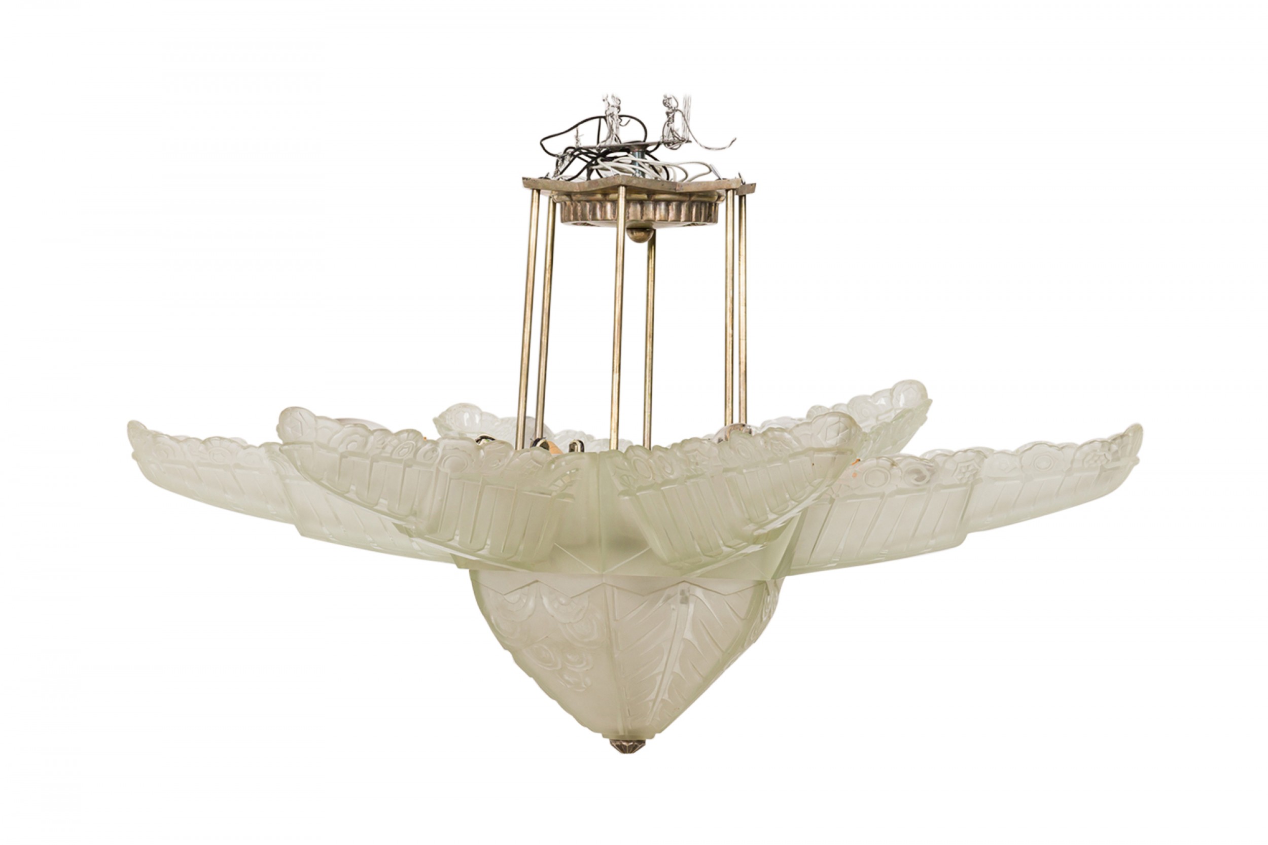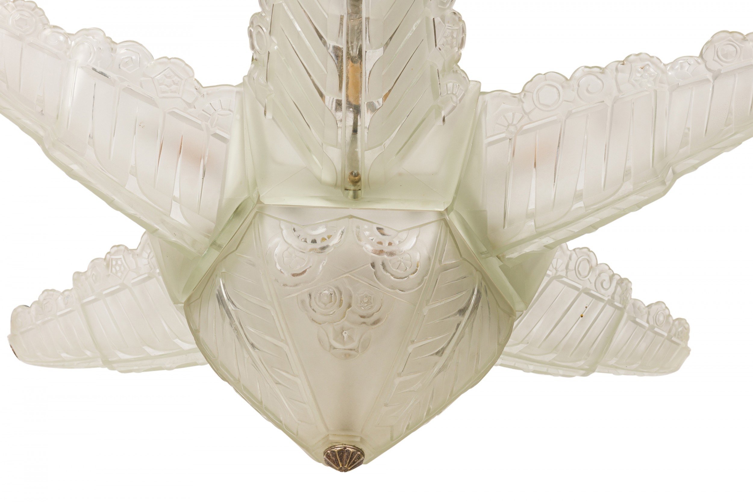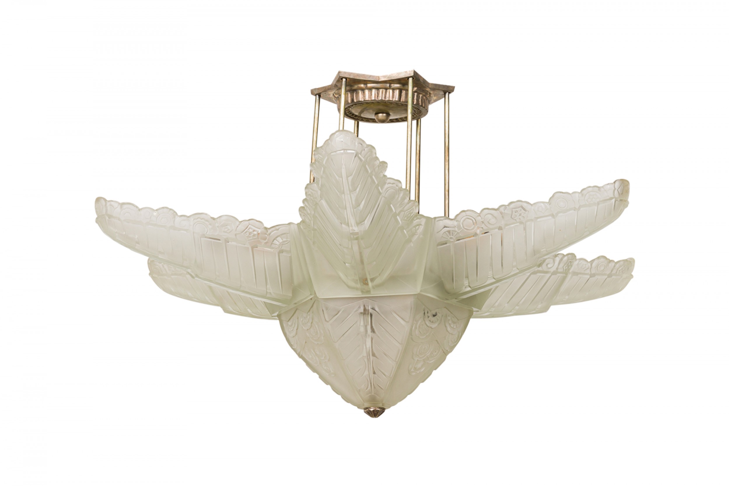Art Deco (1940s) French frosted glass chandelier in flower / star form consisting of six stylized frosted glass leaves molded in a repoussé of alternating chevron / curvature patterns, emanating above a starburst base capped by a geometric circular metal bottom finial (Glass signed: SABINO) (similar to Inv. #044265)
