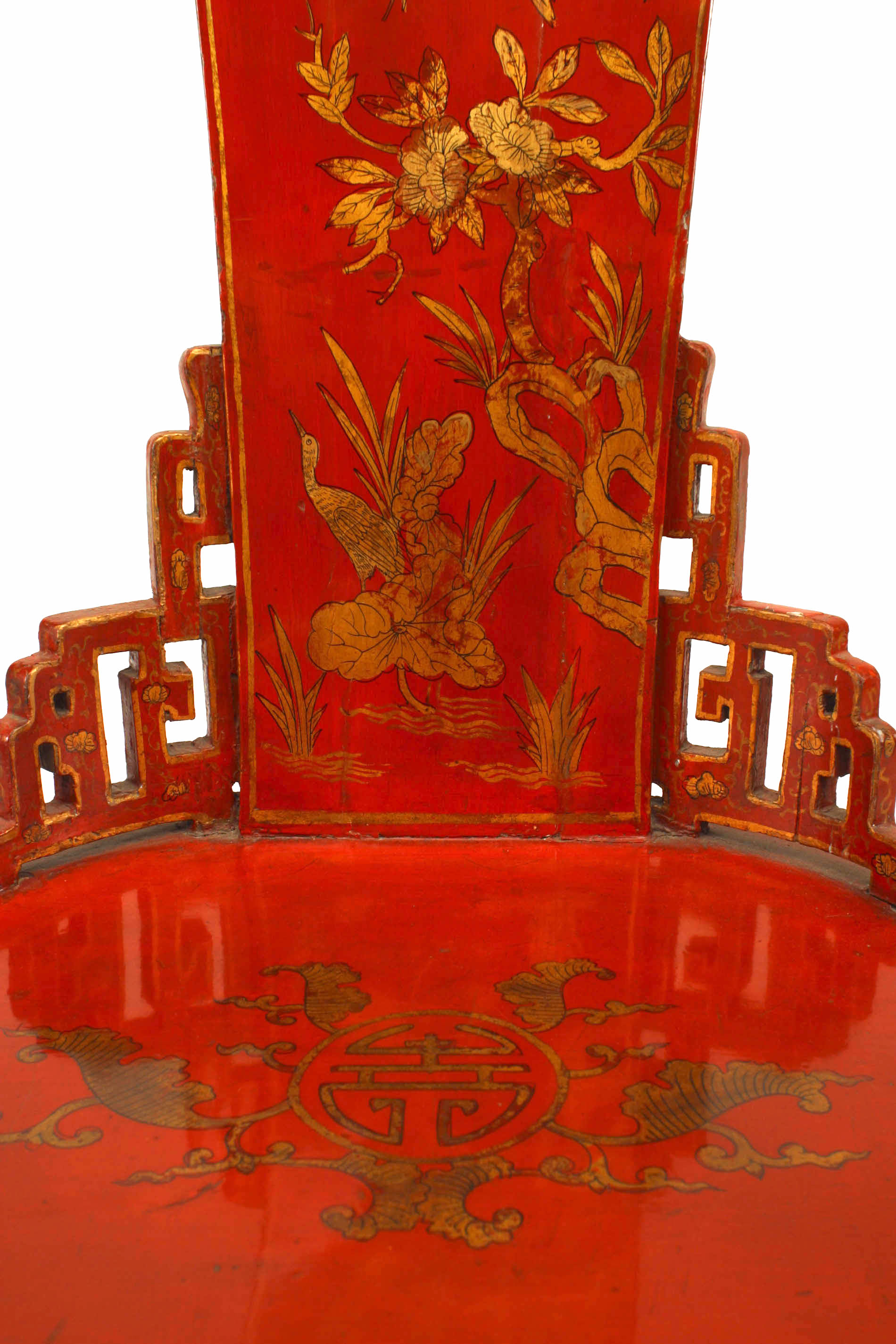 PAIR of Asian Chinese (19th Cent) red and gilt lacquered side chairs with filigree sides and back (PRICED PER PAIR) (matching table #032840).