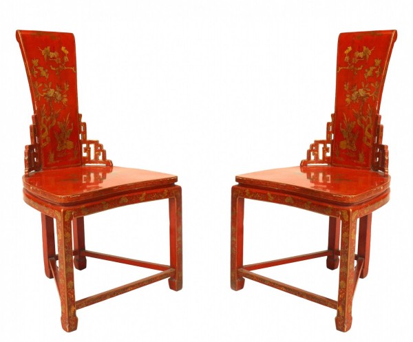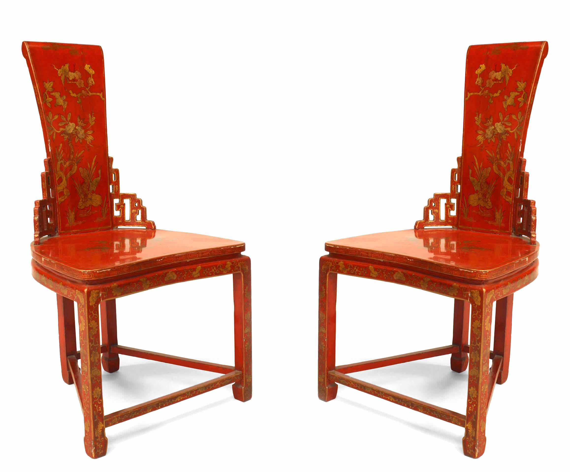 PAIR of Asian Chinese (19th Cent) red and gilt lacquered side chairs with filigree sides and back (PRICED PER PAIR) (matching table #032840)