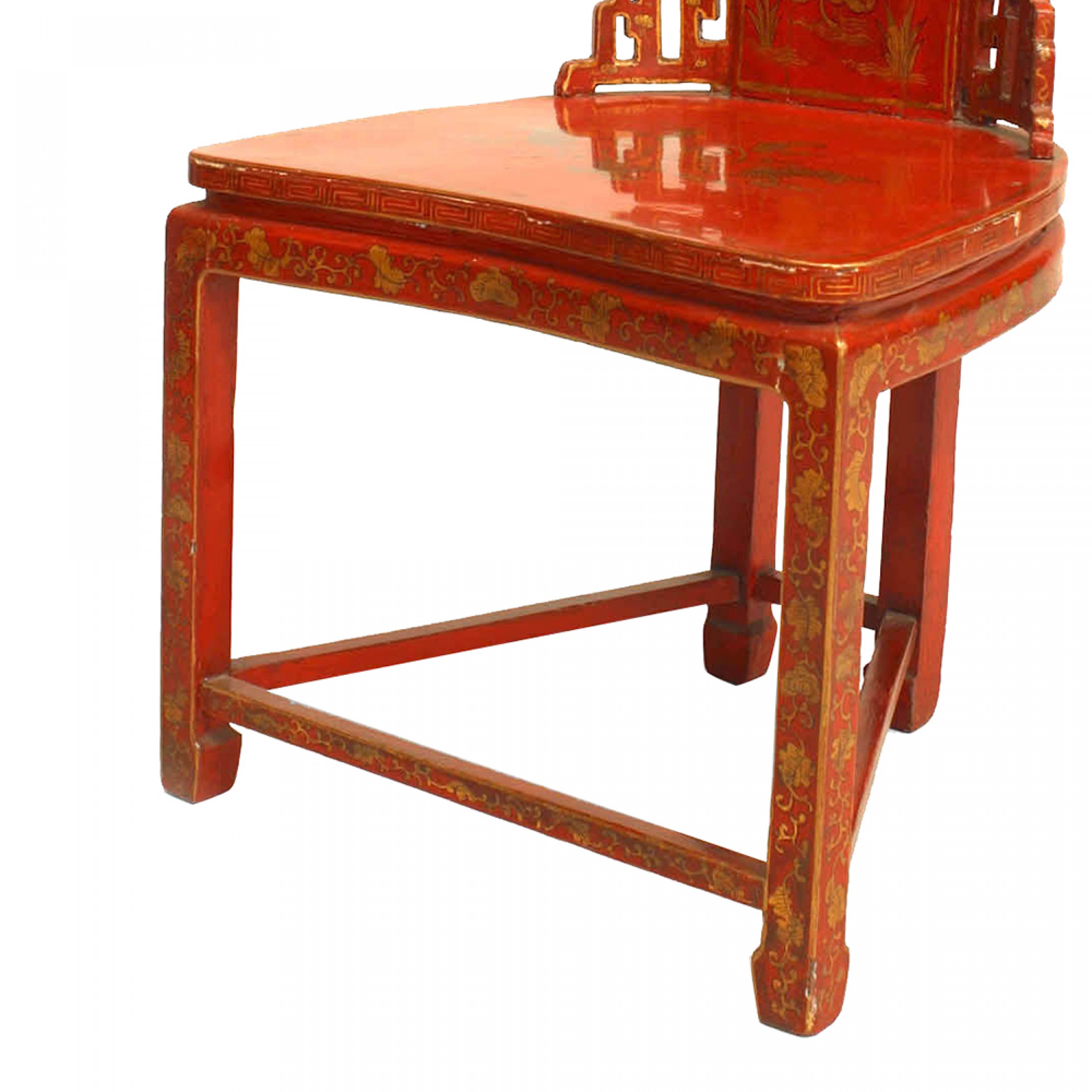 PAIR of Asian Chinese (19th Cent) red and gilt lacquered side chairs with filigree sides and back (PRICED PER PAIR) (matching table #032840)