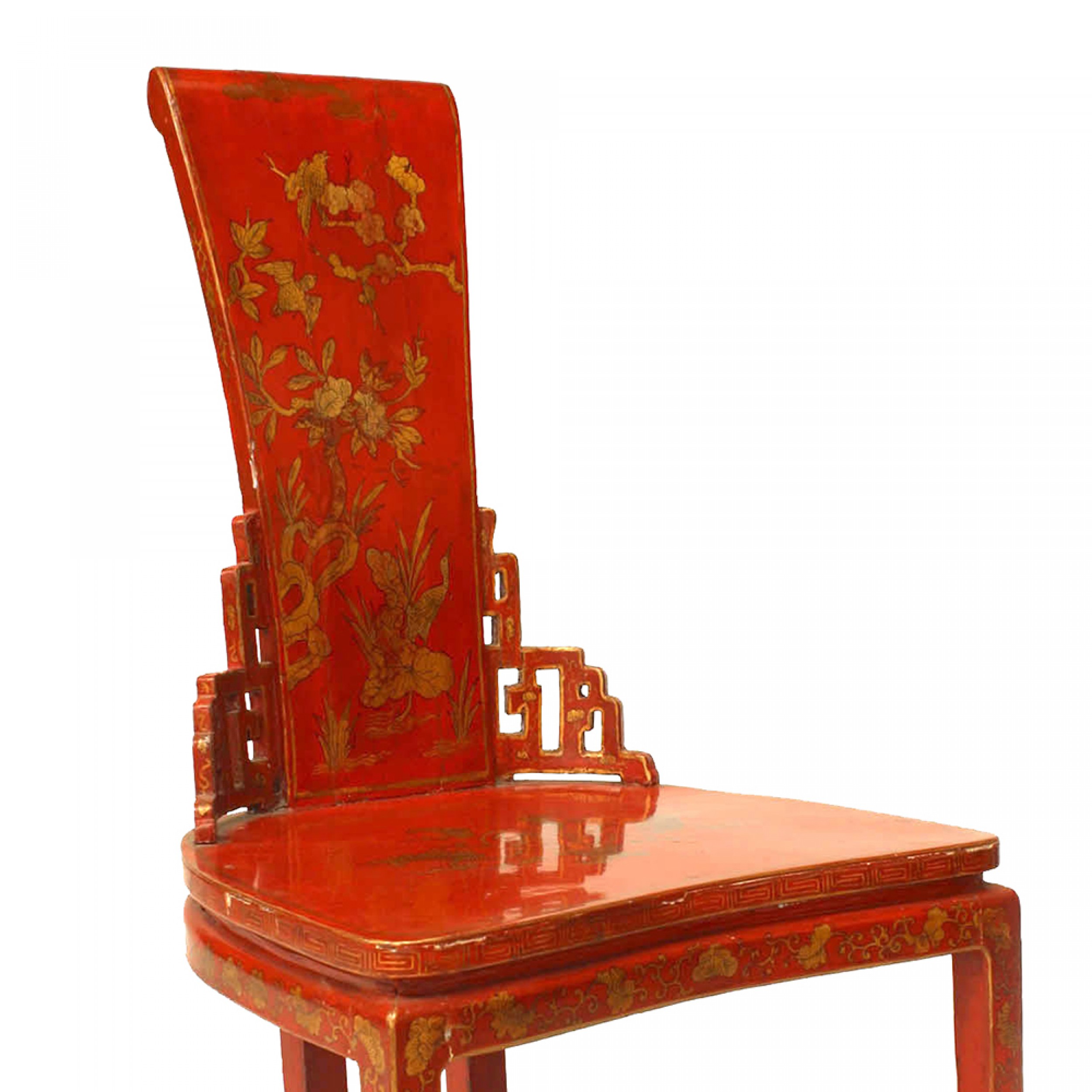 PAIR of Asian Chinese (19th Cent) red and gilt lacquered side chairs with filigree sides and back (PRICED PER PAIR) (matching table #032840).