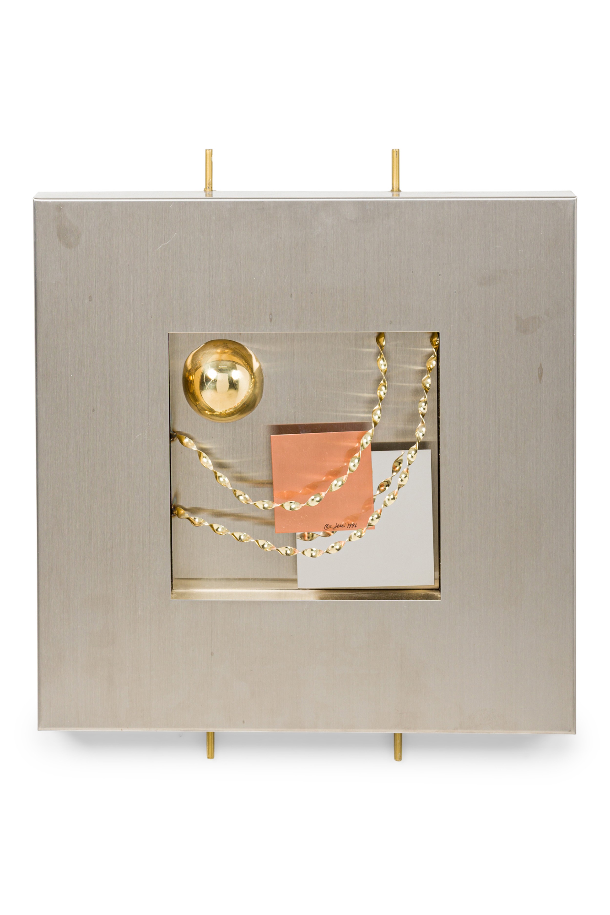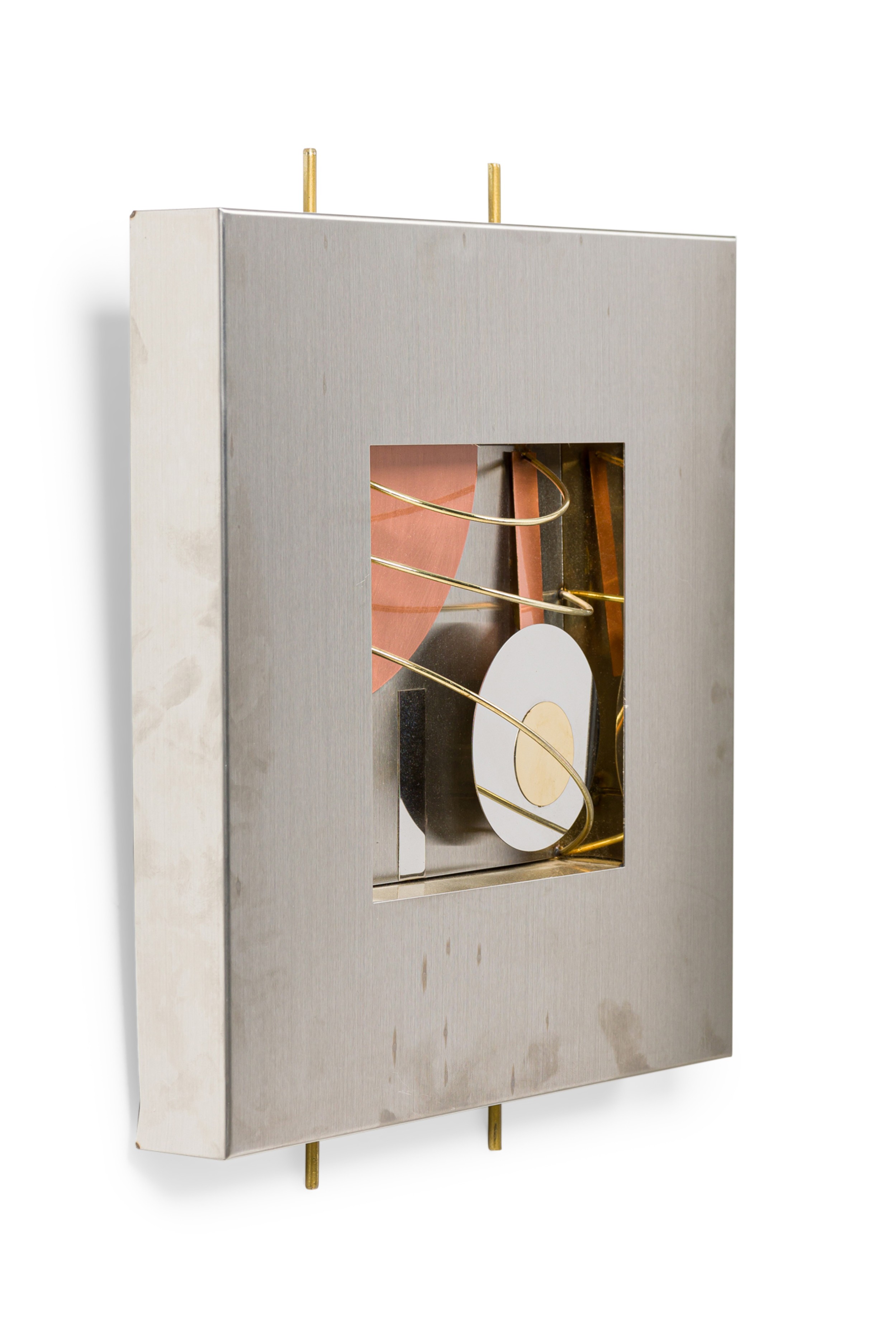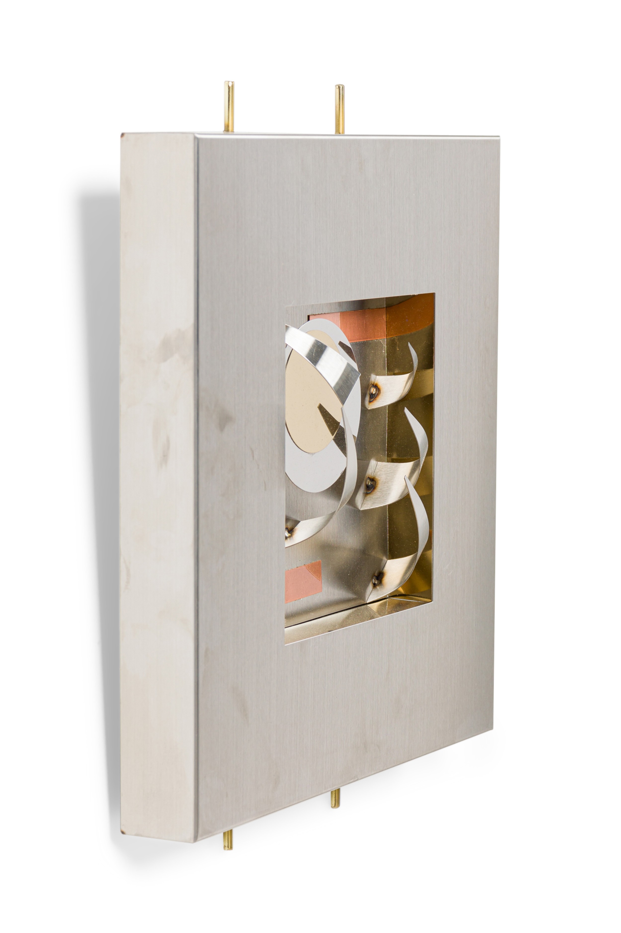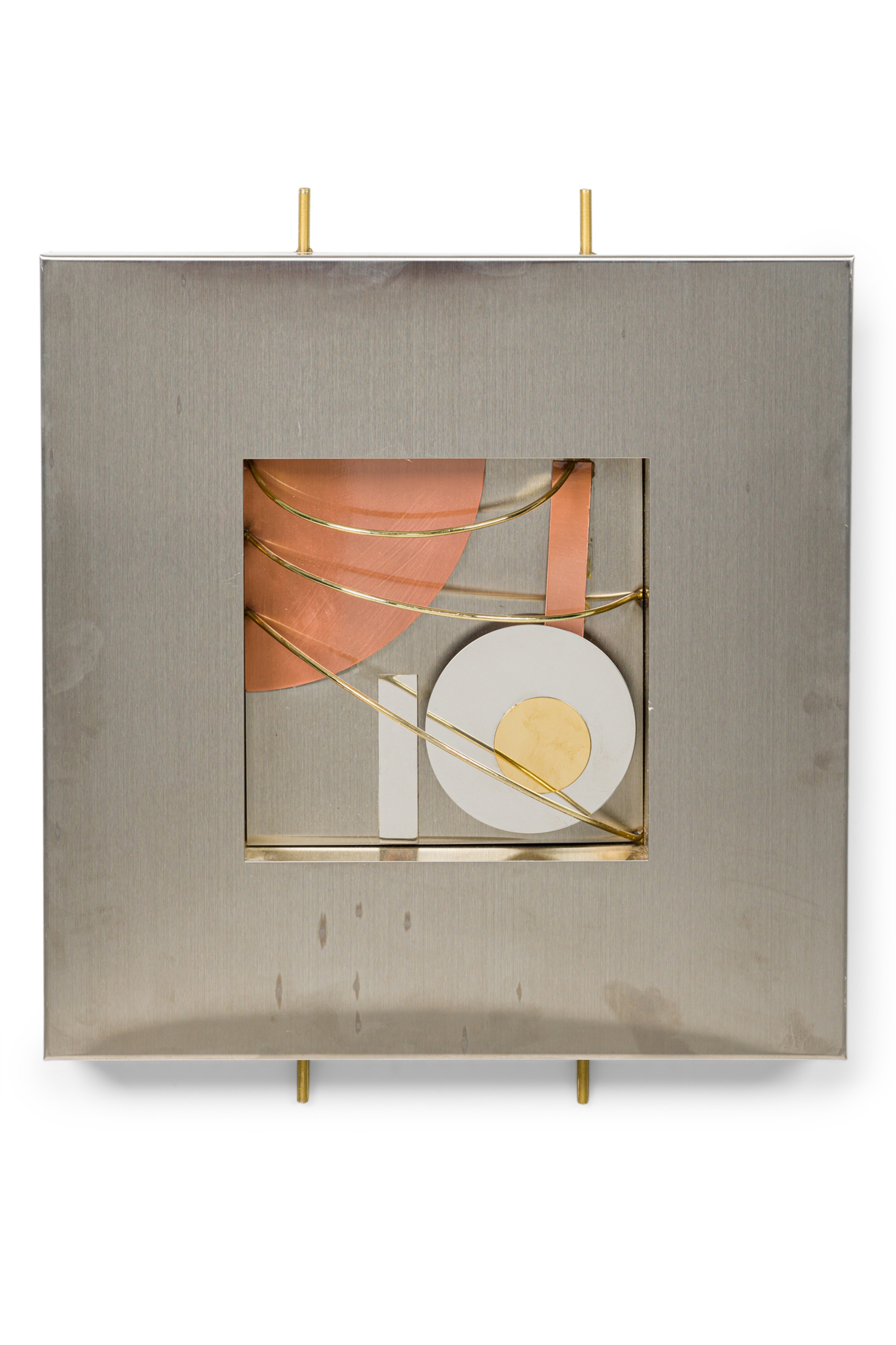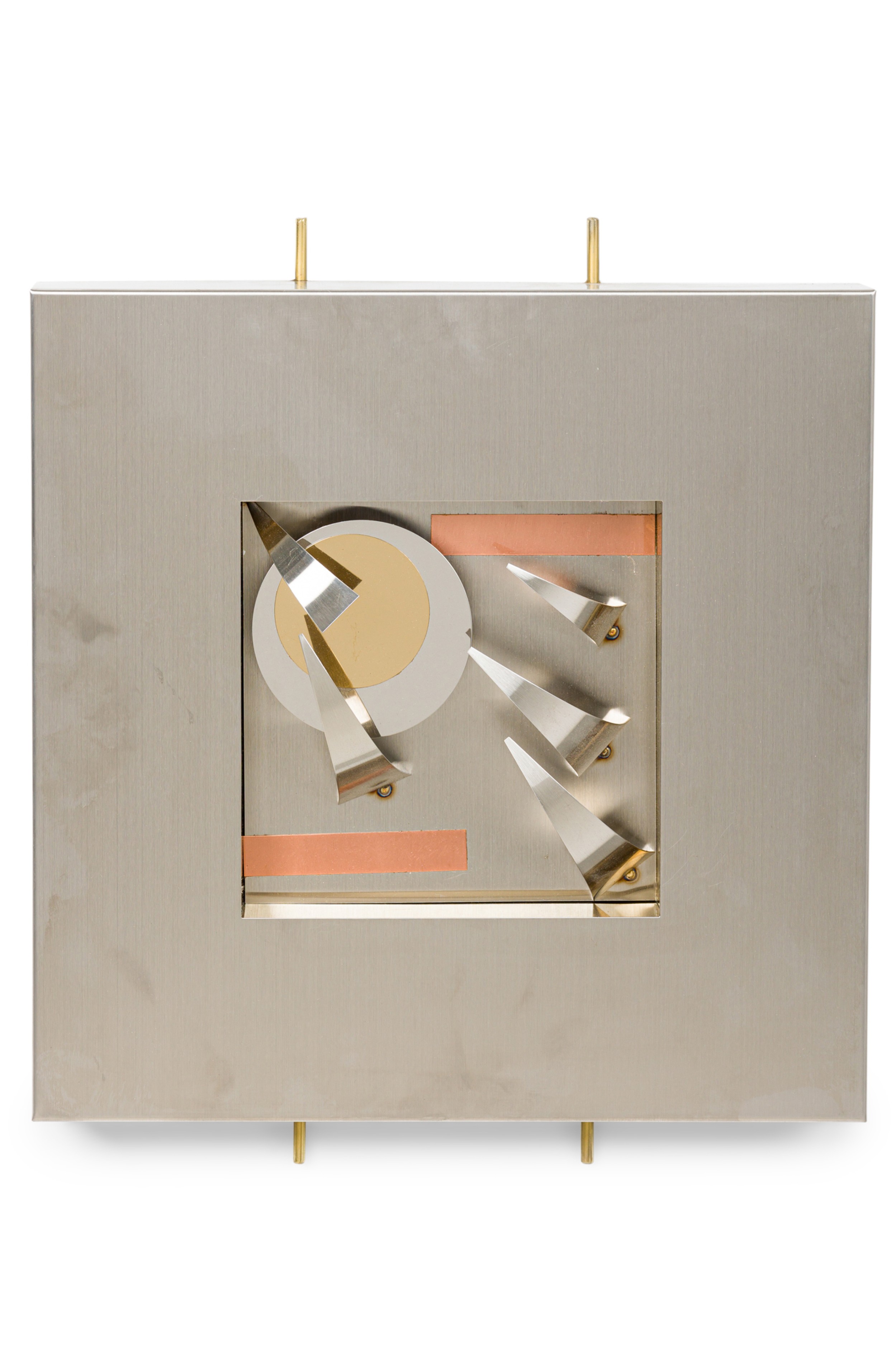 SET 4 American Modern Stainless Steel Square Wall plaques with 2 brass textending rods in the back and having a central square brass, copper, and steel geometric abstract sculpture, (CURTIS JERE) (PRICCED AS SET)