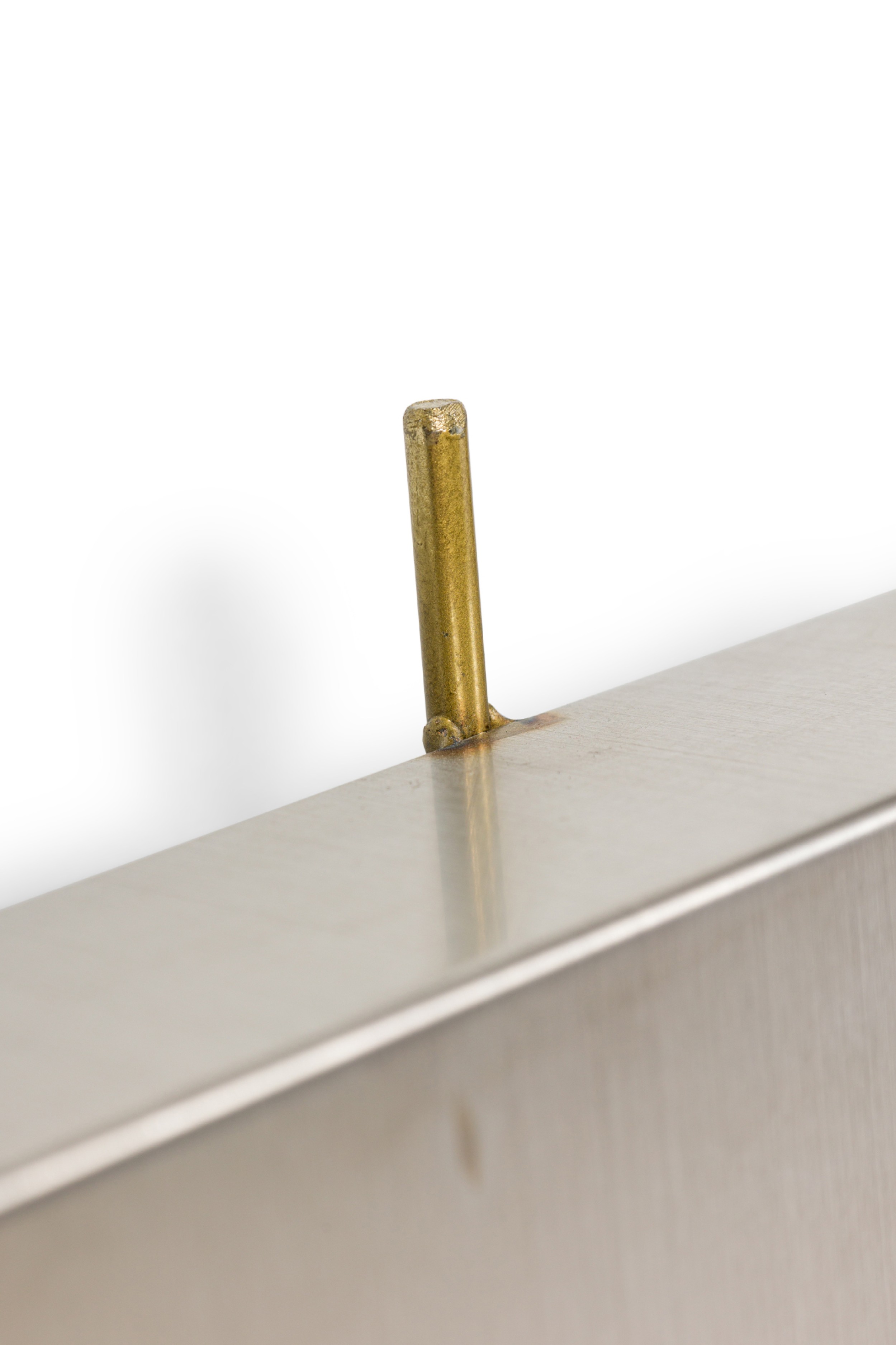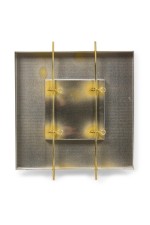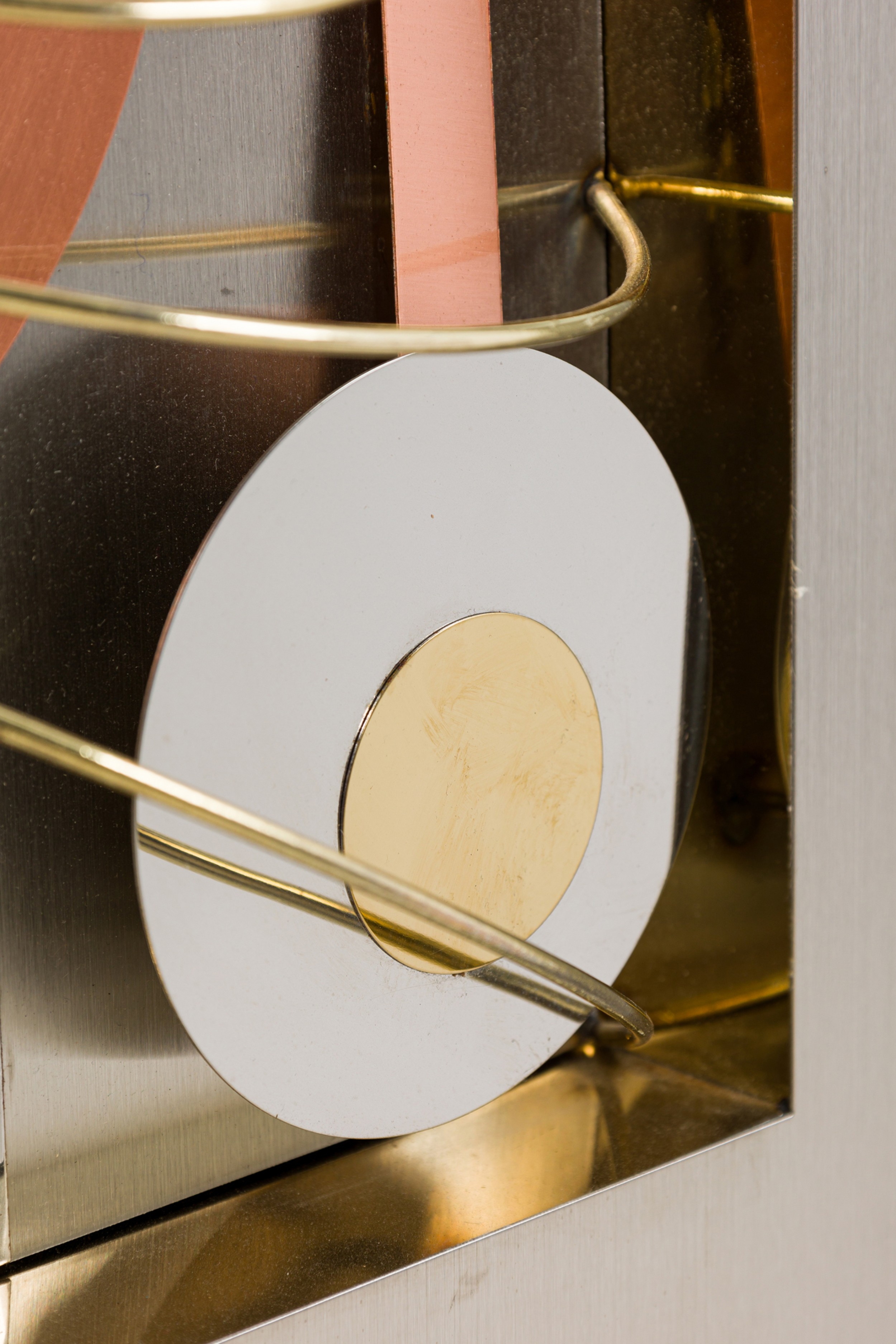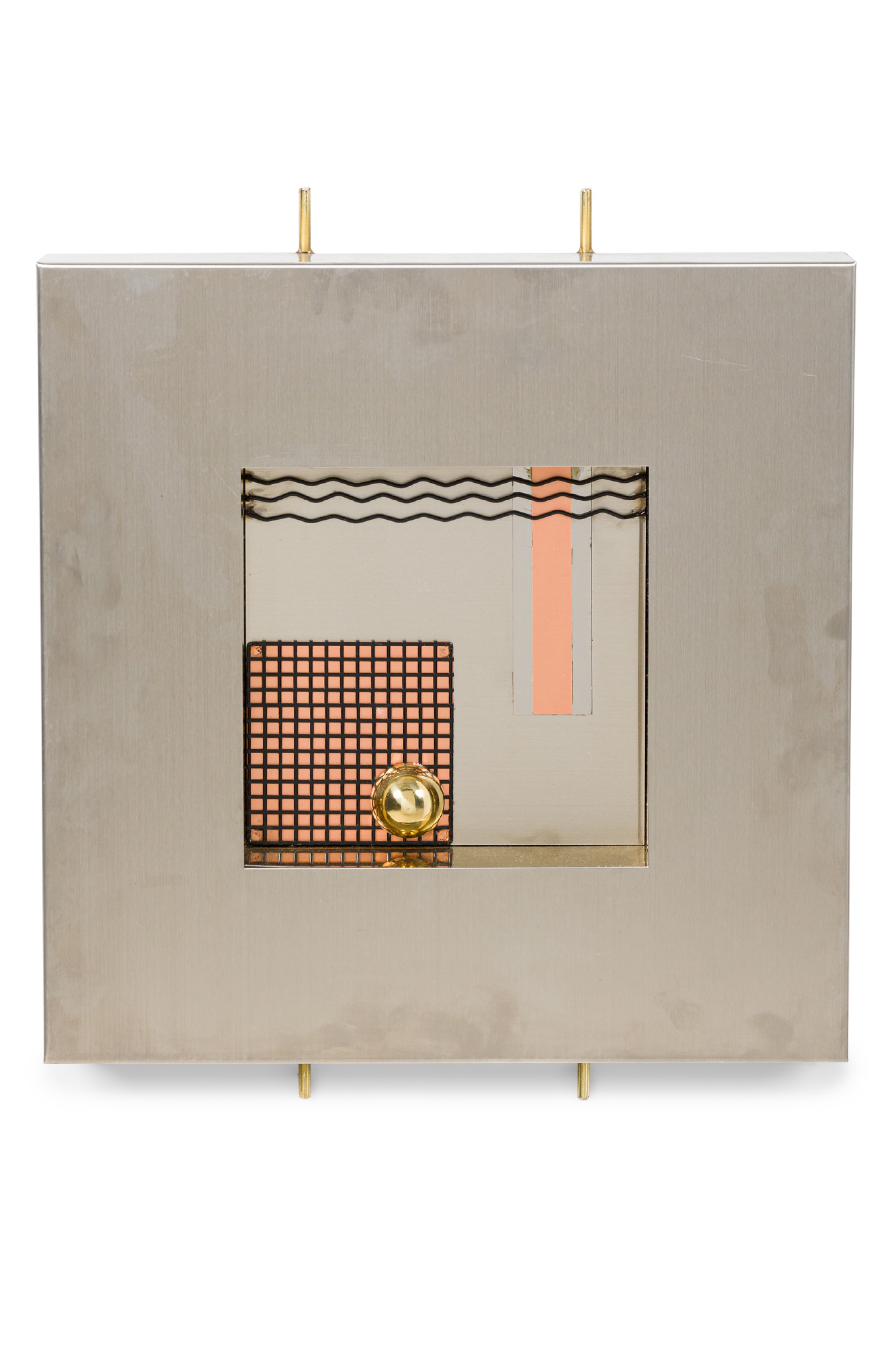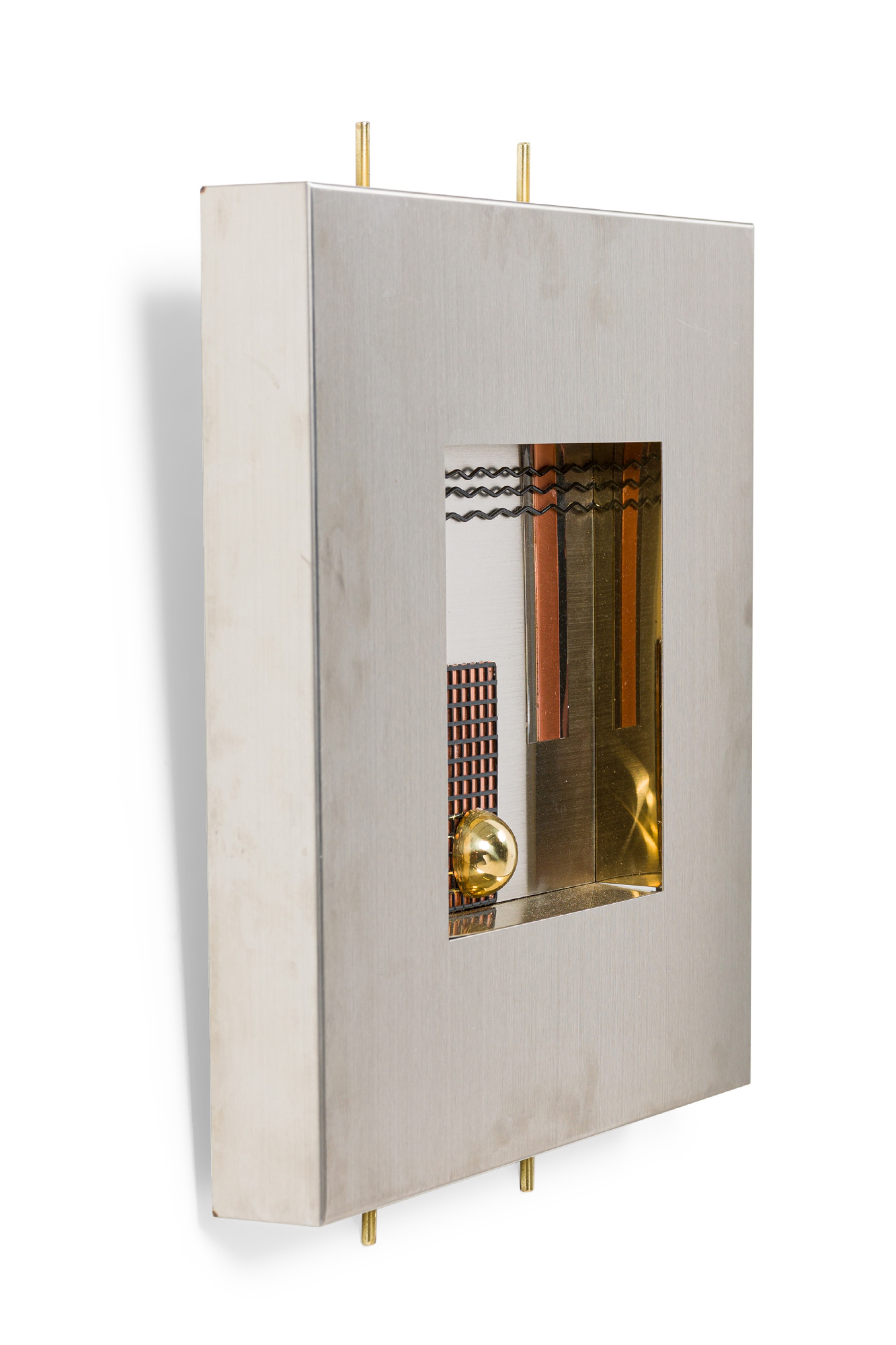 SET 4 American Modern Stainless Steel Square Wall plaques with 2 brass textending rods in the back and having a central square brass, copper, and steel geometric abstract sculpture, (CURTIS JERE) (PRICCED AS SET)