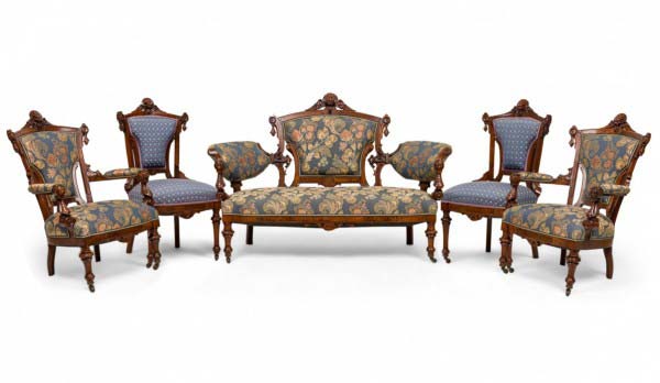 American Victorian filigree carved & laminated rosewood 5 piece salon set (STANTON HALL pattern, J & JW MEEKS) (Available individually: settee 044029A: 66"w 33"d 50½"h, 2 arm chairs 044029B: 27½"w 33"d 47"h, 2 side chairs 044029C