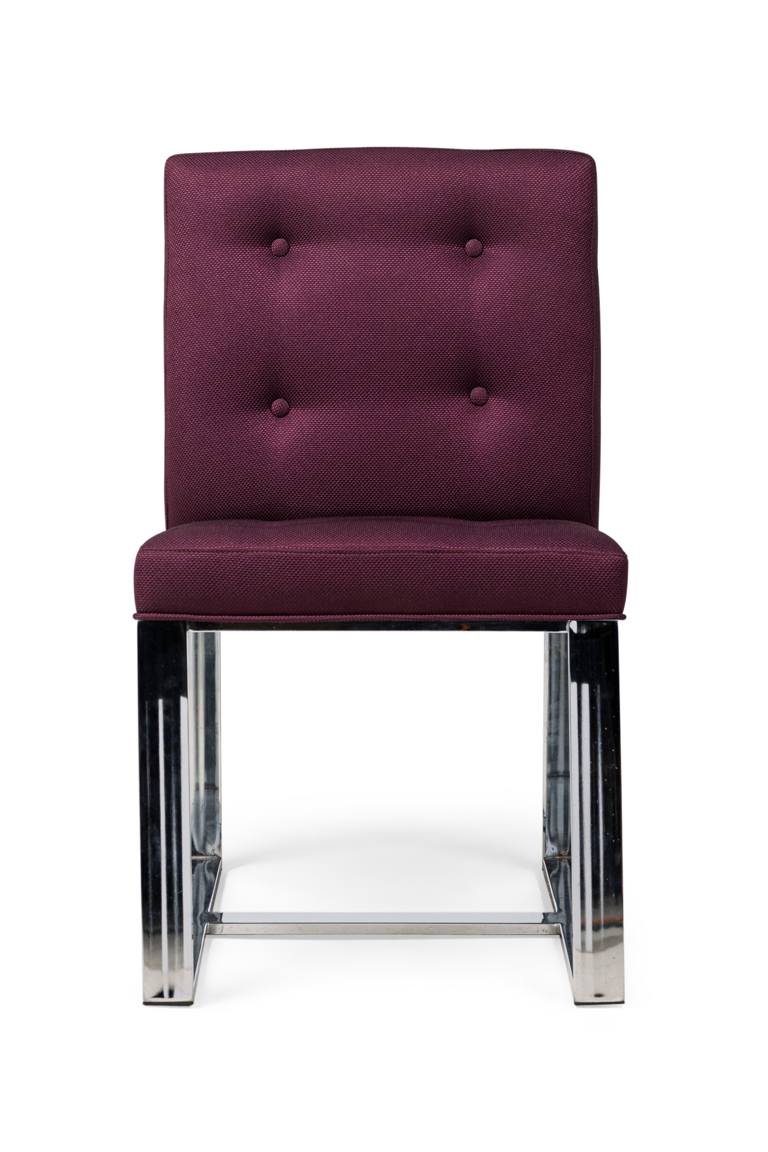 SET of 10 American Mid-Century dining / side chairs with flat bar polished stainless steel frames, upholstered in a textured purple fabric with button tufted backs. (MILO BAUGHMAN) (PRICED AS SET).