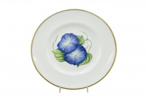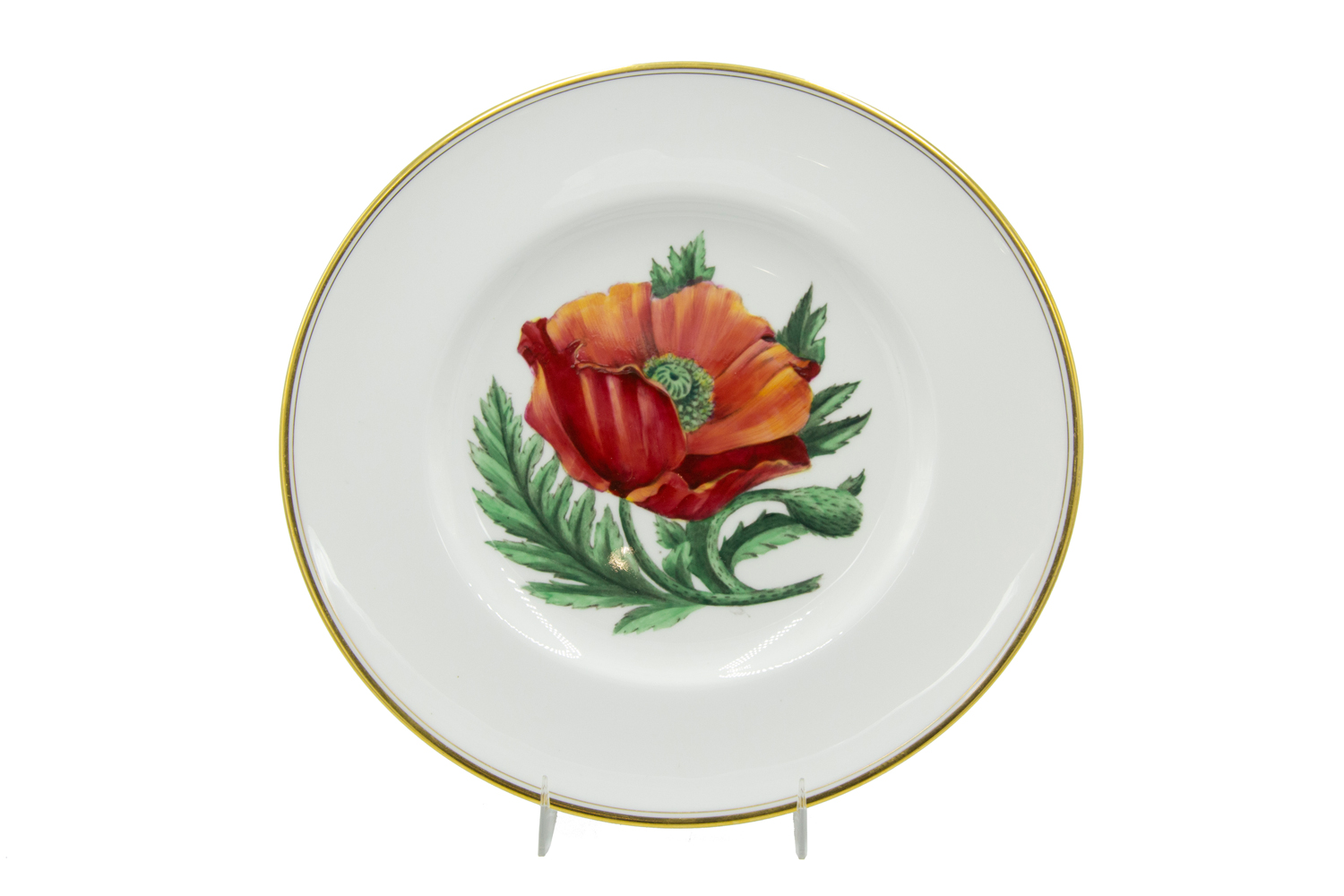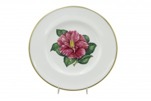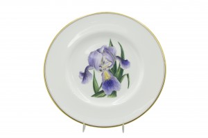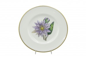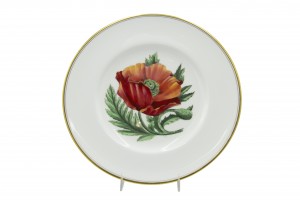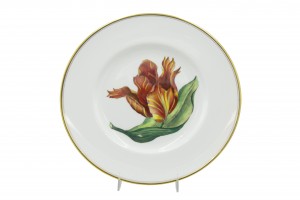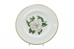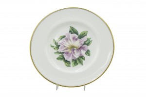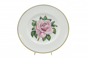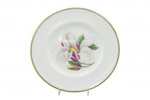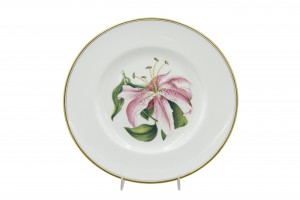 Set of 12 English Victorian white porcelain dinner plates with gold edge and individual flower center (Royal Worcester) (PRICED AS SET)