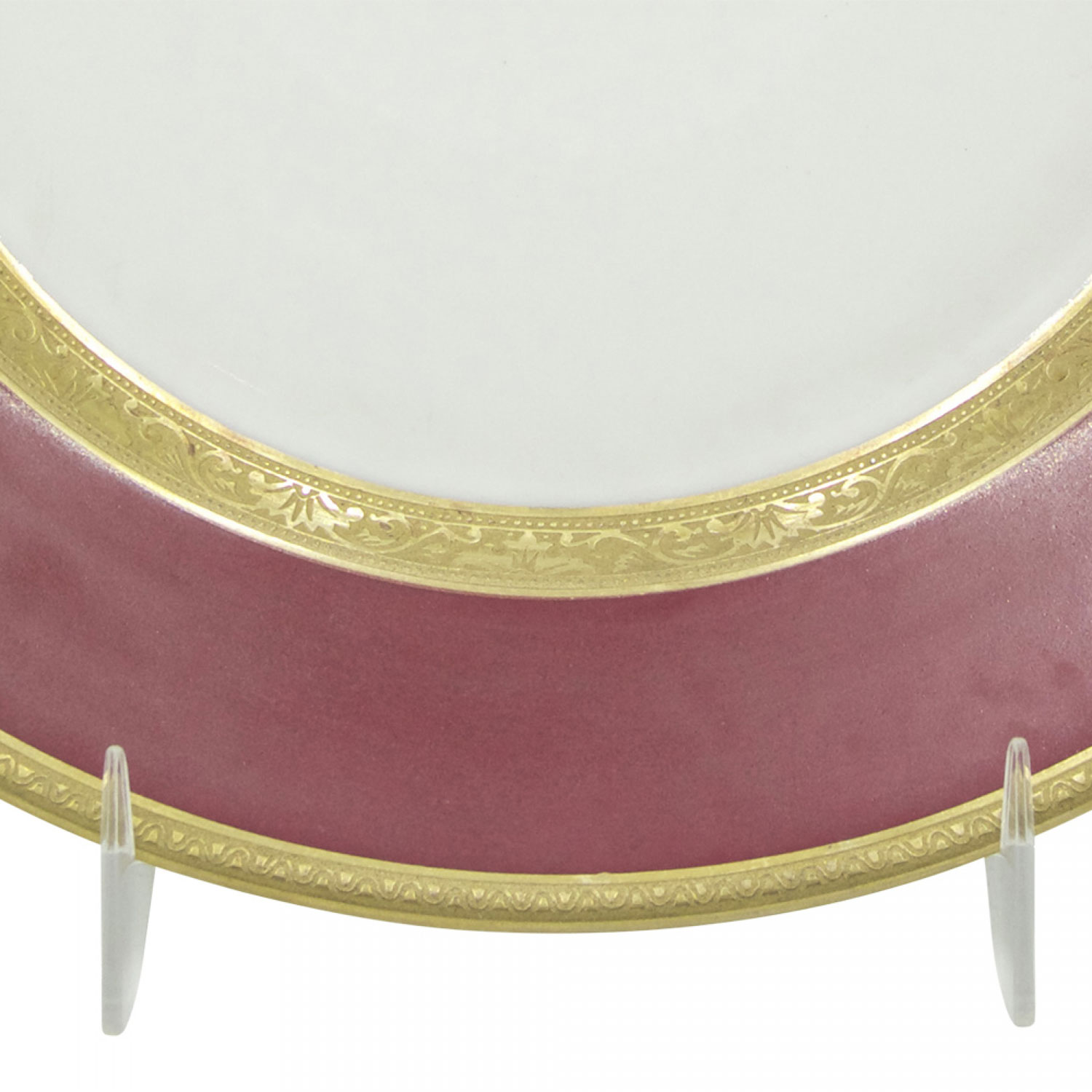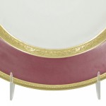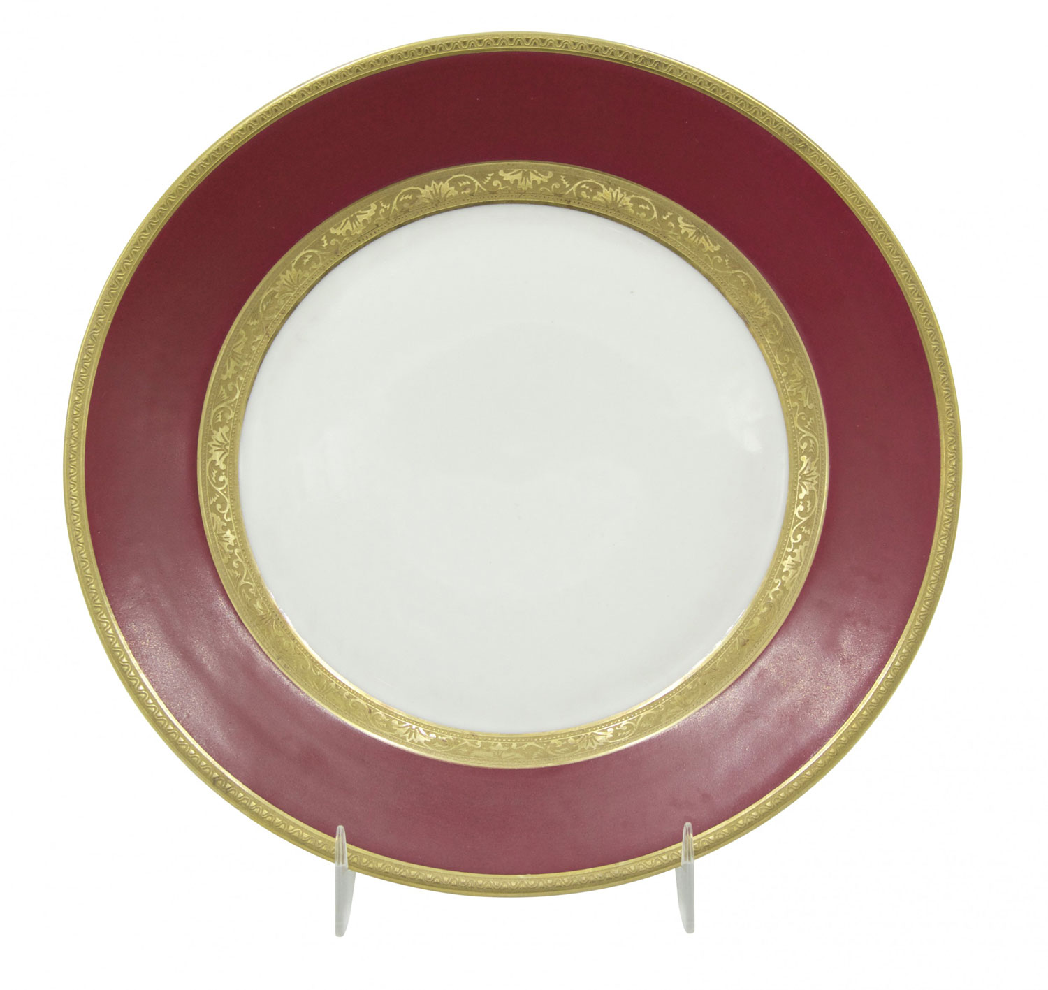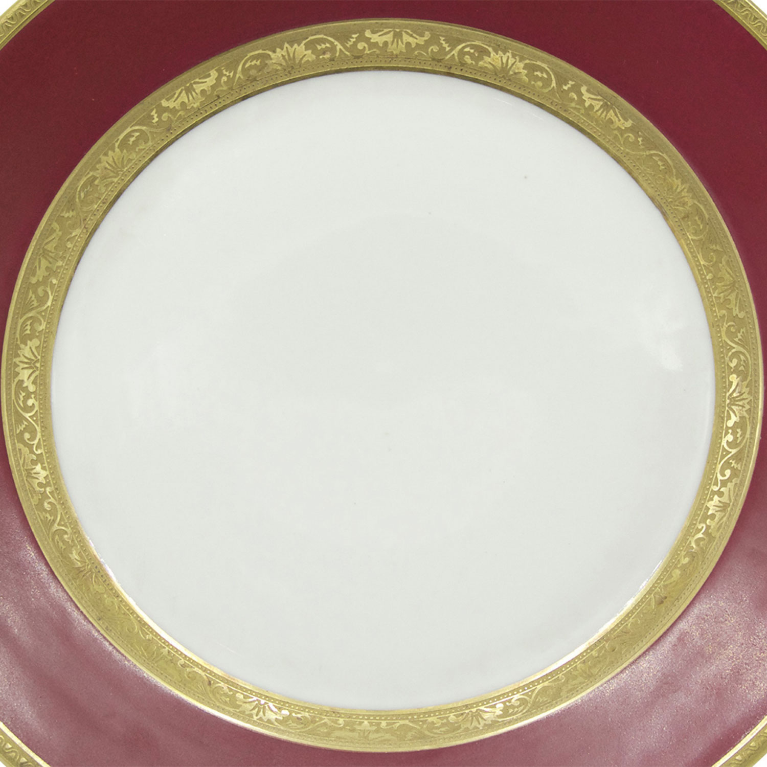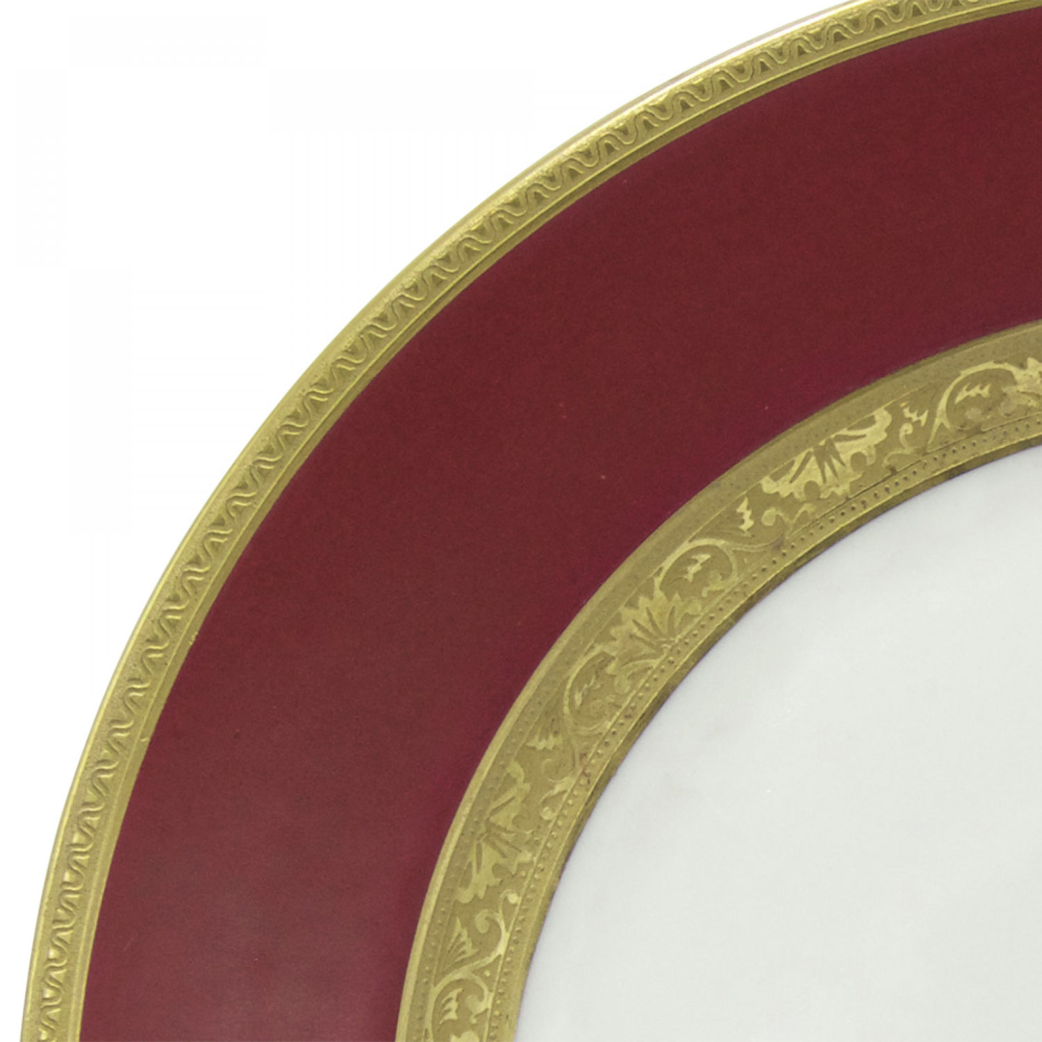 Set of 12 French Victorian red and white Limoges porcelain plates with gold trim. (PRICED AS SET).