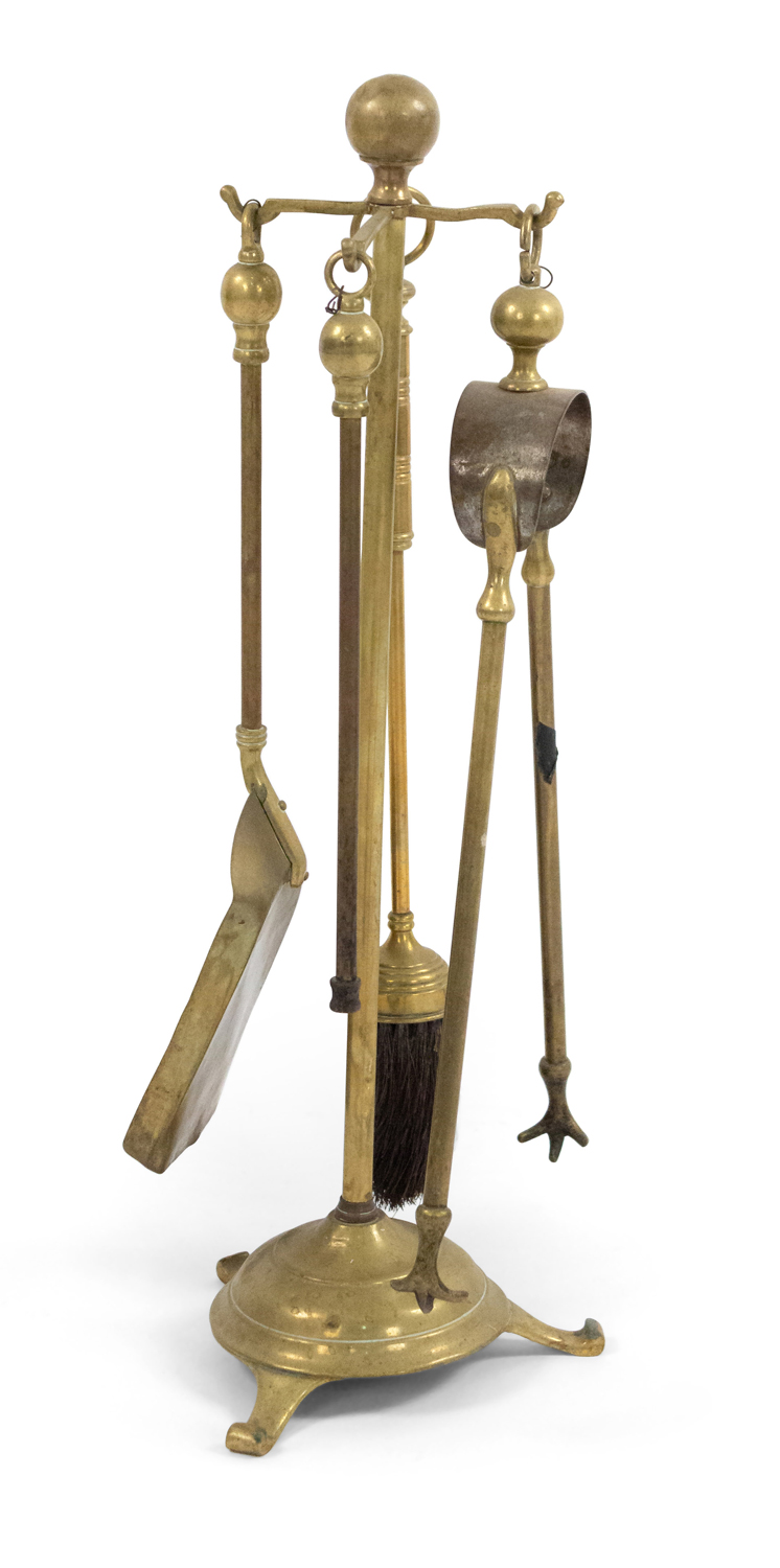Set of 3 American Country-style (20th Century) brass fire tools with ball top in stand with round base and 3 legs.