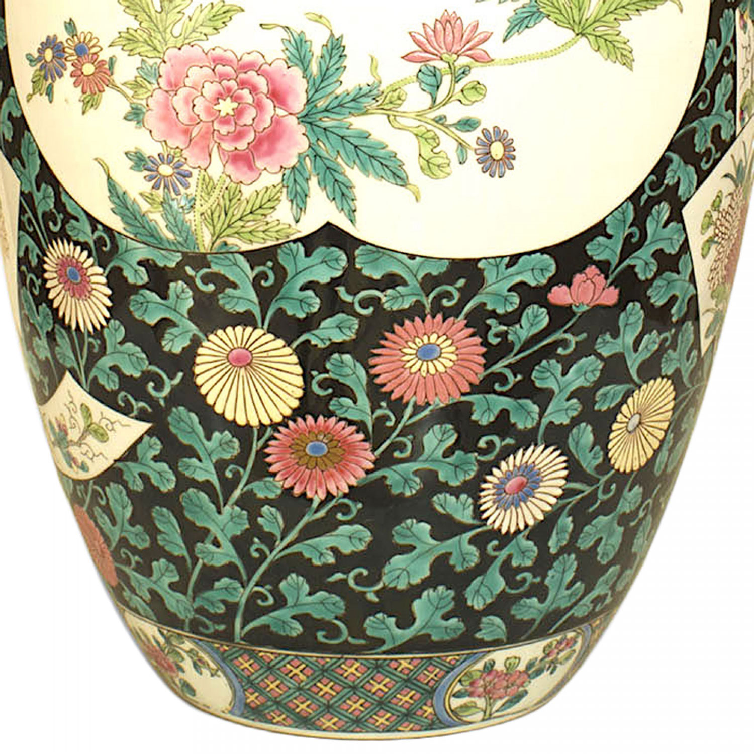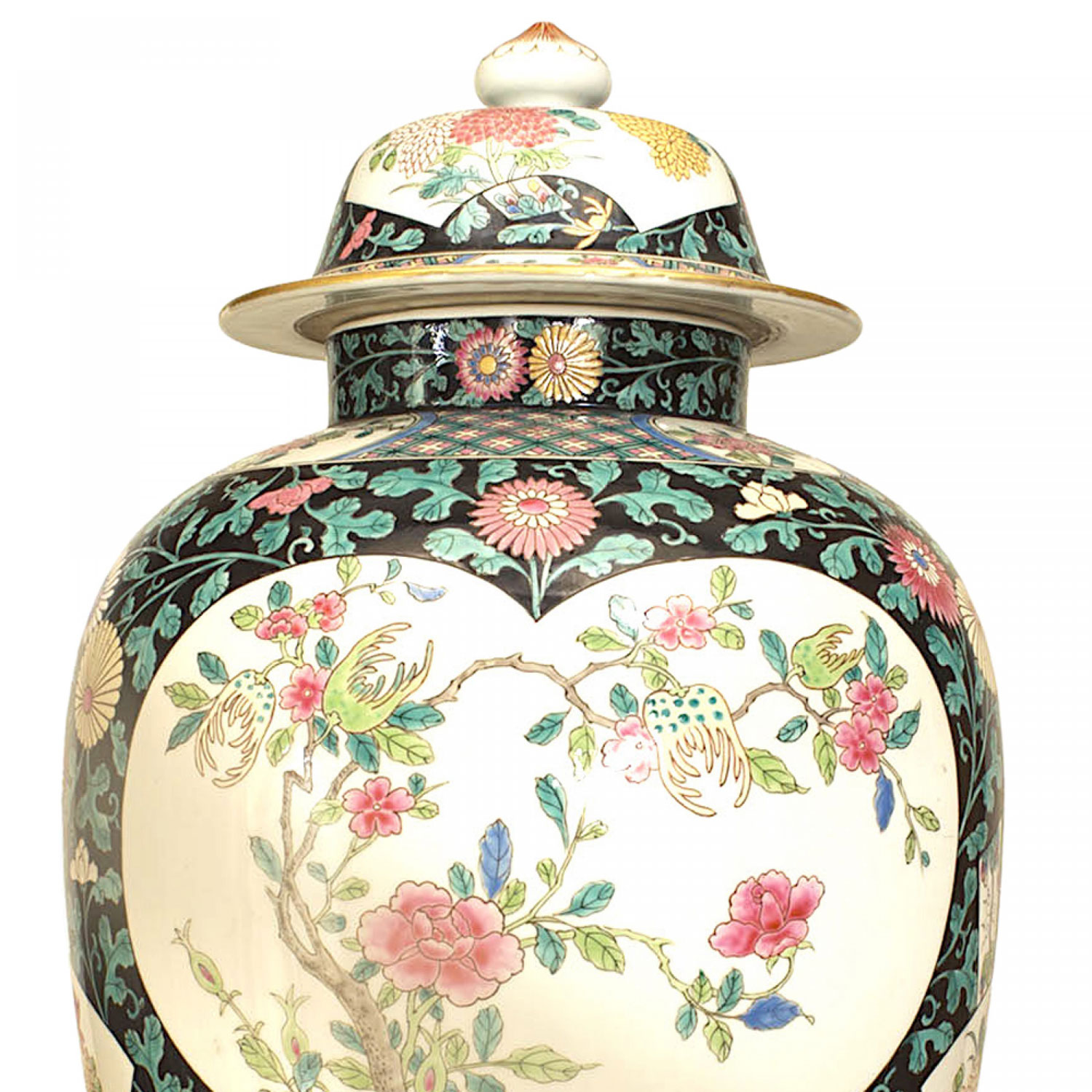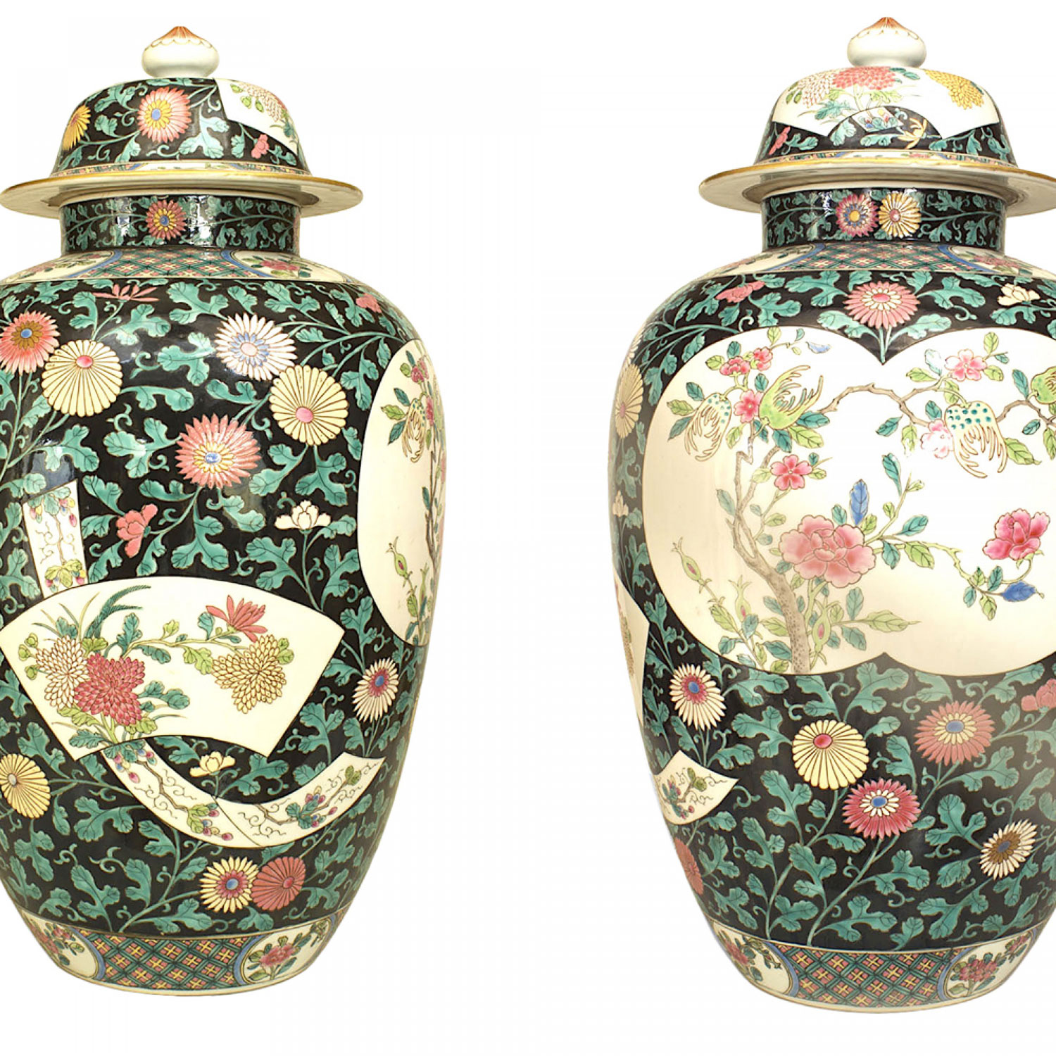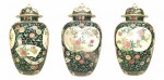 SET of 3 Asian Chinese style black and white temple jars with covers having green and pink floral decoration (19/20th Cent) *One with a hairline crack. (PRICED AS SET) (matching pair of vases: HRC014).