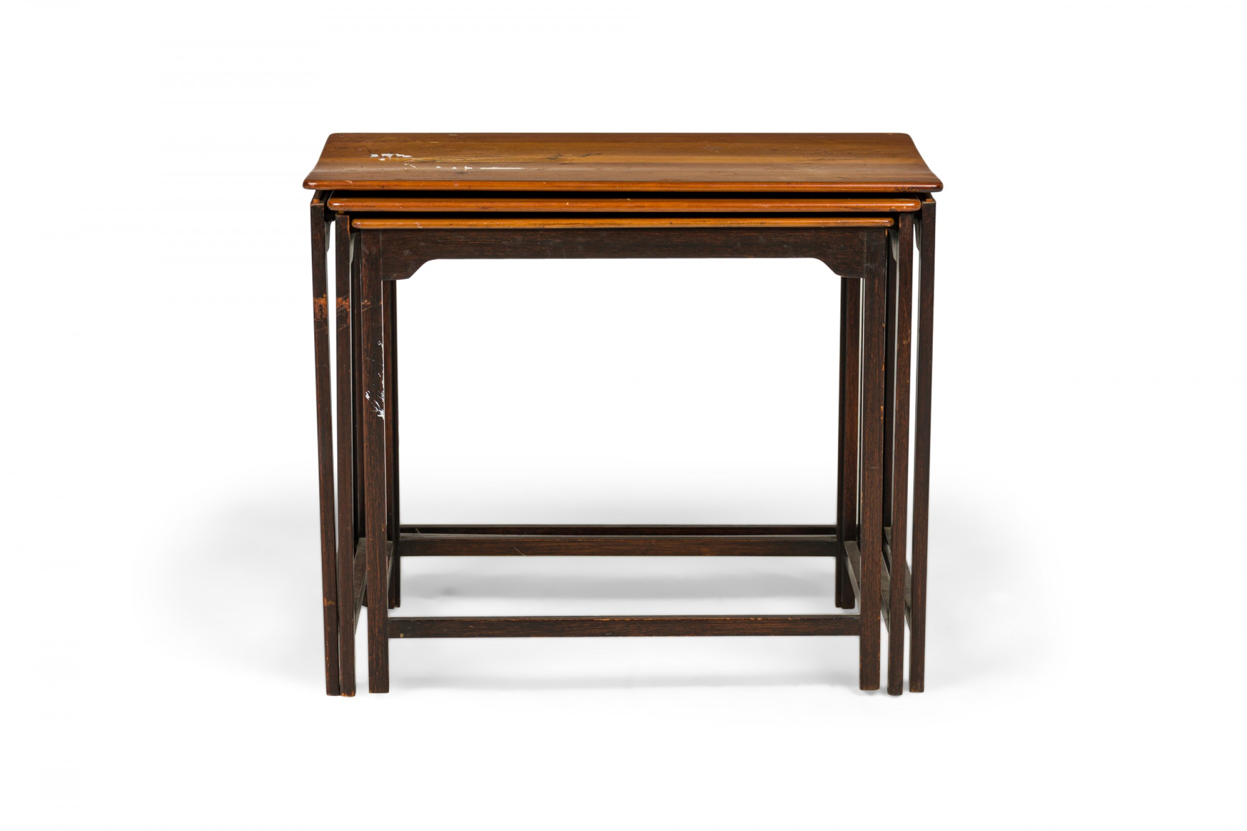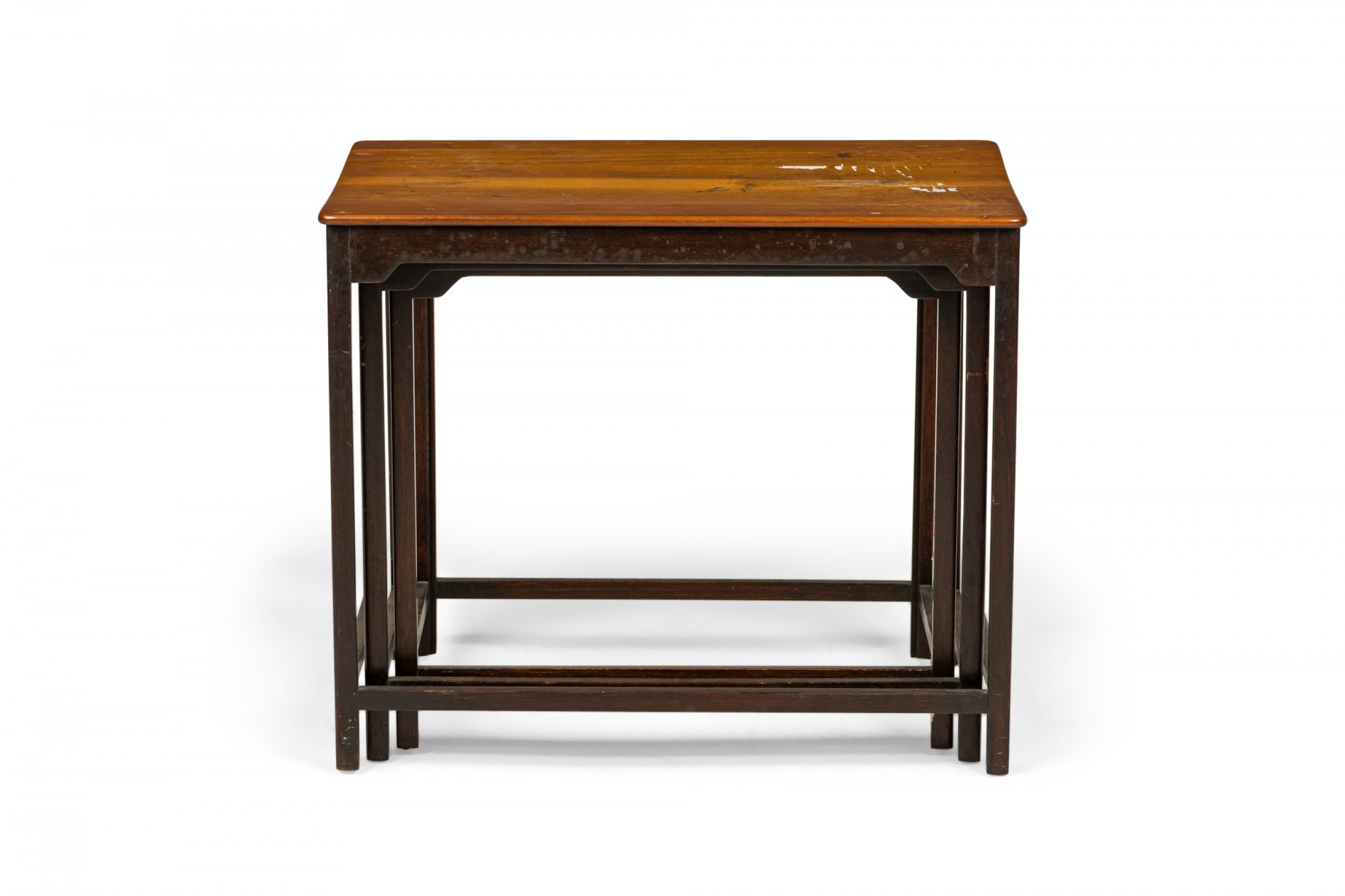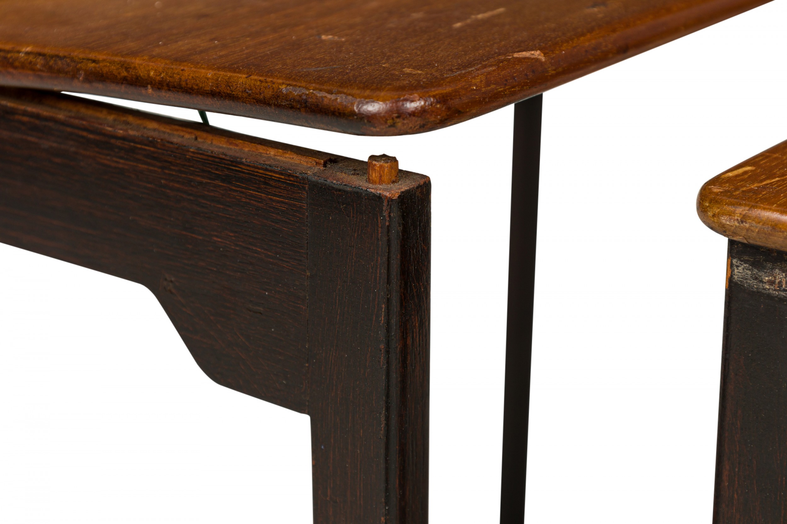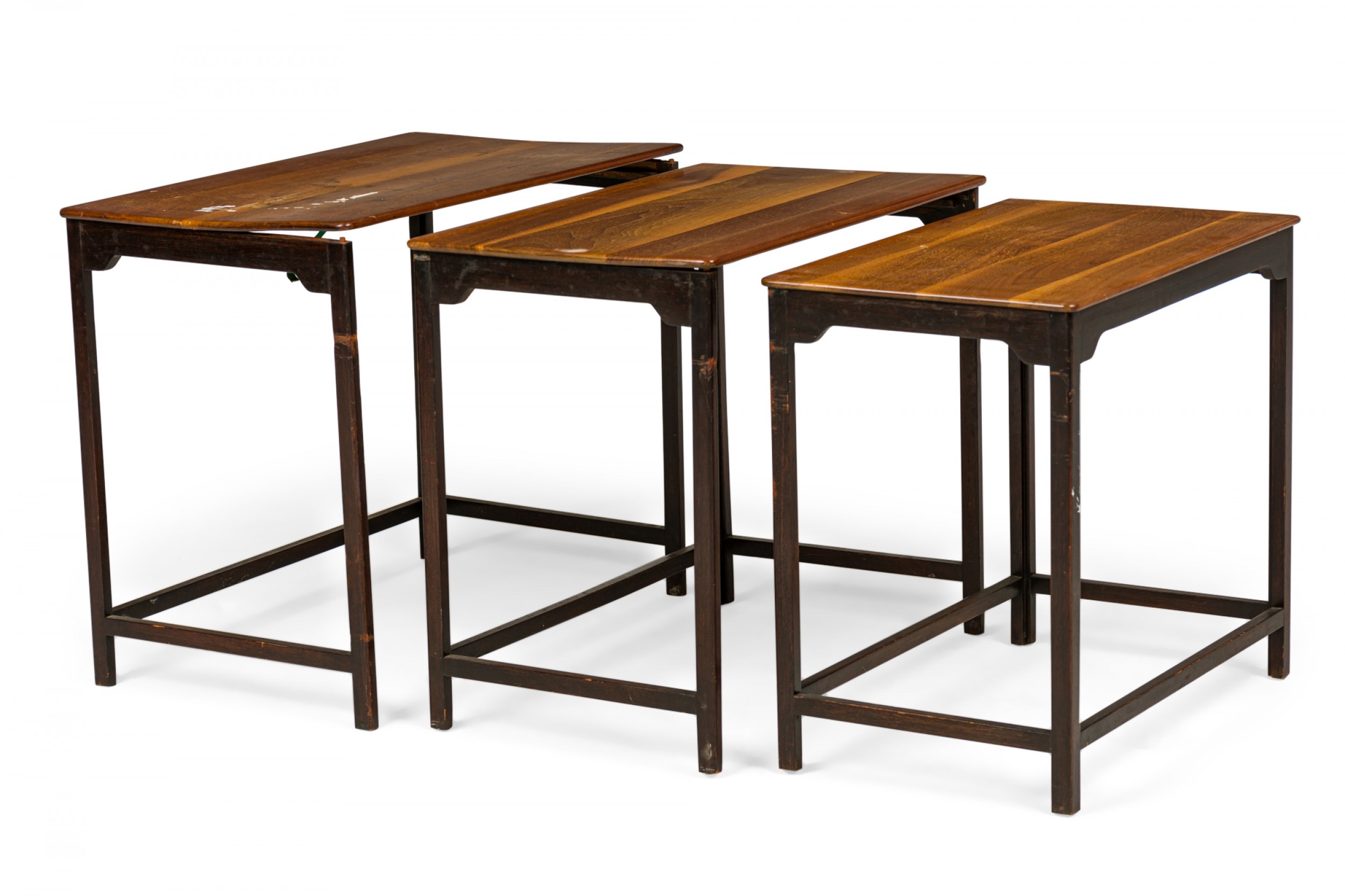 SET of 3 American Mid-Century nesting tables with finished wooden plank tops resting on iron frames. (EDWARD WORMLEY FOR DUNBAR FURNITURE COMPANY)(PRICED AS SET).