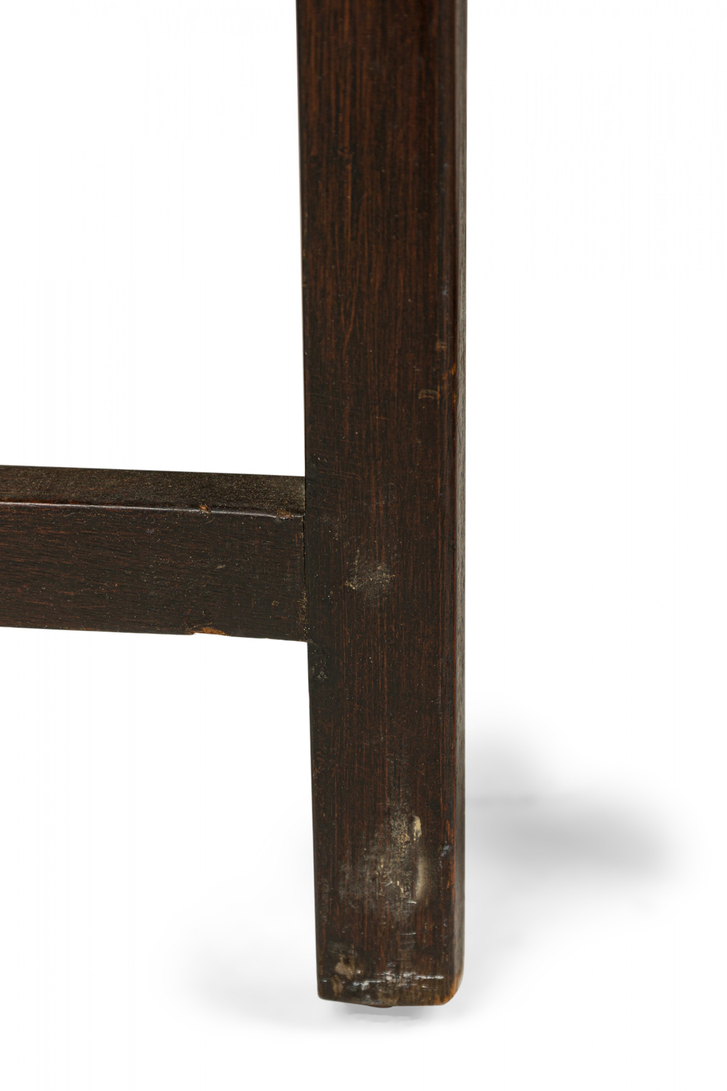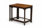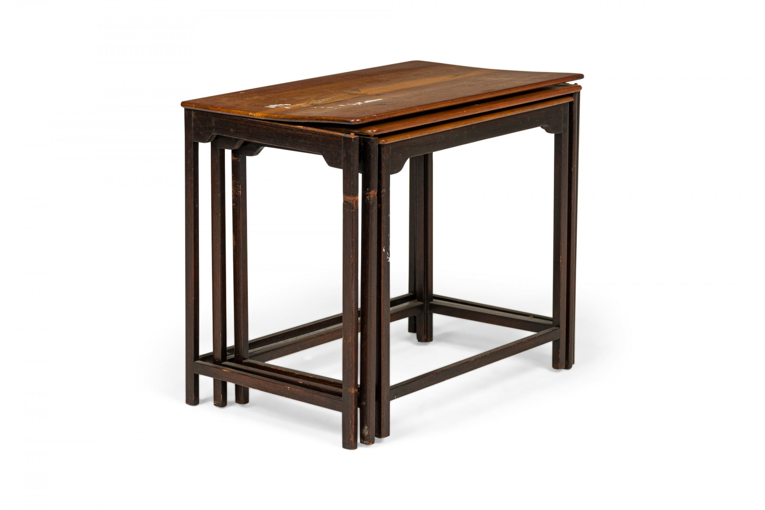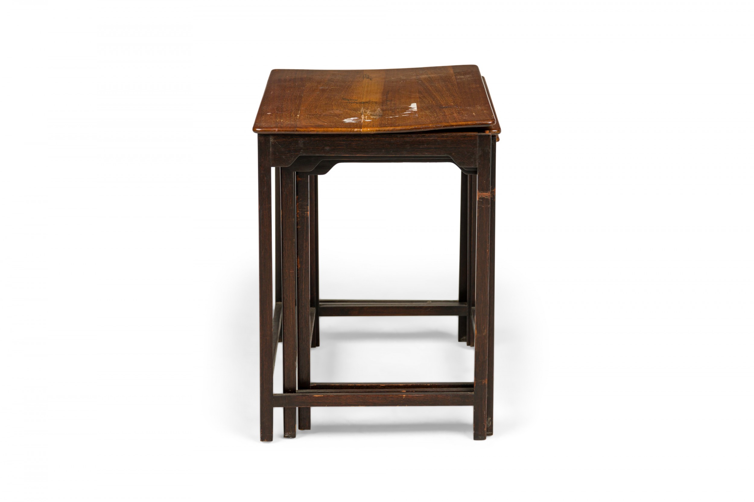 SET of 3 American Mid-Century nesting tables with finished wooden plank tops resting on iron frames. (EDWARD WORMLEY FOR DUNBAR FURNITURE COMPANY)(PRICED AS SET).