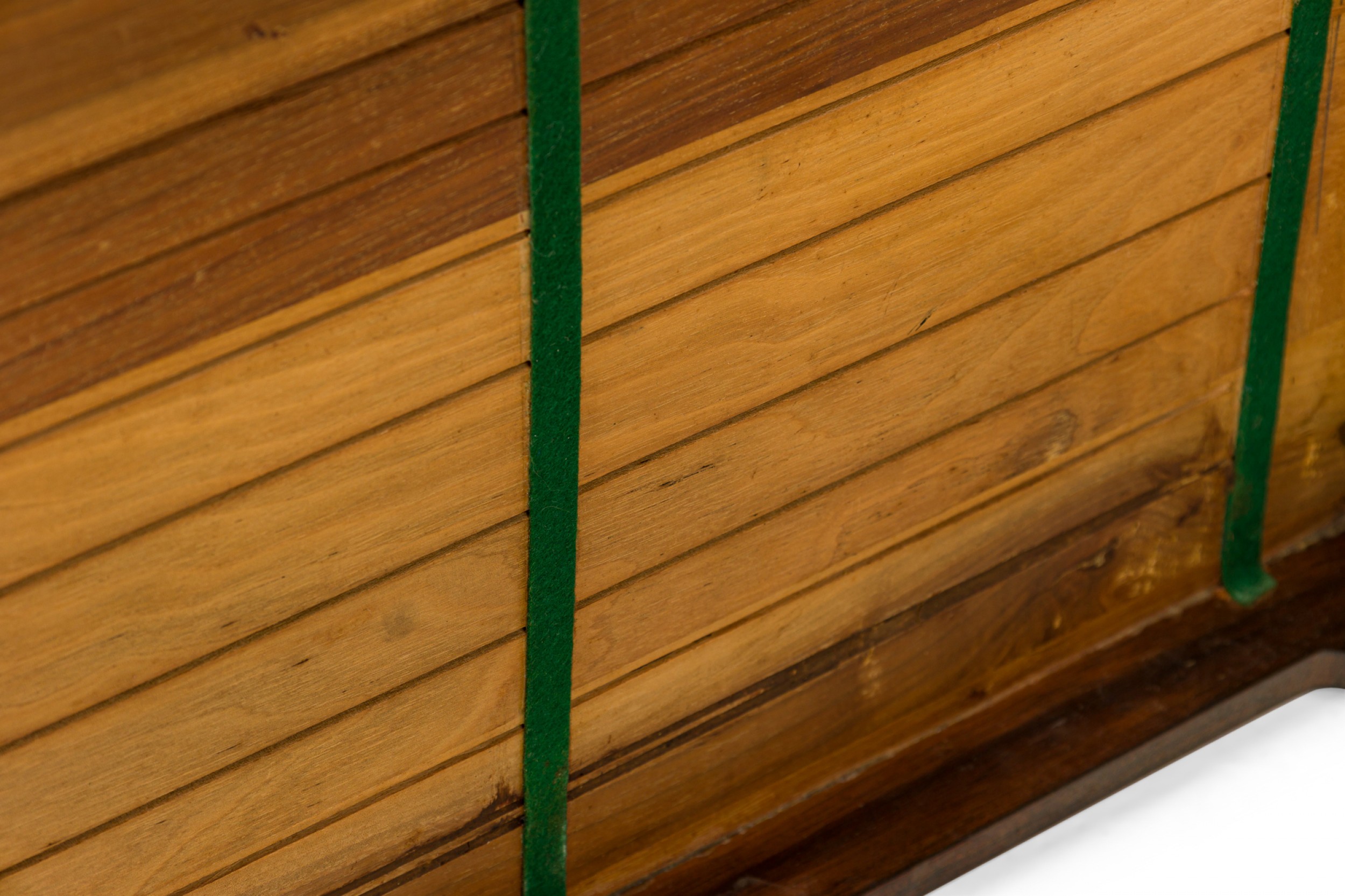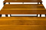SET of 3 American Mid-Century nesting tables with finished wooden plank tops resting on iron frames. (EDWARD WORMLEY FOR DUNBAR FURNITURE COMPANY)(PRICED AS SET)