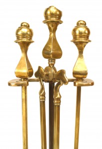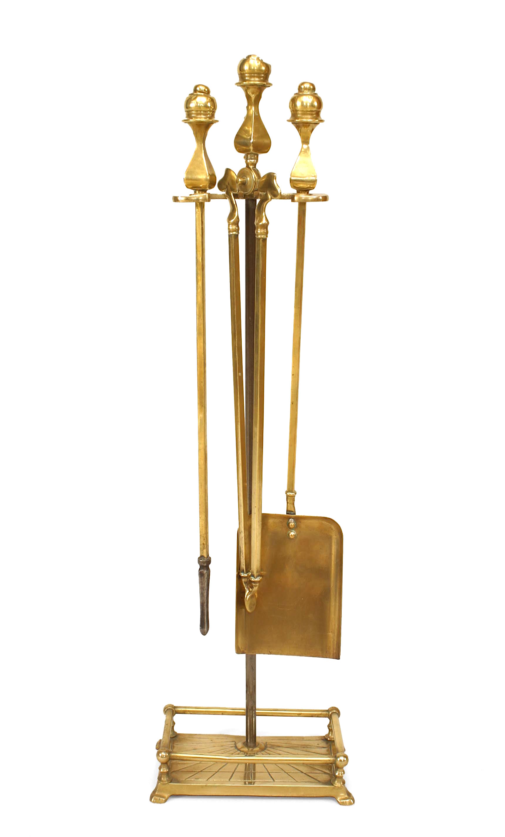 Set of 3 Georgian-style brass fire tools with bell shaped top finials resting in a later stand