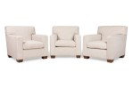 SET of 3 American Contemporary club chairs upholstered in off-white chinille fabric with loose boxed border seat cushion resting on mahogany stained tapered boxed legs (style of JEAN MICHEL FRANK)(PRICED AS SET) (AVAILABLE INDIVIDUALLY).