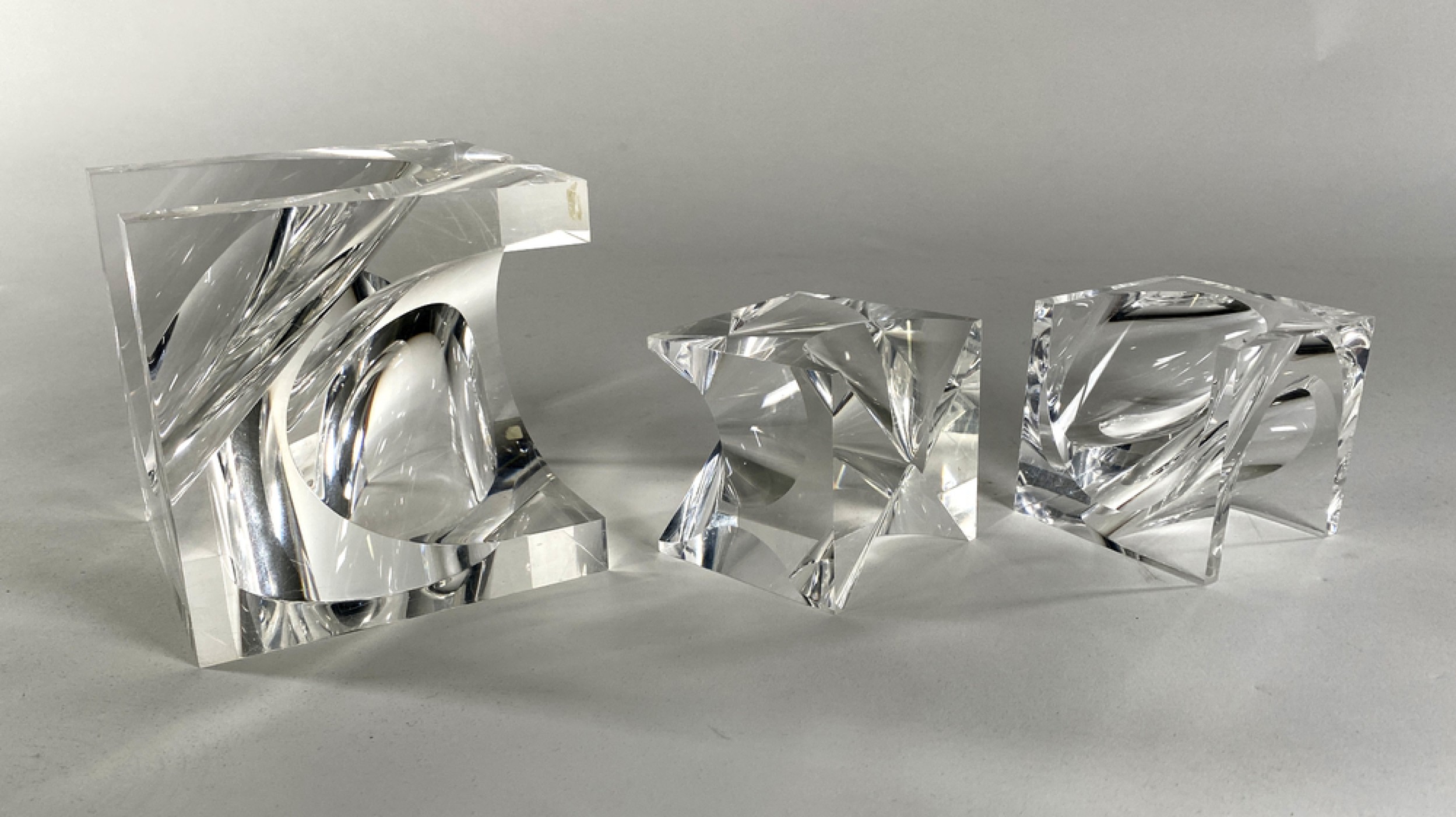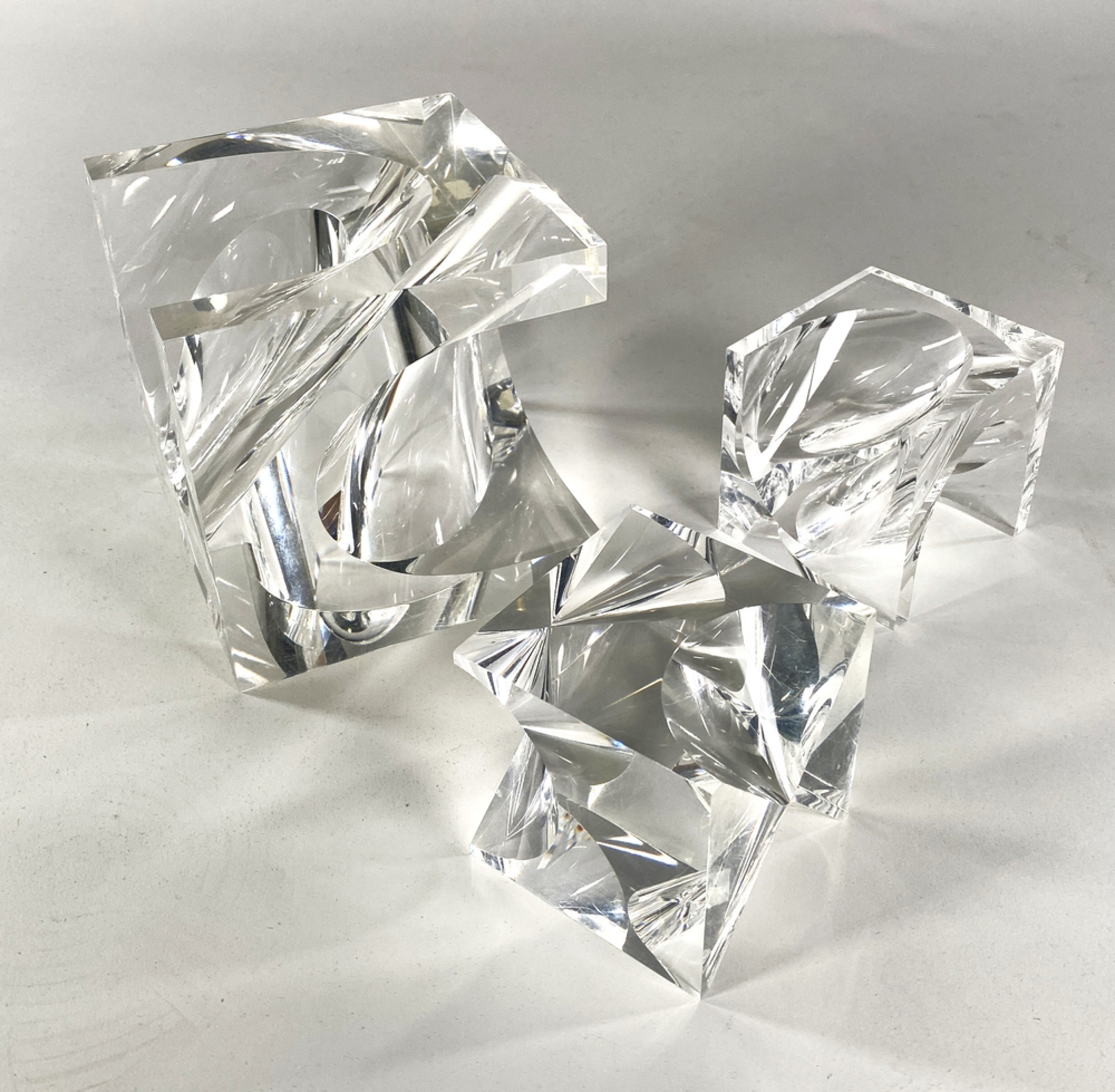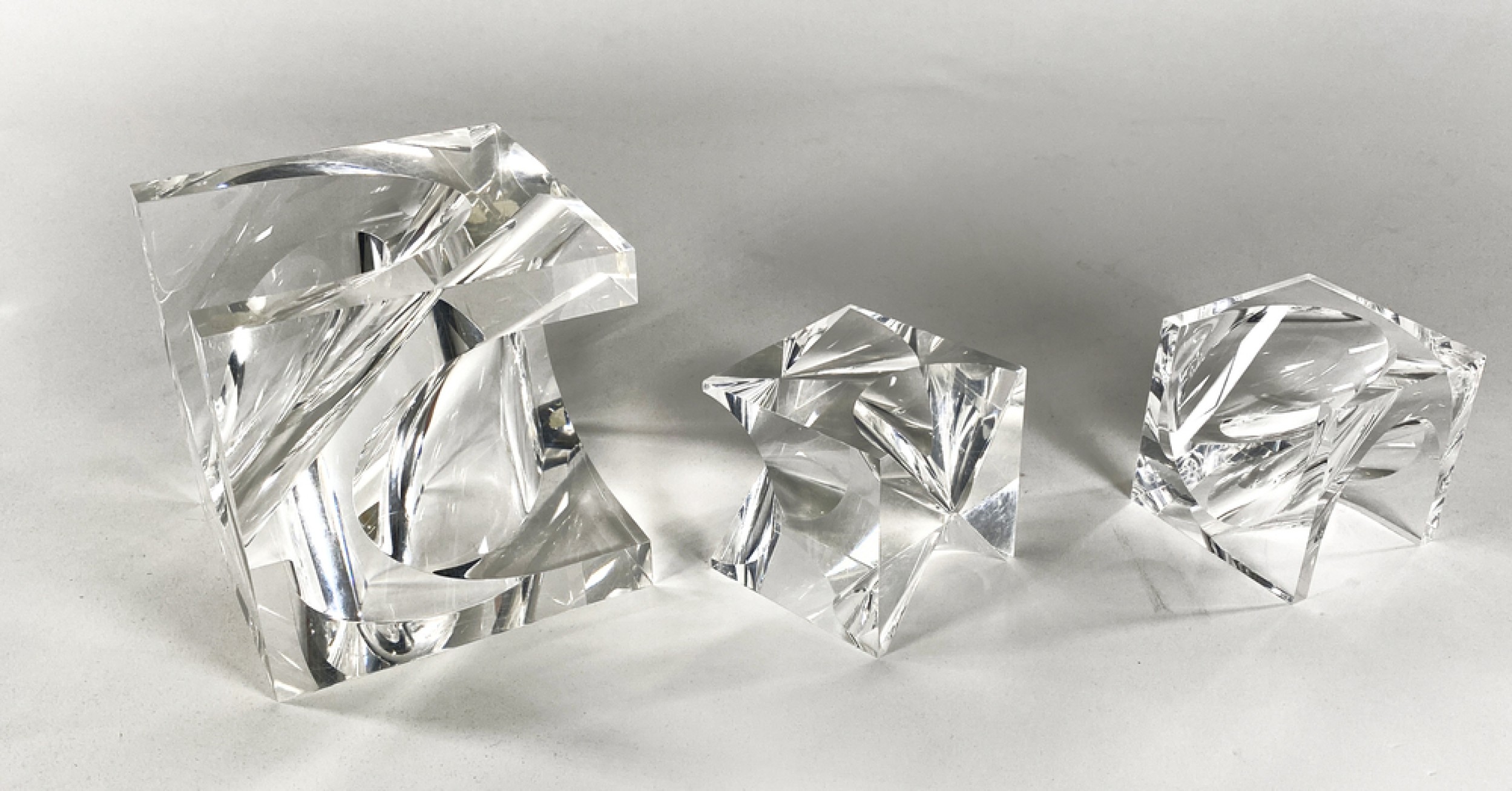 SET of 3 lucite table sculpture of concave cubes (PRICED AS SET) Cube A): 3.25" x 3.25" x 3.25" Cube B): 3.25" x 3.25" x 3.25" Cube C): 5.25" x 5.25" x 5.25".