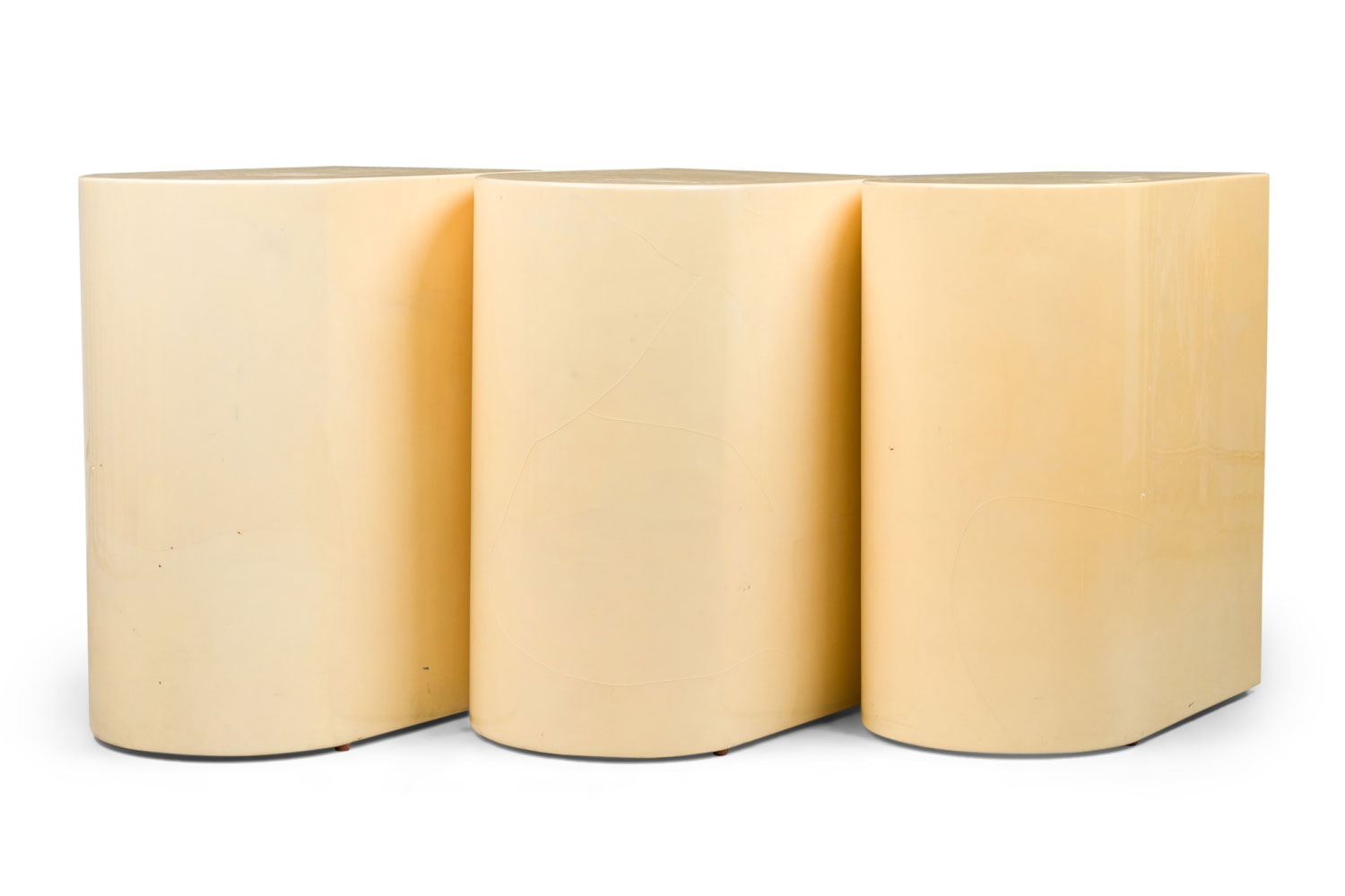 3 Mid-Century American beige goat skin pedestal / end table bases with a rounded front and flat back (PRICED EACH) (KARL SPRINGER) (1 identical in Florida showroom-REG4050A; similar oval model REG4050C)