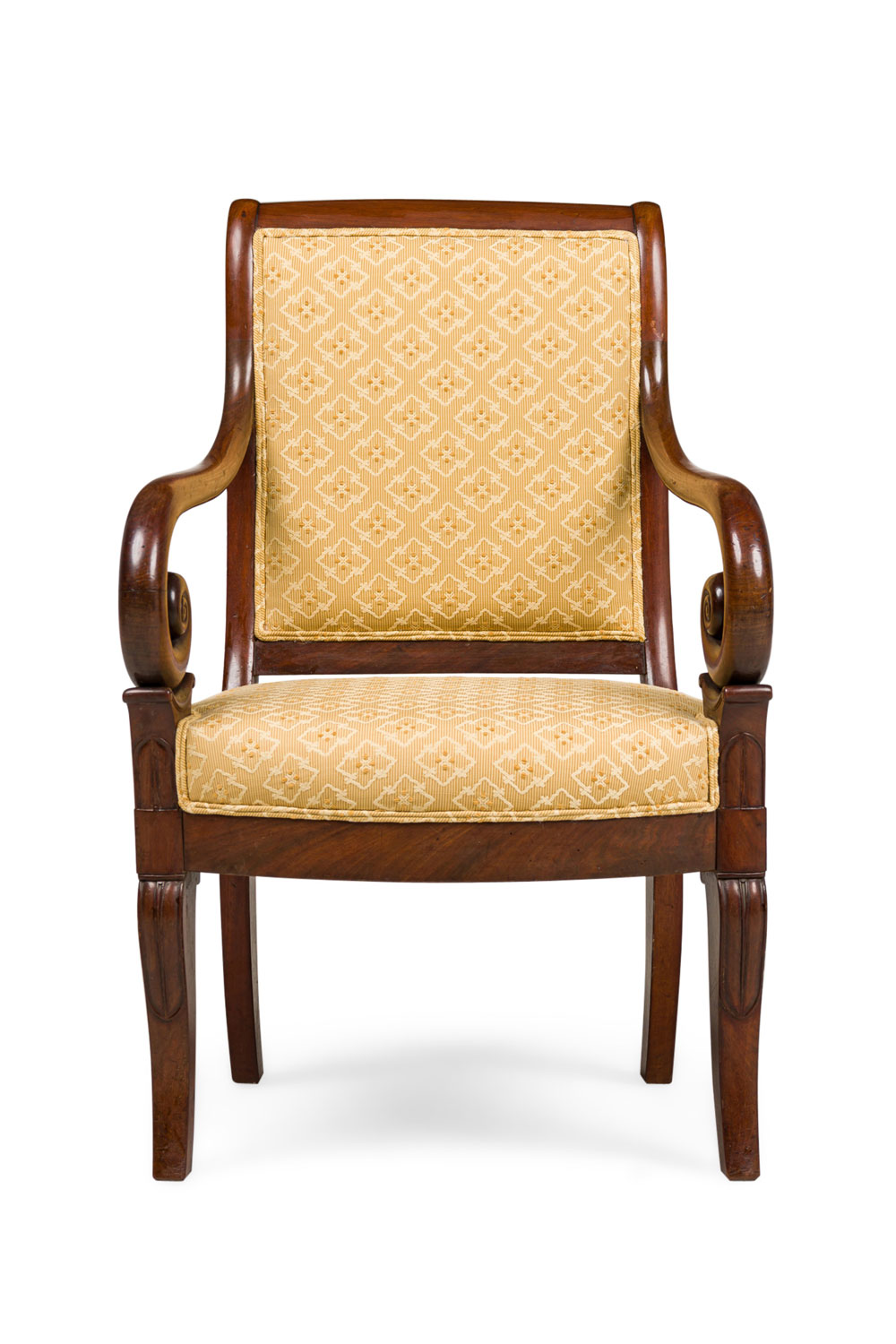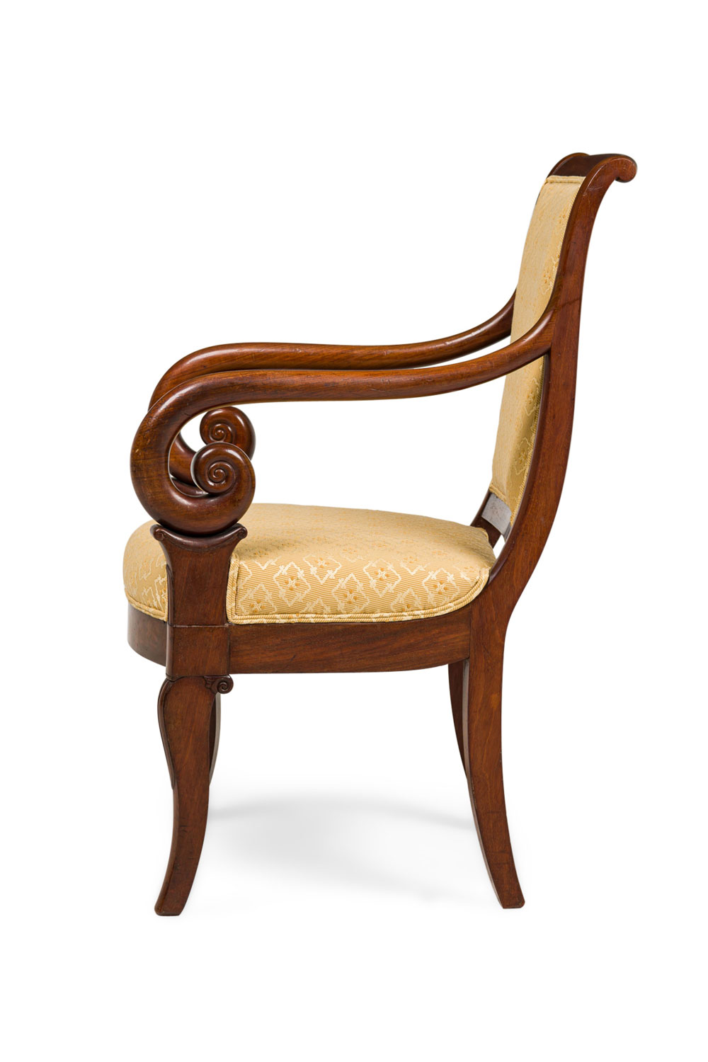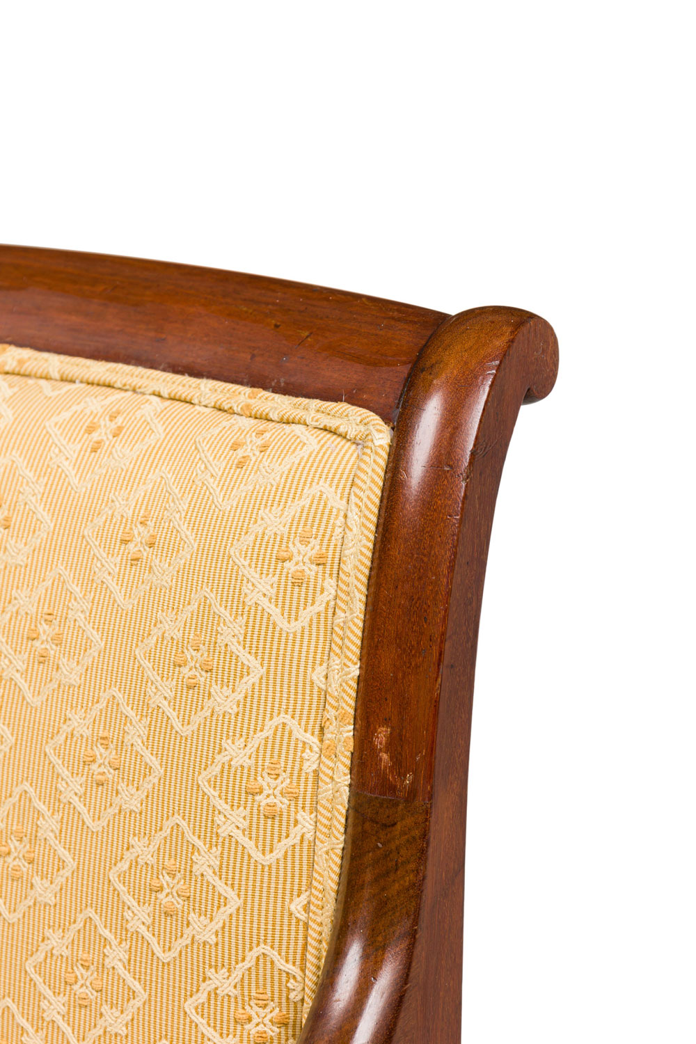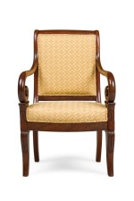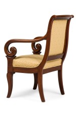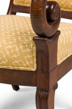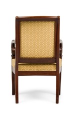SET of 4 French Directoire (19th Century) mahogany armchairs with scroll form arms and gold upholstered seat and back (PRICED AS SET)