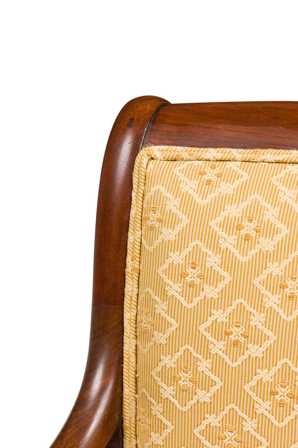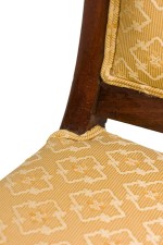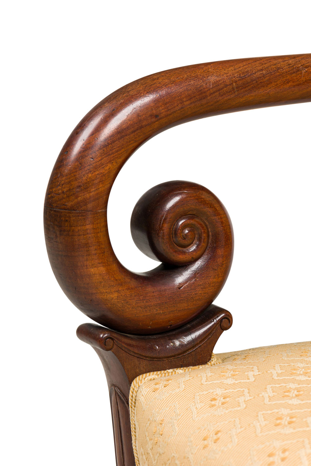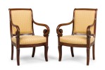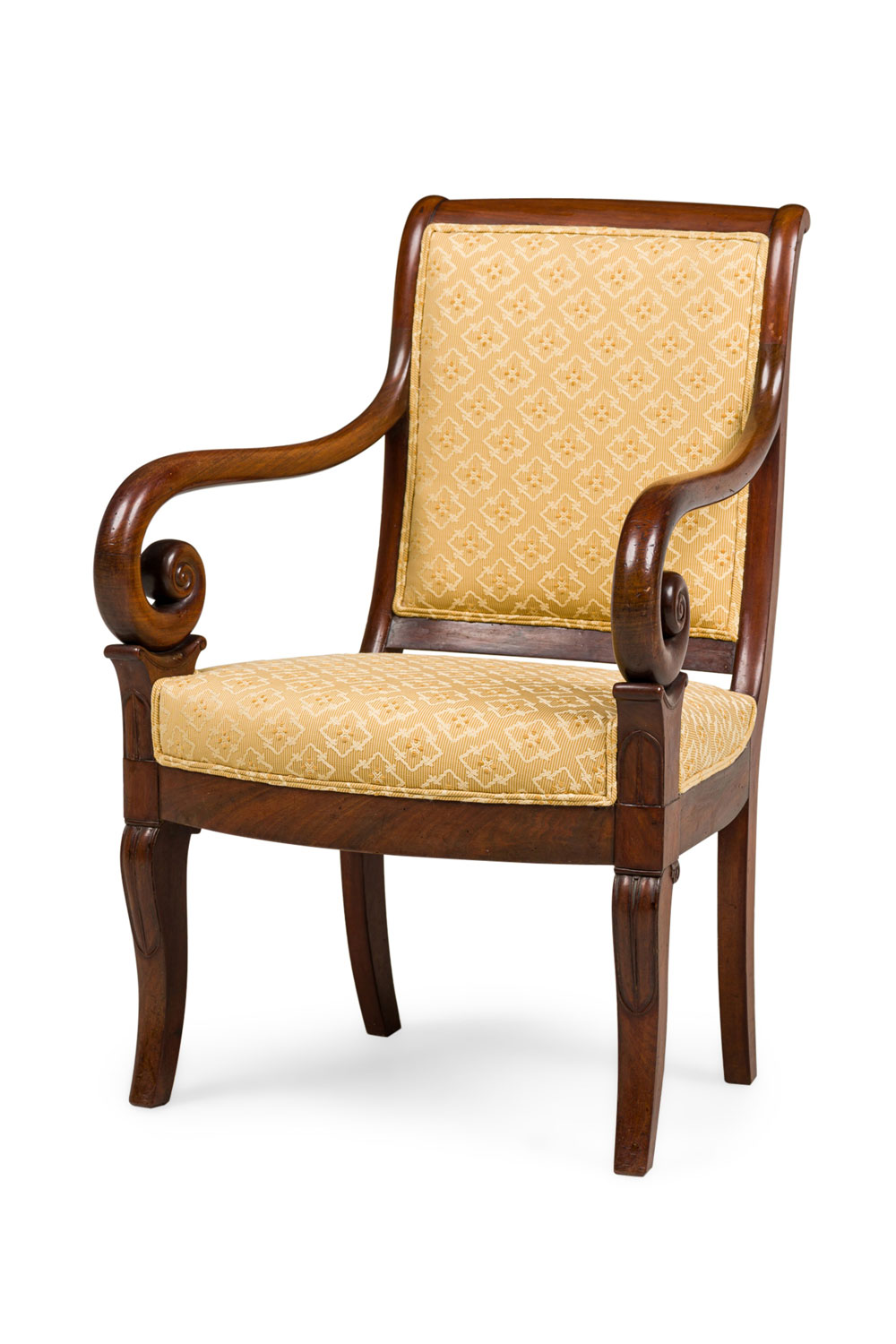 SET of 4 French Directoire (19th Century) mahogany armchairs with scroll form arms and gold upholstered seat and back (PRICED AS SET)