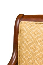 SET of 4 French Directoire (19th Century) mahogany armchairs with scroll form arms and gold upholstered seat and back (PRICED AS SET).