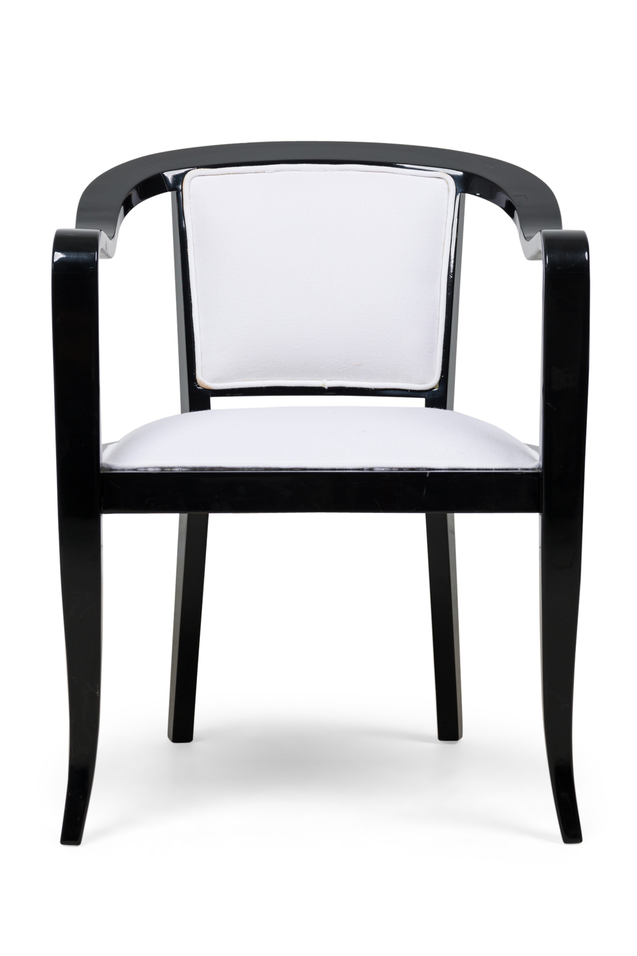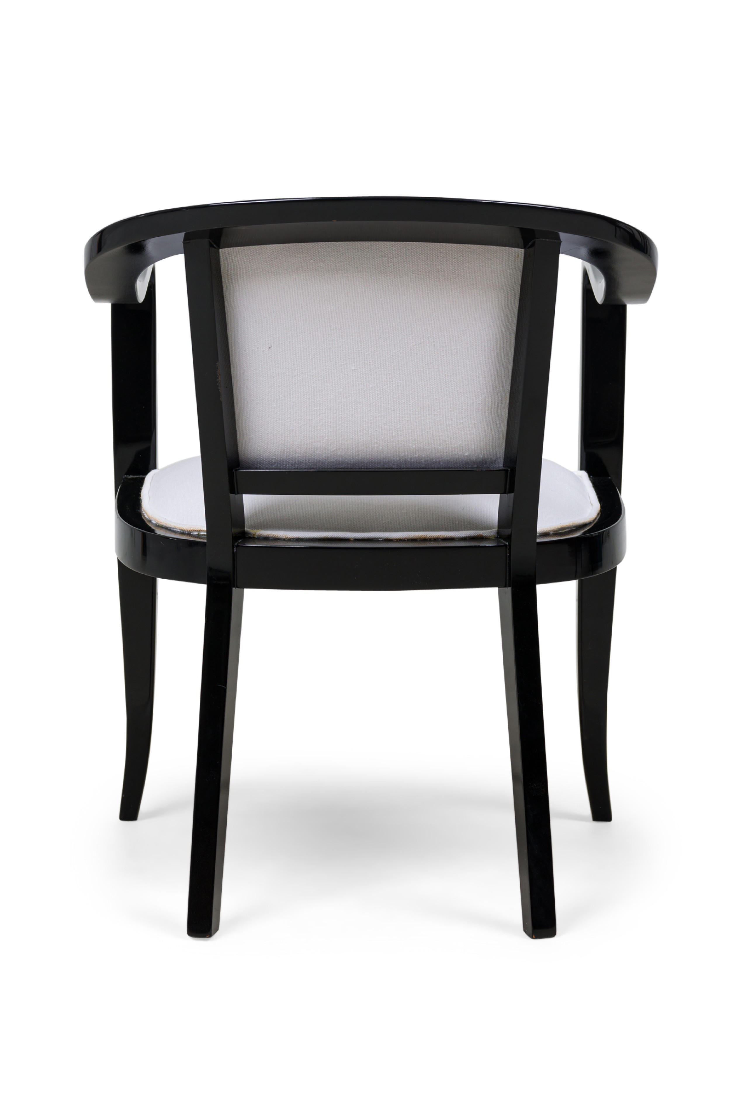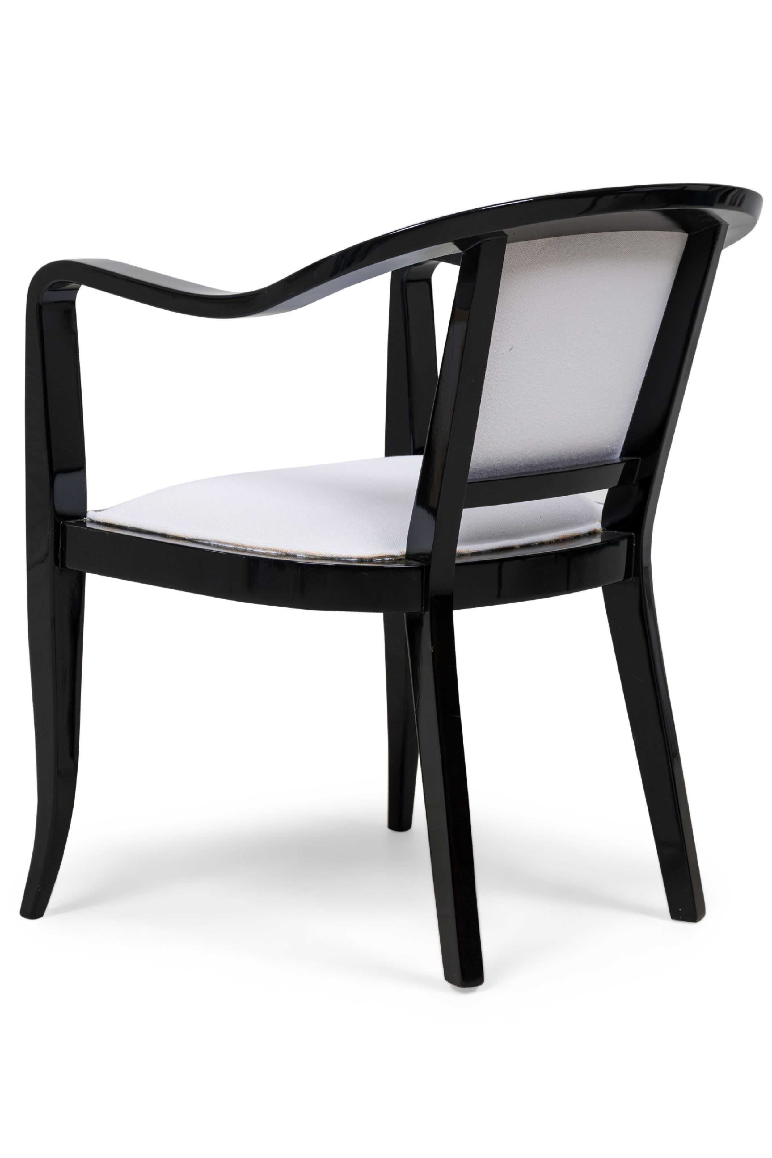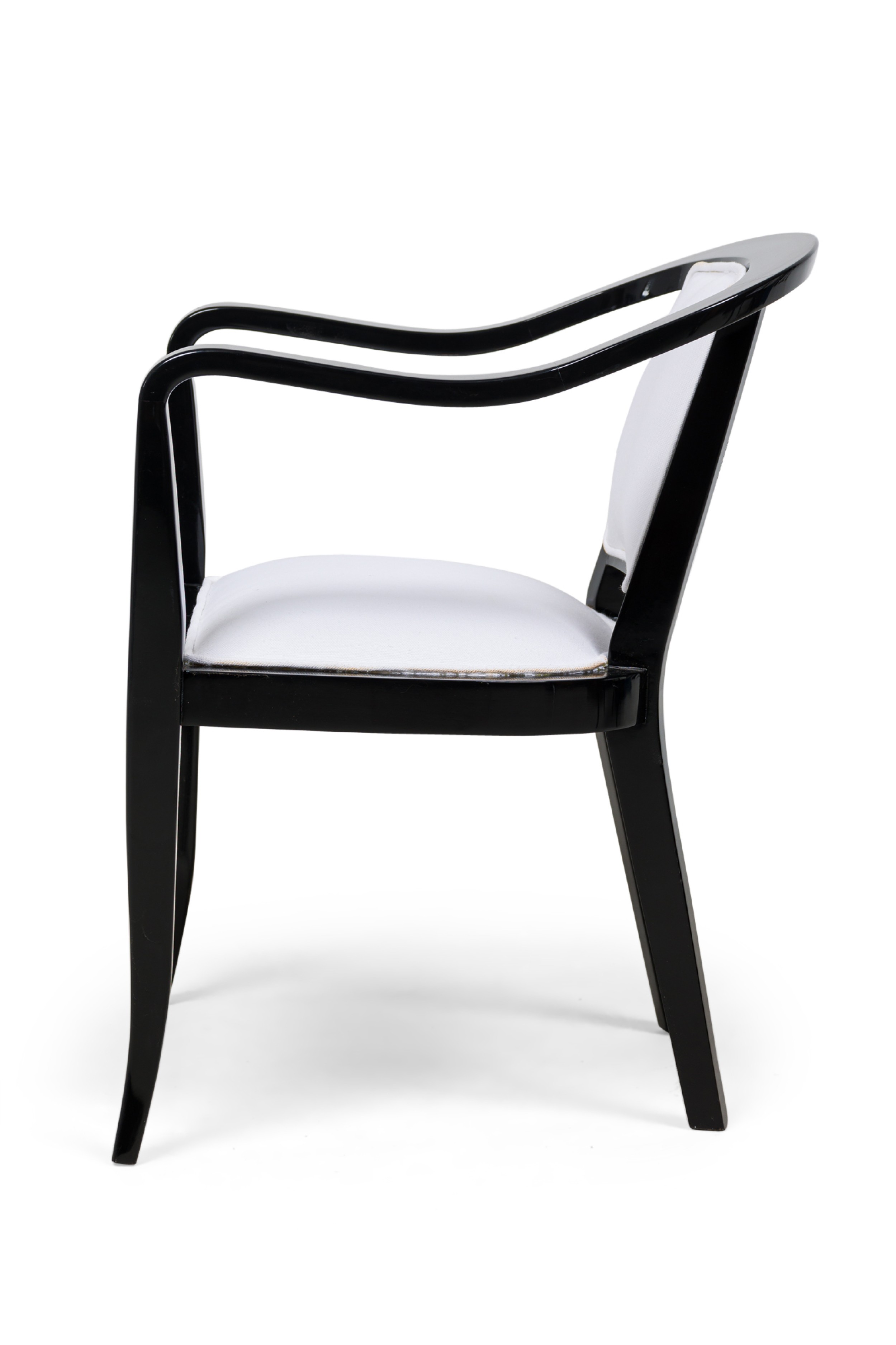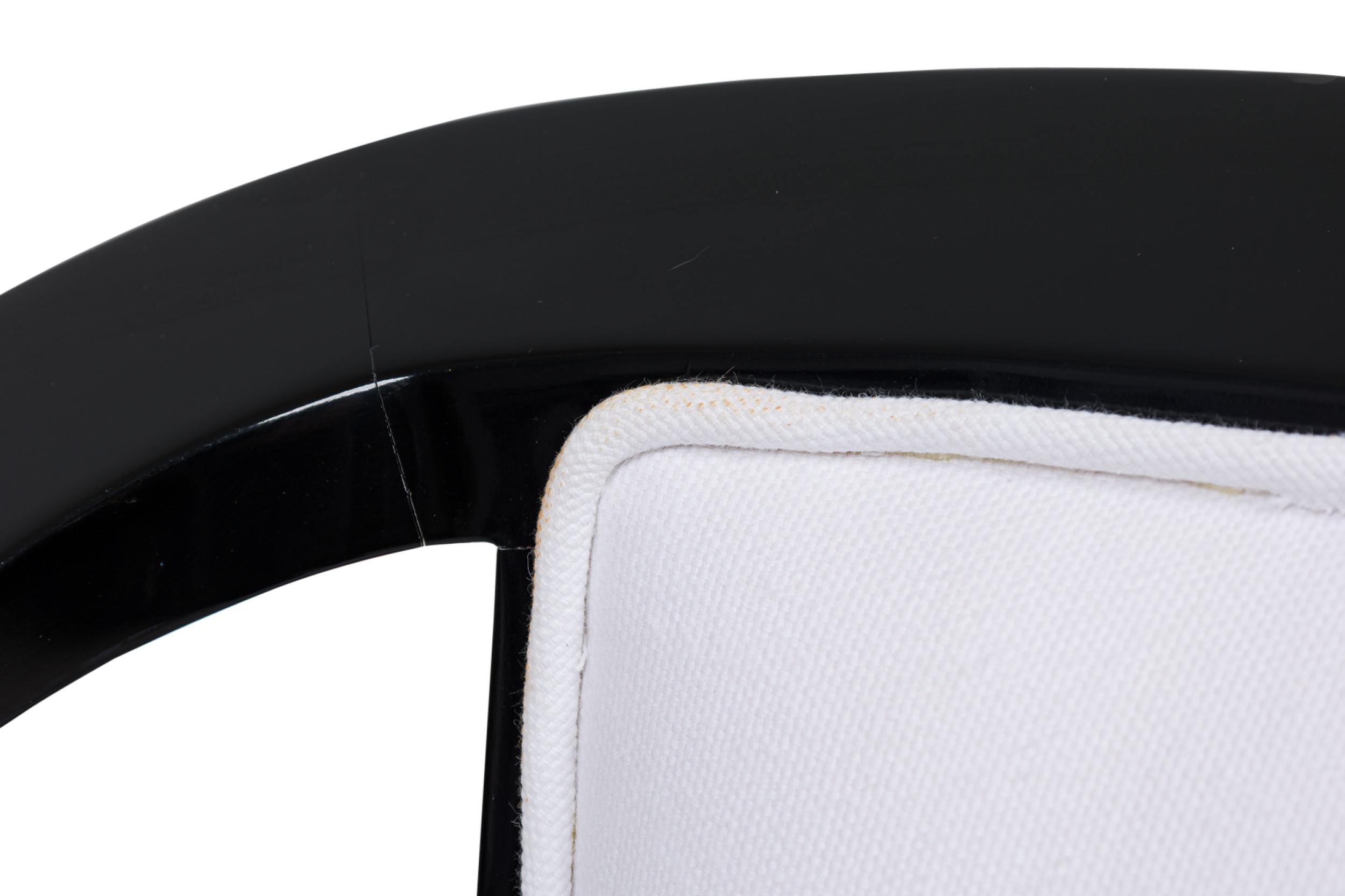 SET of 4 American Mid-Century ebonized wood continuous roundback armchairs with white upholstery (EDWARD WORMLEY for DUNBAR) (PRICED AS SET) (Matching Set of 5-with black and white stripped upholstery: REG4008A) (NOTE: 1 WHITE CHAIR IN FLORIDA under REG4008)