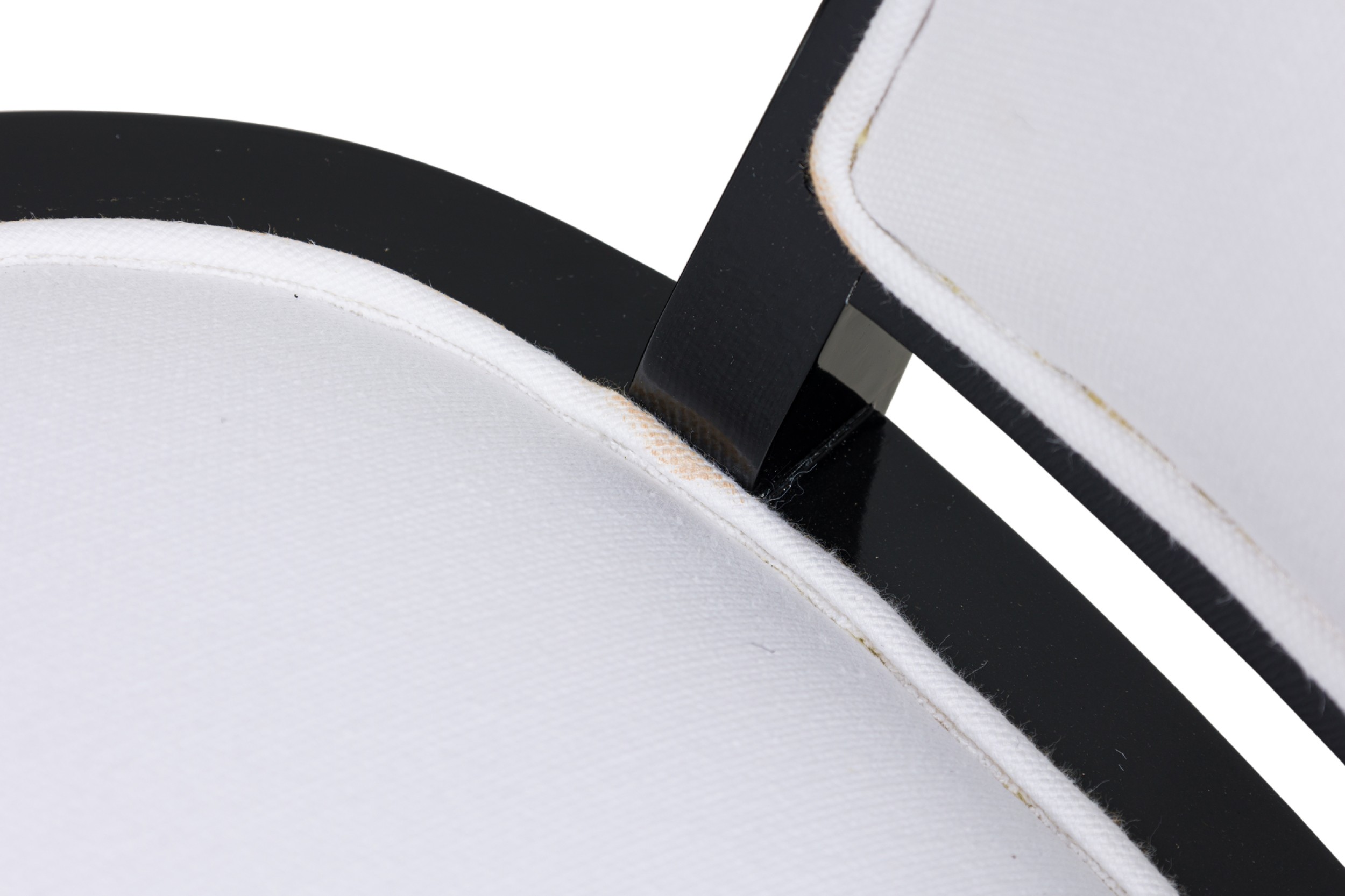 SET of 4 American Mid-Century ebonized wood continuous roundback armchairs with white upholstery (EDWARD WORMLEY for DUNBAR) (PRICED AS SET) (Matching Set of 5-with black and white stripped upholstery: REG4008A) (NOTE: 1 WHITE CHAIR IN FLORIDA under REG4008).