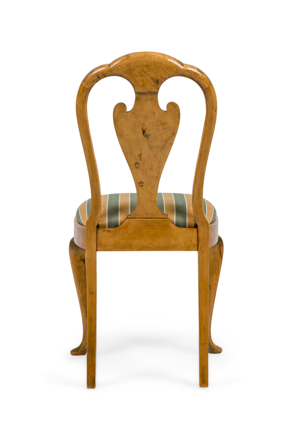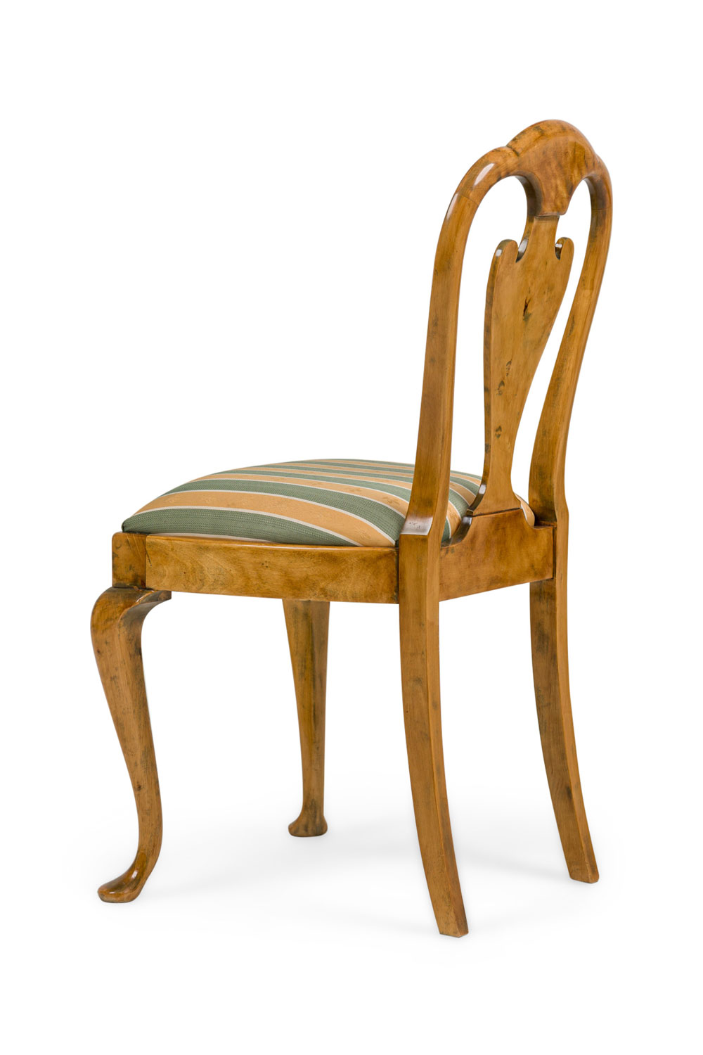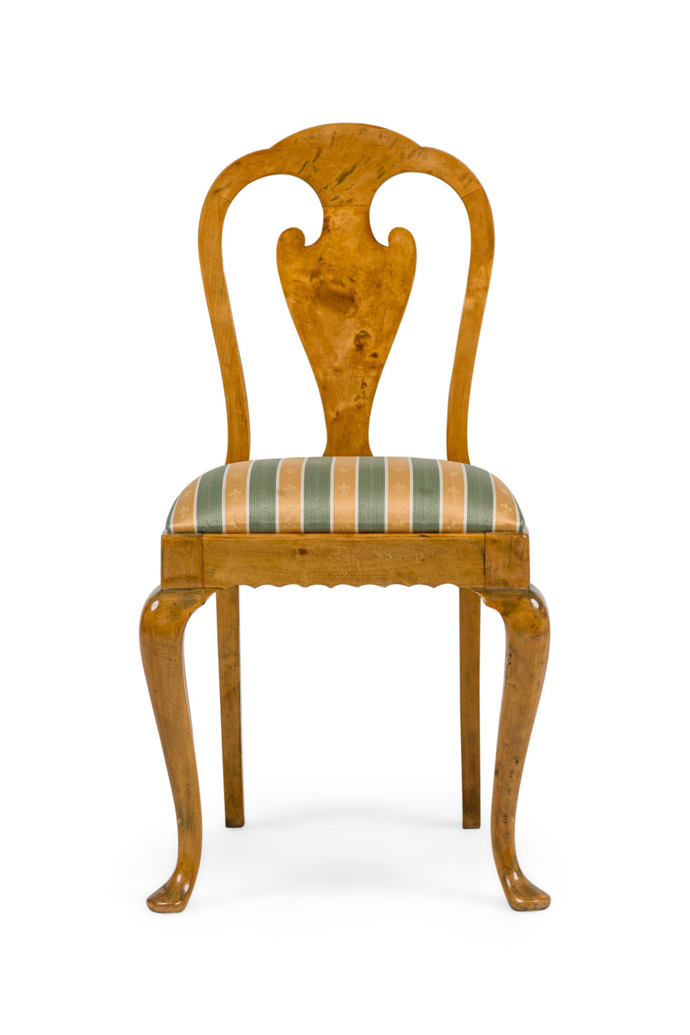 SET of 4 English Queen Anne style (20th Century) side chairs with a green and cream vertical stripped upholstered slipseat cushion with an open splat form back (PRICED AS SET)