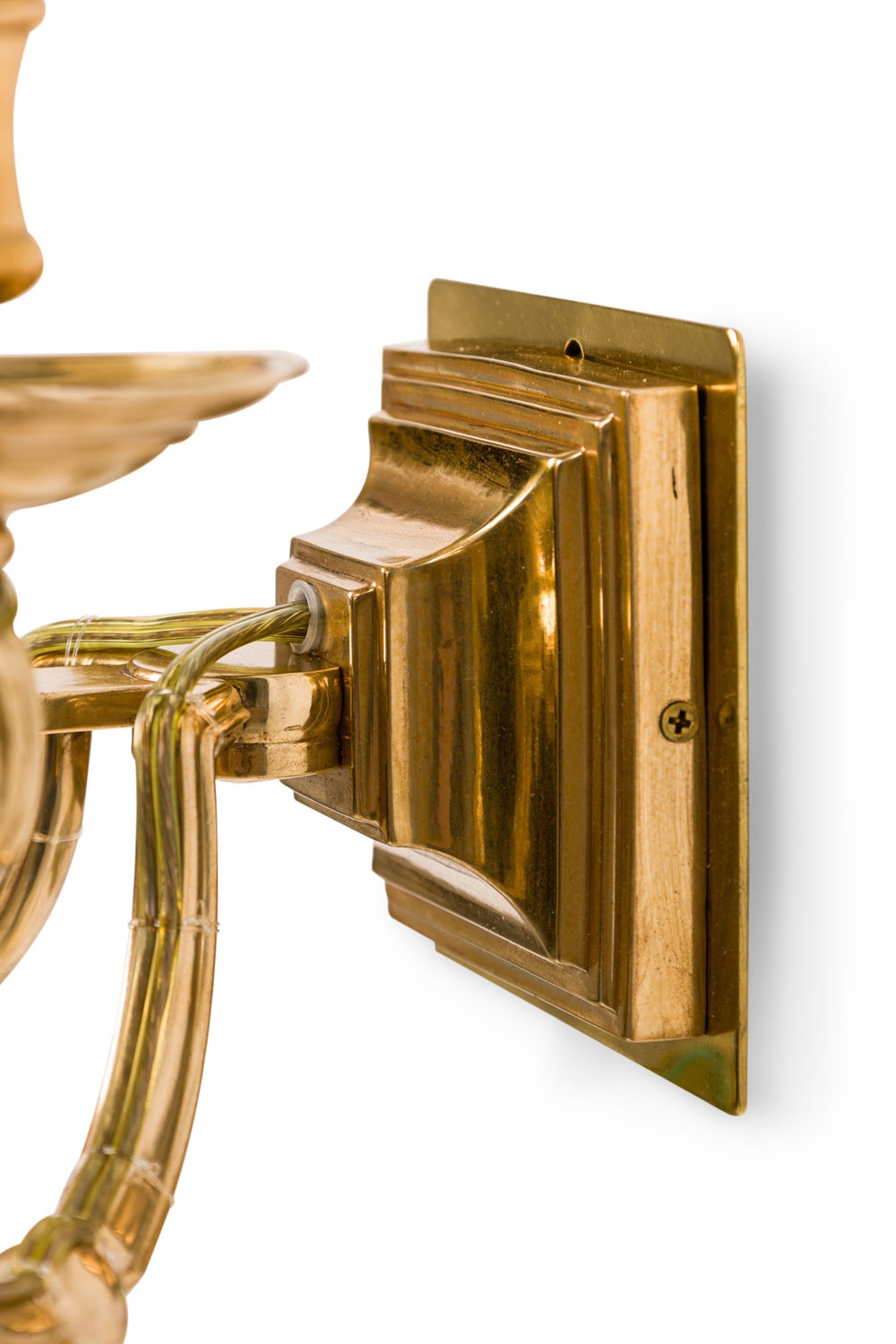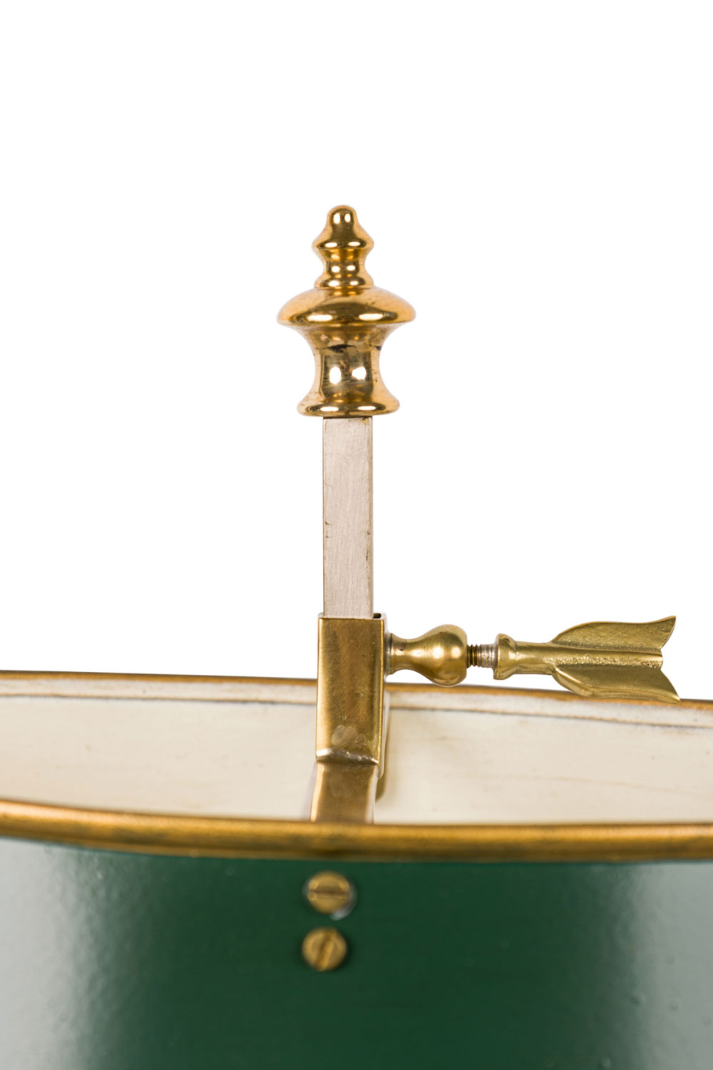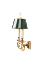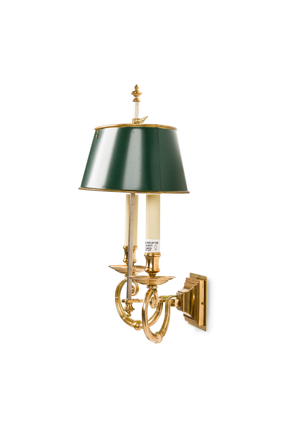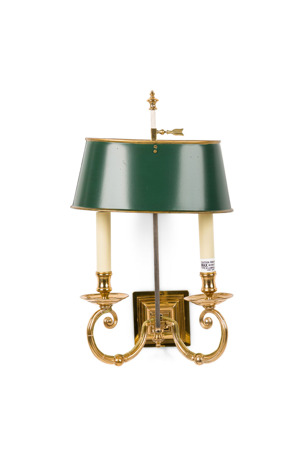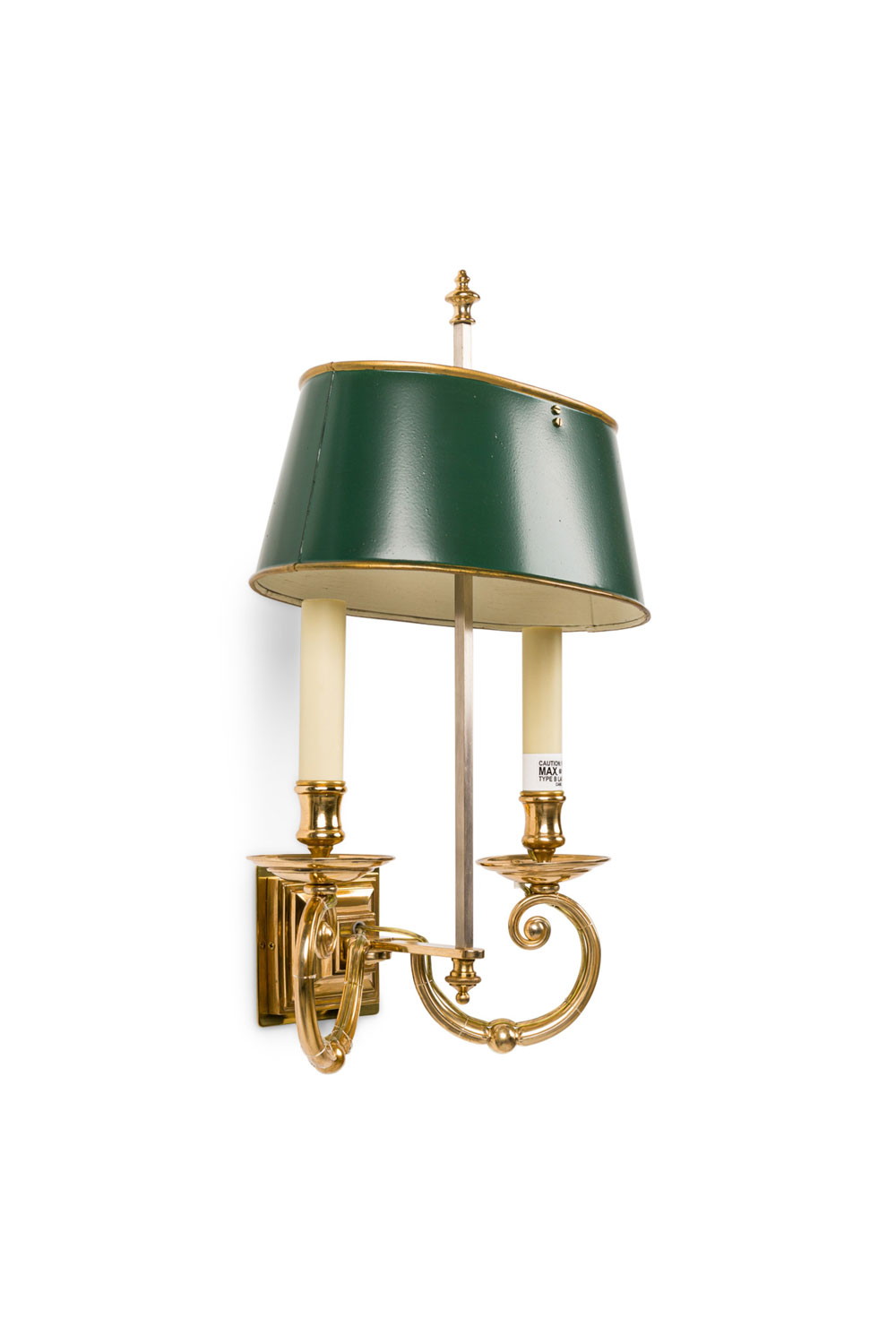 4 French bouillotte style wall sconces with 2 brass plated curved arms and green tole oval shade (M. ALEXANDER) (PRICED PER PAIR)