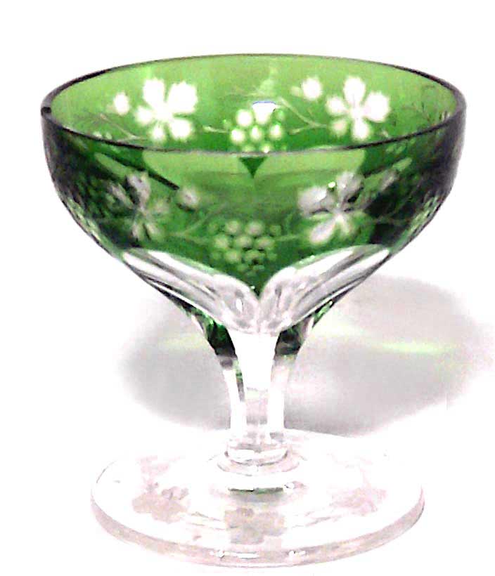 Set of 4 French Victorian green and clear crystal liquor glasses with etched floral design (PRICED AS SET).